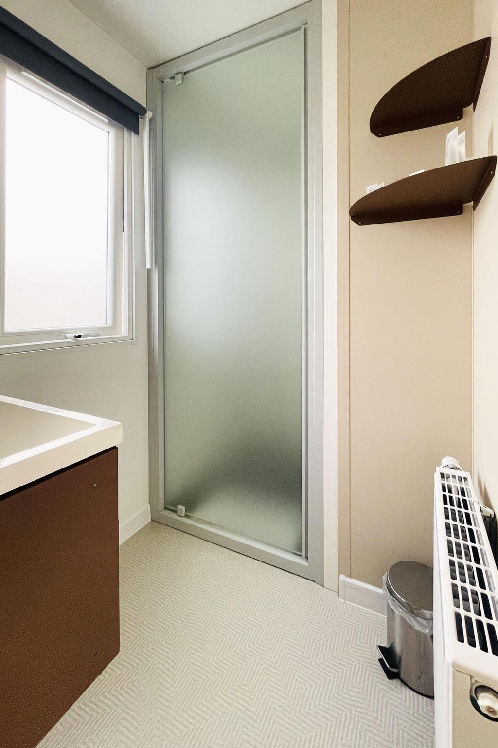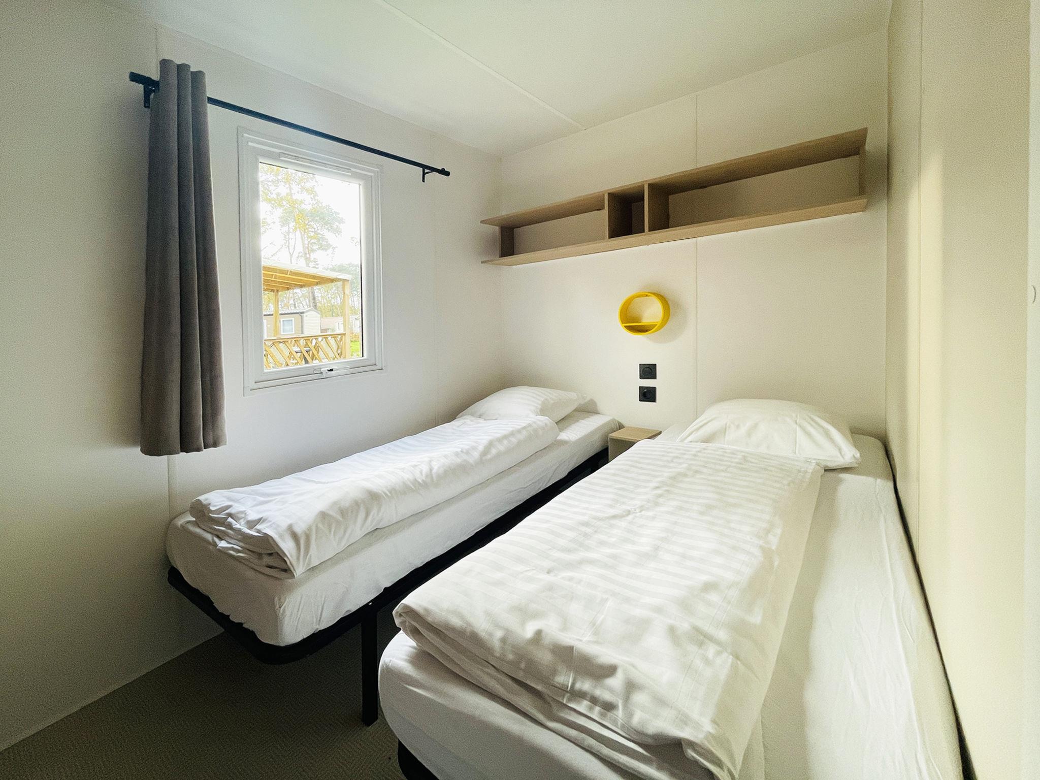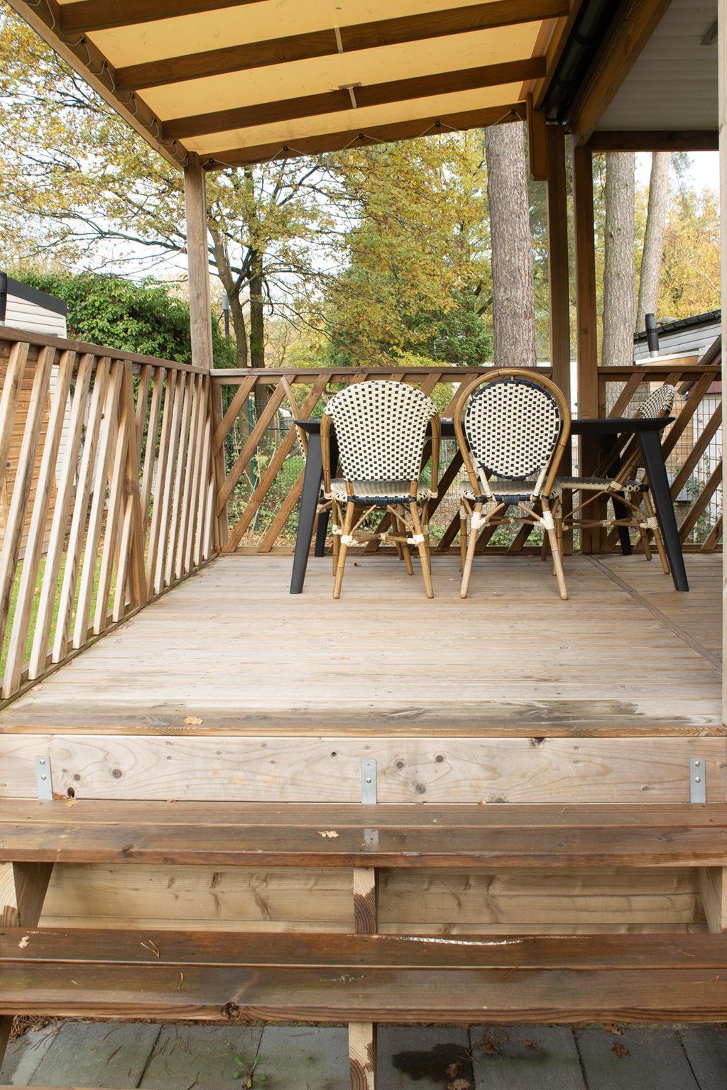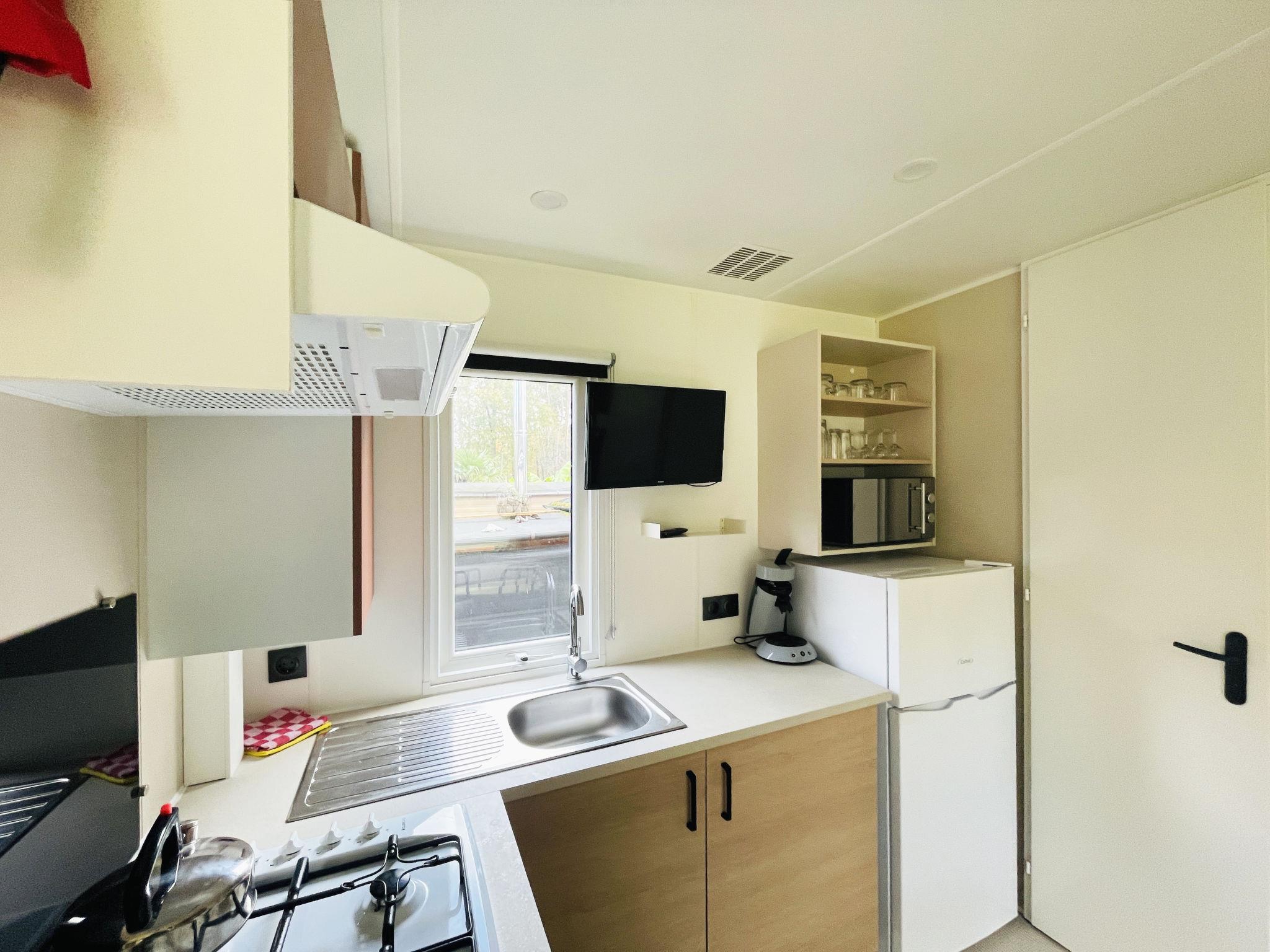 "4 persoons", 2-room mobile home 30 m2. Practical furnishings: entrance hall with separate WC. 1 double bedroom with 1 double bed. 1 double bedroom with 2 beds. Open kitchen (4 gas rings, kettle, microwave, electric coffee machine) with dining nook and TV. Exit to the terrace. Shower. Heating. Terrace. Terrace furniture. Facilities: Internet (WiFi, free). Parking (1 car) at the house. Please note: non-smoking house. Smoke alarm.
