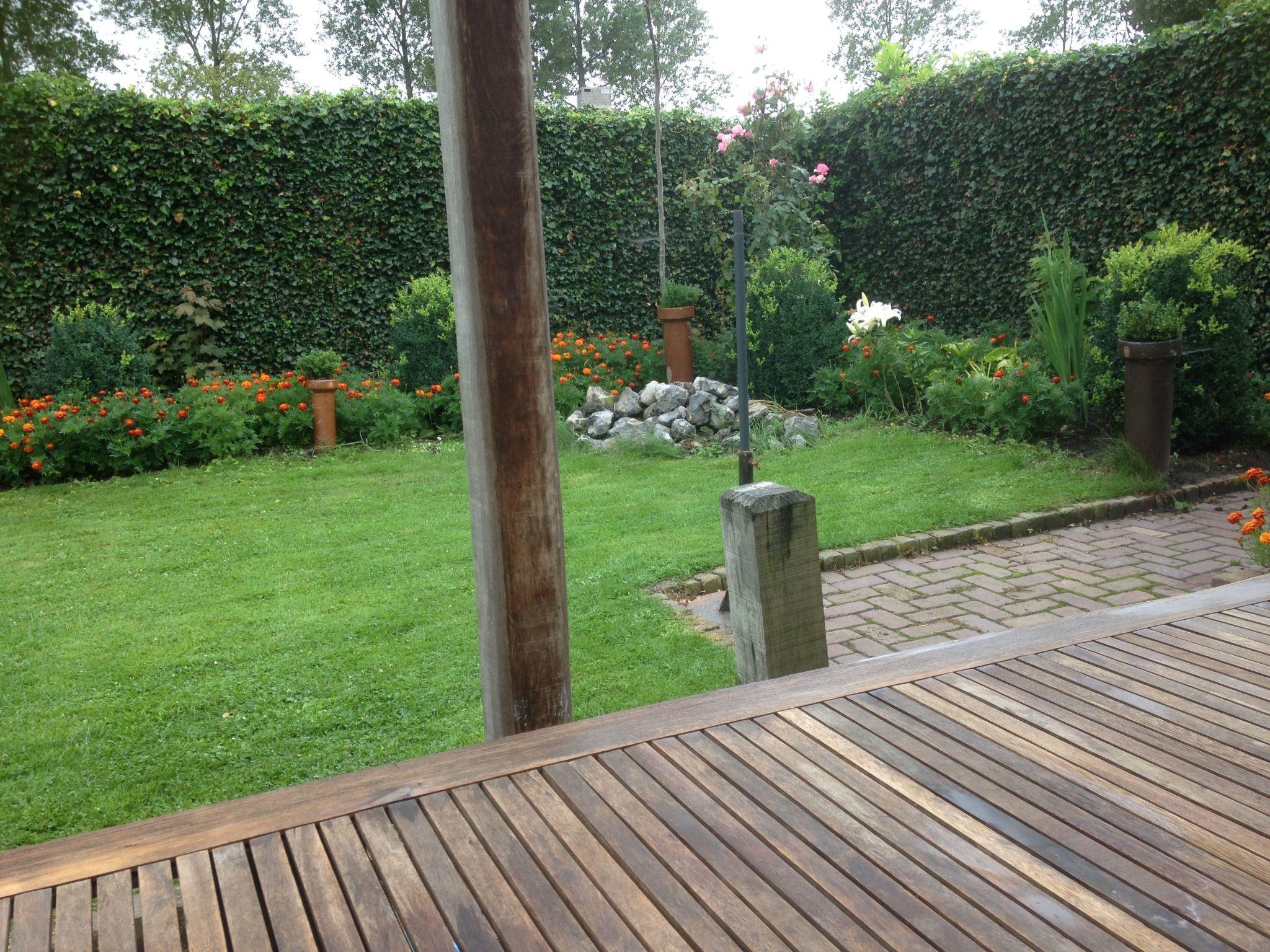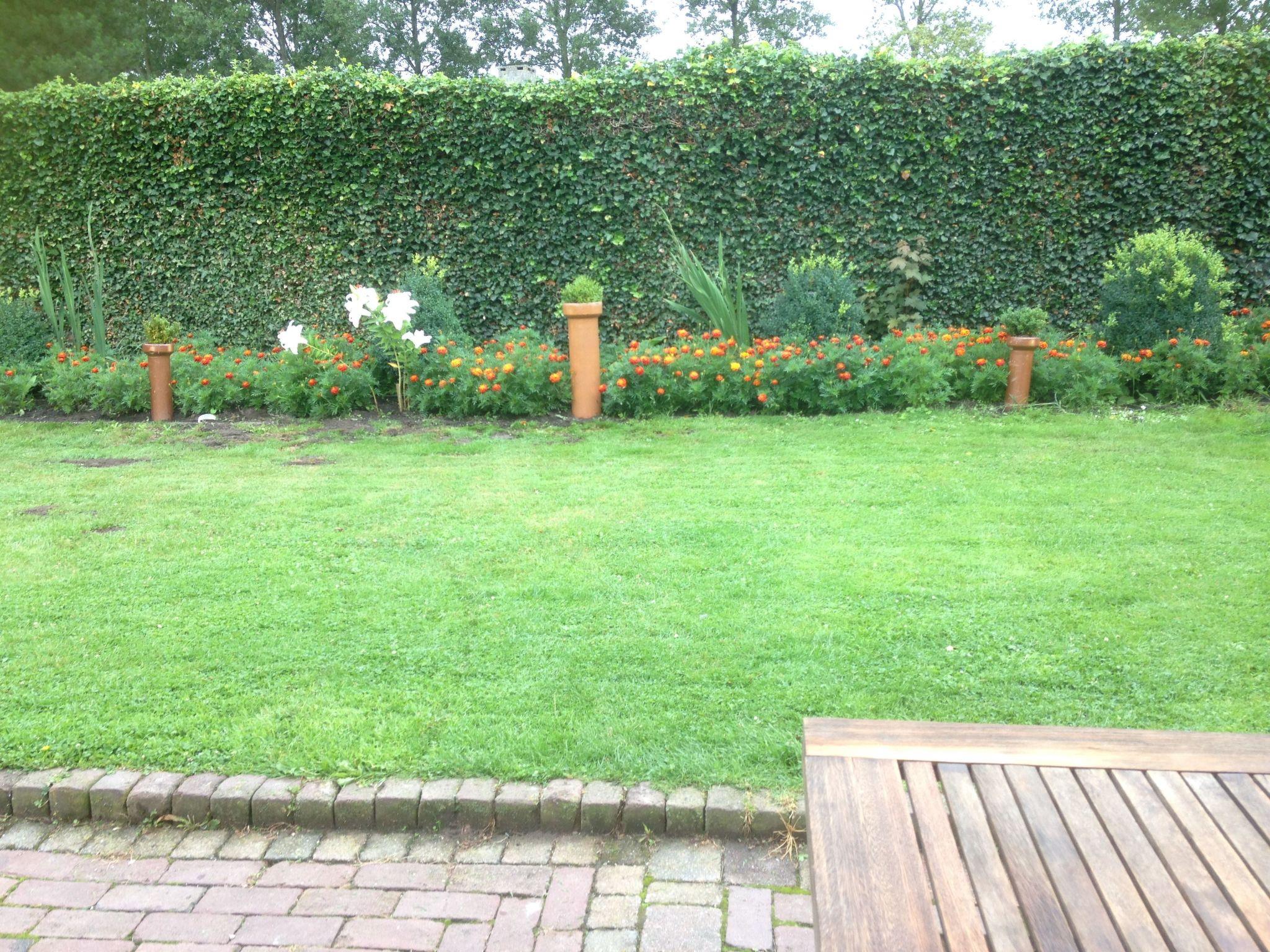 The house has a large garden, offering privacy. It is furnished with outdoor furniture. The property is enclosed.