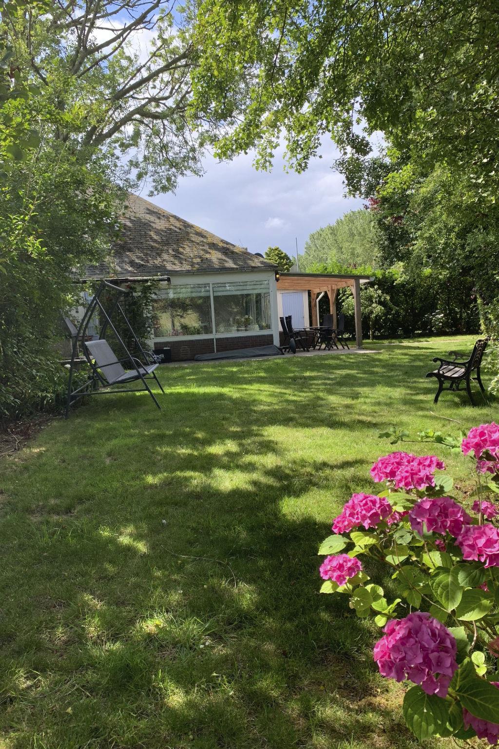 In the garden you will find a lovely lounge set under a terrace roof so you can sit outside for a long time in the evening. There is also a dining table with chairs and a parasol available.