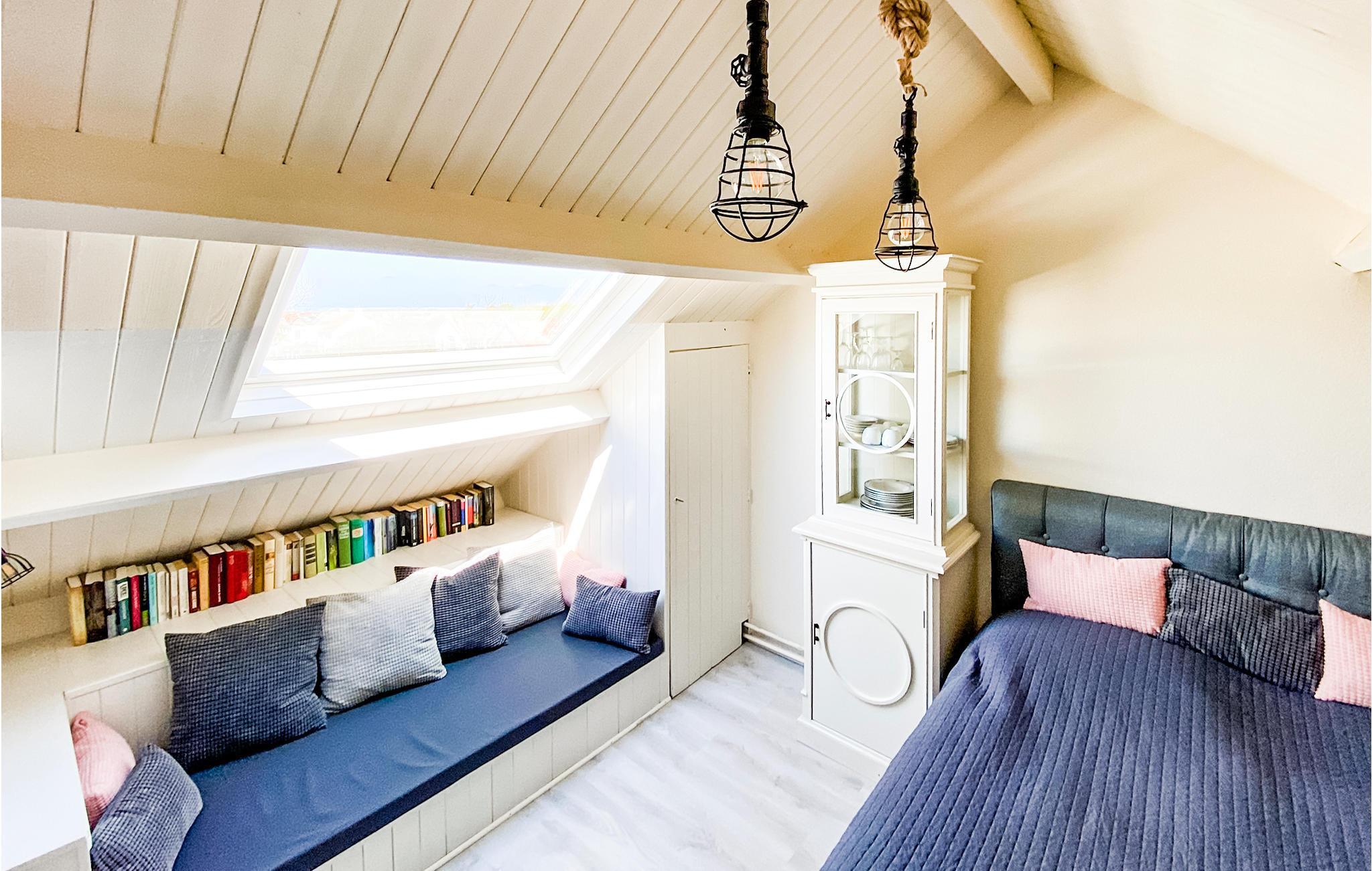 Lägenheten är fördelad på första och andra våningen och är den perfekta platsen för en liten familj som vill uppleva en bekymmersfri semester nära havet. Dessa våningar är tillgängliga via trappor, varav trapporna till andra våningen är ganska branta. Boendet är uppdelat i ett sovrum med dubbelsäng, ett badrum, ett kök och ett vardagsrum med ytterligare två sovplatser. Koppla av här efter en lång semesterdag framför tv:n och med en kopp te.