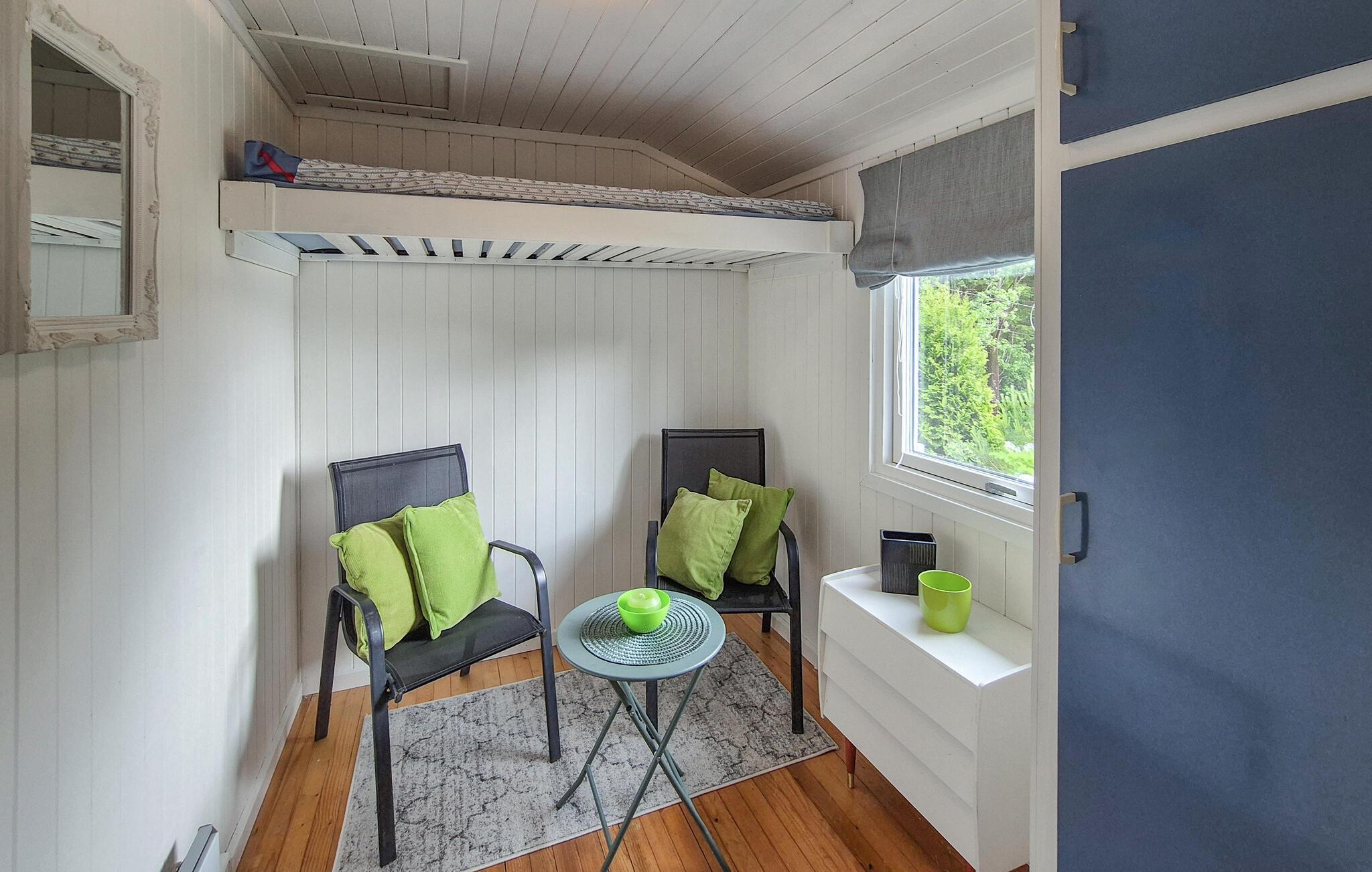 En varm och mysig atmosfär väntar dig inne i huset. Vardagsrummet med panoramafönster och ljus träpanel inbjuder till att dröja sig kvar. Gör dig bekväm i soffan och njut av utsikten över det omgivande landskapet. På svalare kvällar ger den vedeldade kaminen mysig värme. Trädgården, som är utrustad med flera sittplatser och en eldstad, erbjuder variation. Här kan du njuta av naturen till fullo eller avrunda dagen med en lägereld.