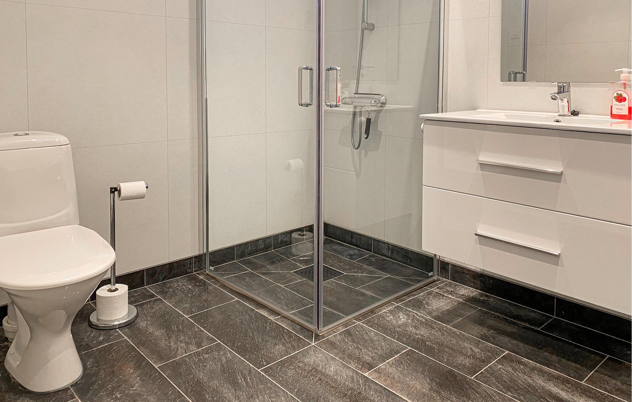 Badrum (nr. 1) - WC: Varmt och kallt vatten. Dusch