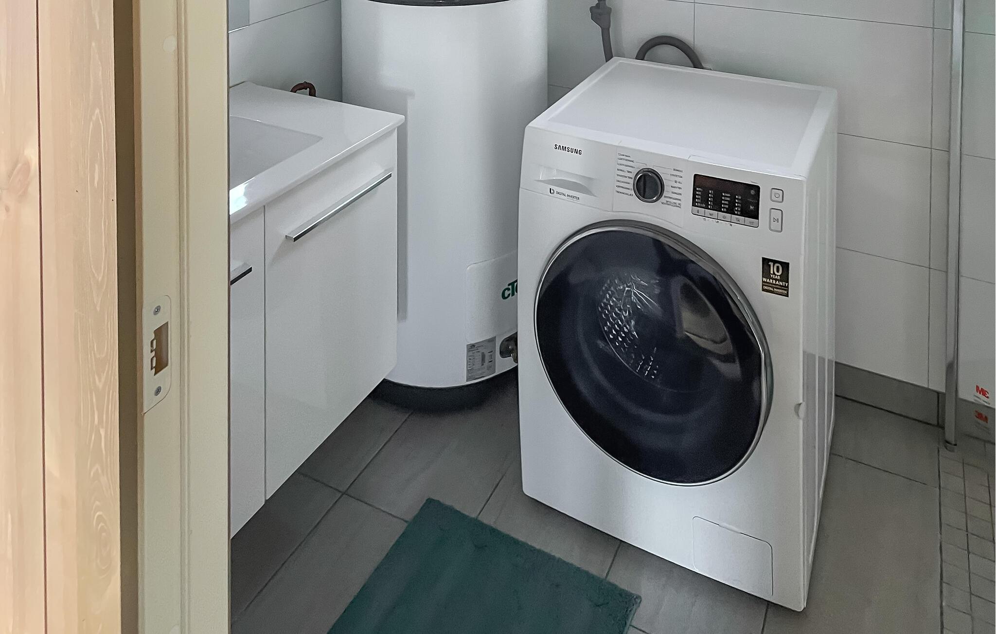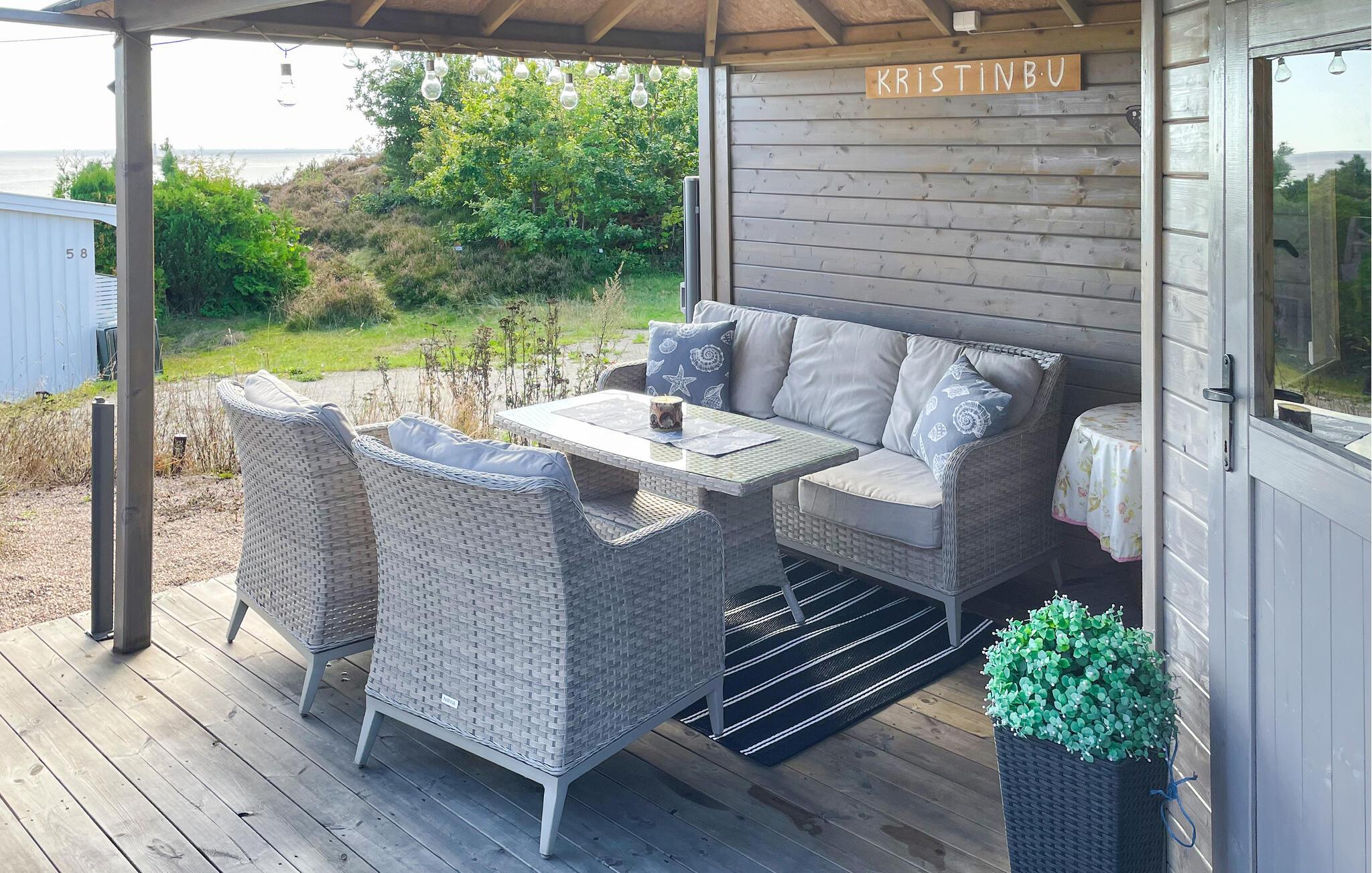Koppla av på den skyddade terrassen när som helst och njut av den friska luften. Den rymliga sittgruppen inbjuder till att avnjuta en måltid tillsammans eller ett glas vin på kvällen. Även under svalare dagar är detta utrymme en mysig tillflyktsort där du kan kombinera närheten till naturen med komforten i ett vardagsrum.