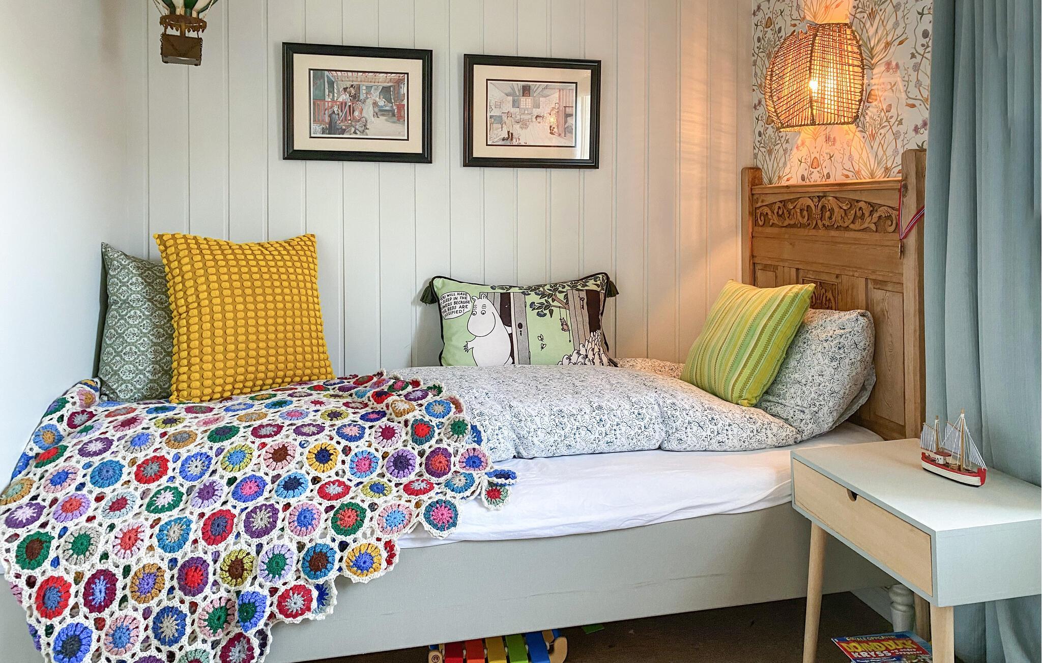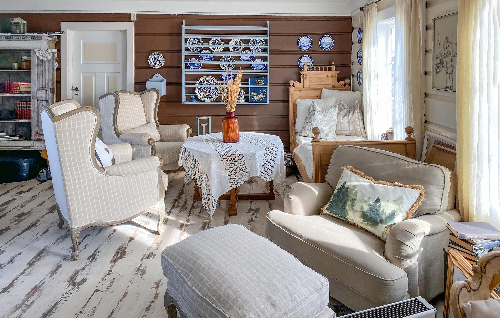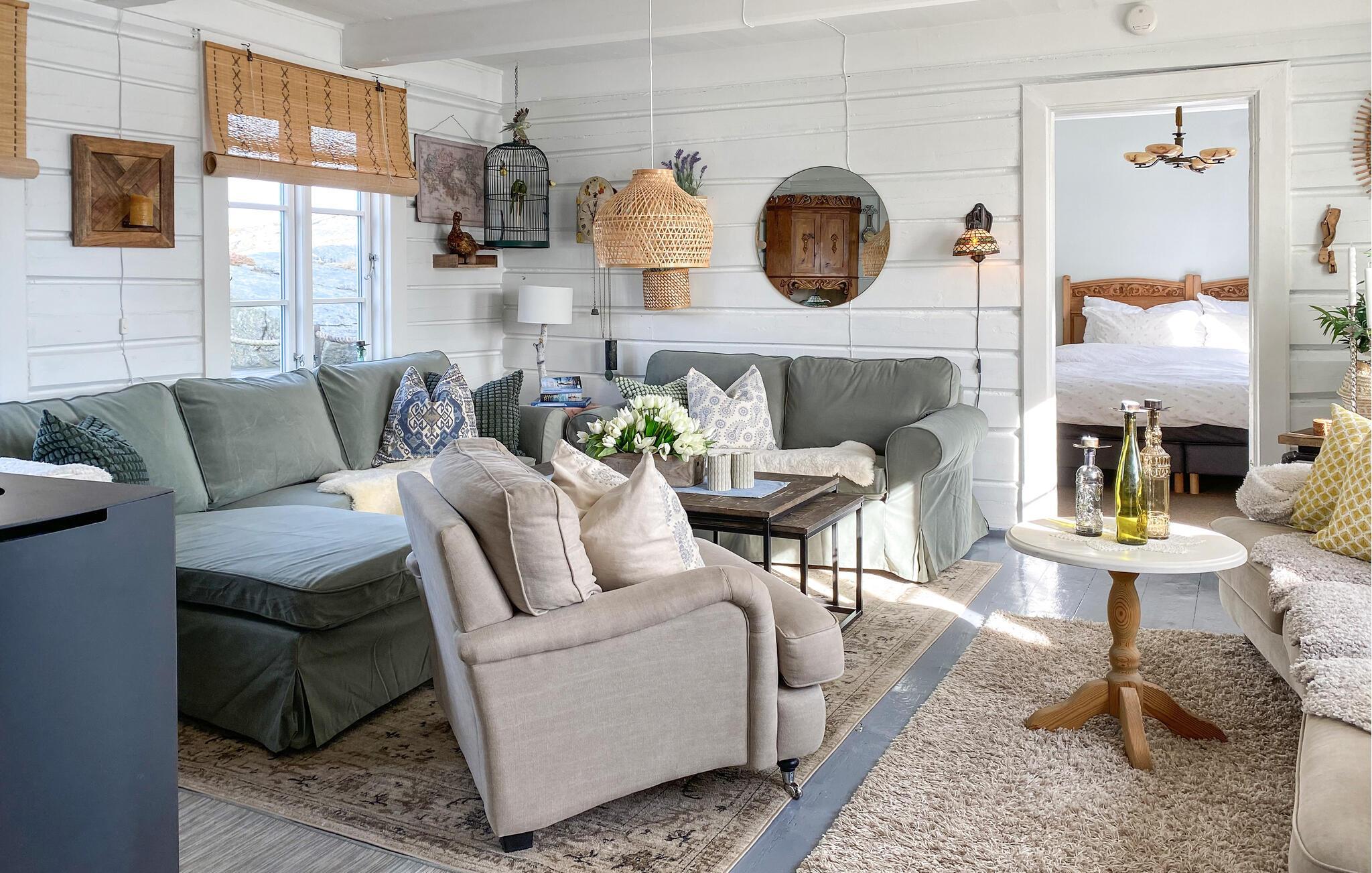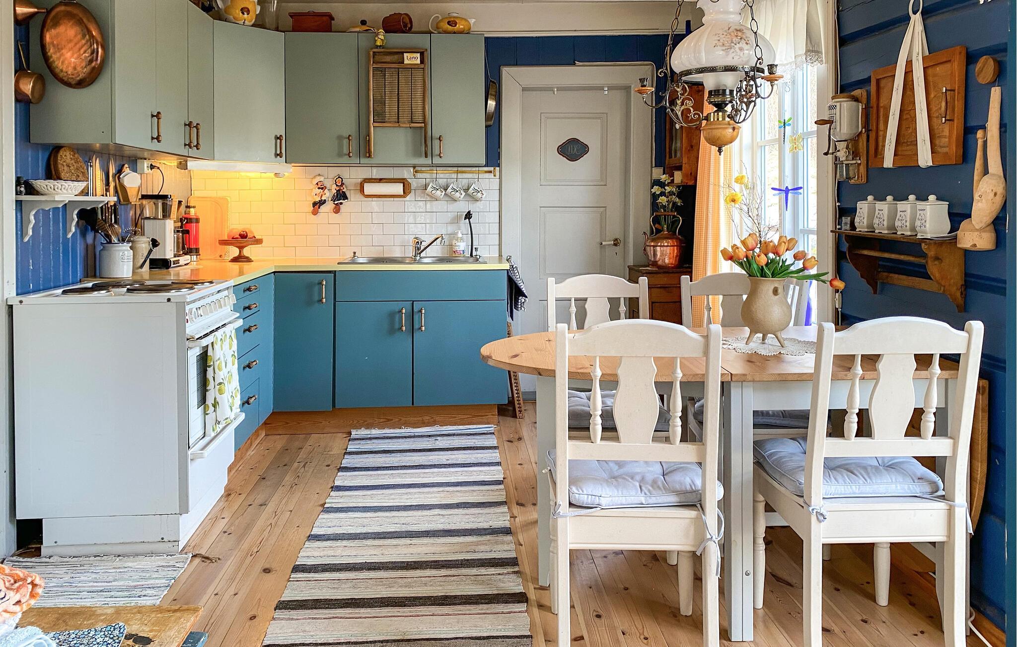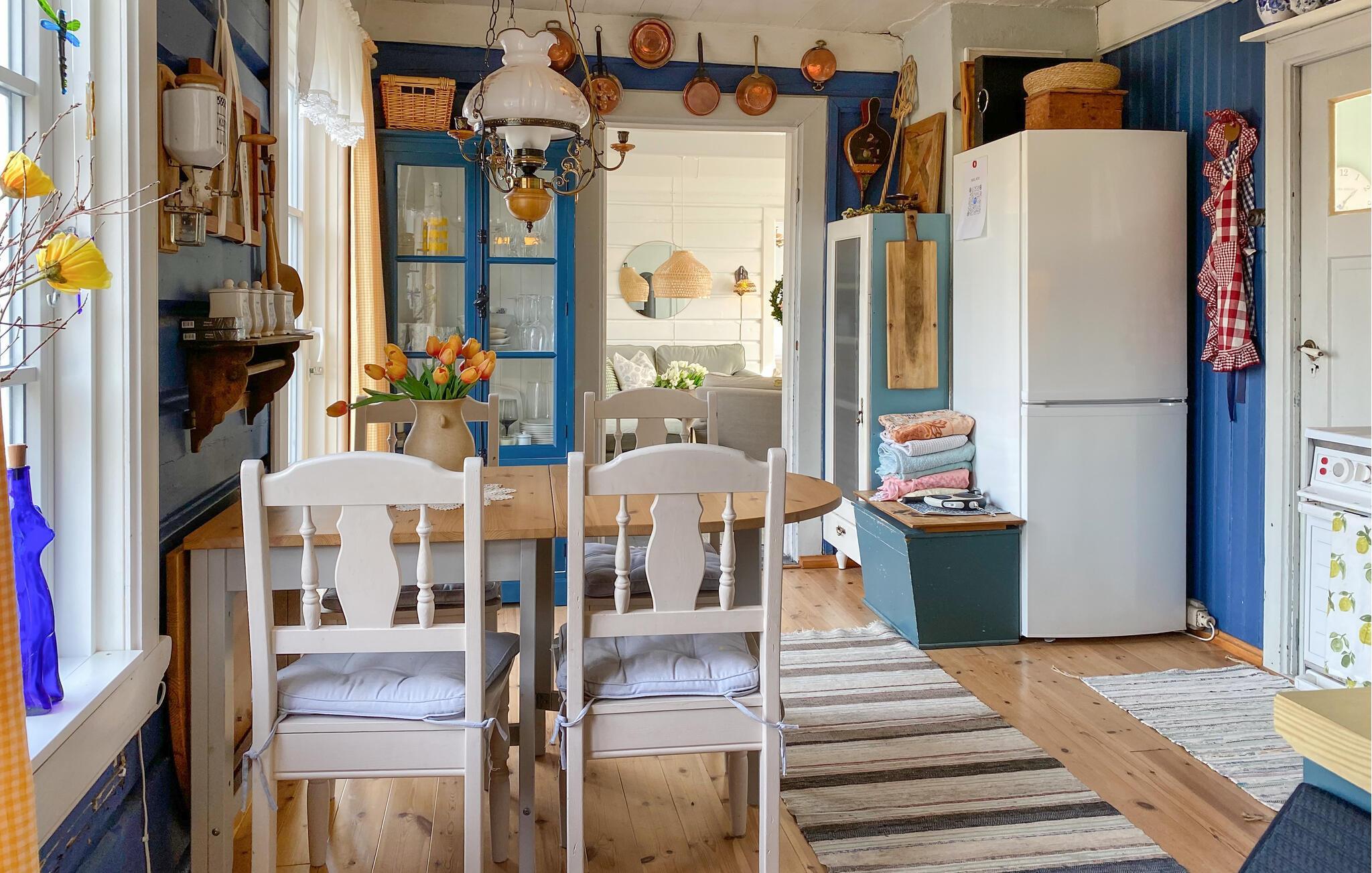 Upplev en speciell time-out i ditt kärleksfullt inredda semesterhus. Det skyddade läget direkt vid vattnet och husets ursprungliga charm skapar idealiska förutsättningar för avkopplande dagar. Dröj kvar i de mysiga vardagsrummen med sina ljusa träväggar, lekfulla detaljer och en smakfull blandning av rustik stil och skandinavisk lätthet. Gör dig bekväm i sofforna, sätt på TV:n eller bläddra i en bra bok. Använd de olika sittgrupperna för gemensamma måltider, spelkvällar eller lugna läsesessioner. Förbered dina måltider i det färgglada, mysiga köket, som imponerar med sina vackra element och lantliga känsla.