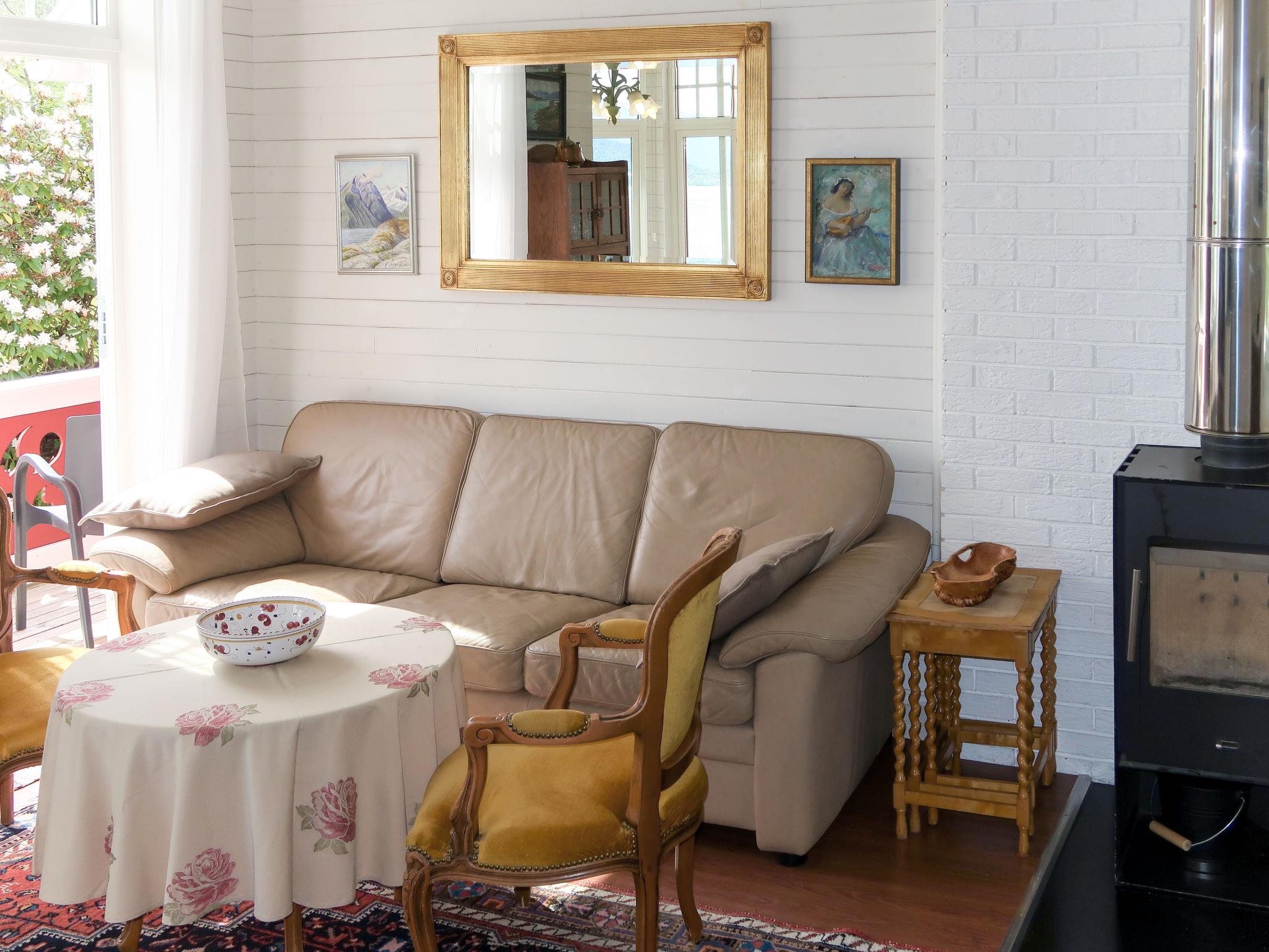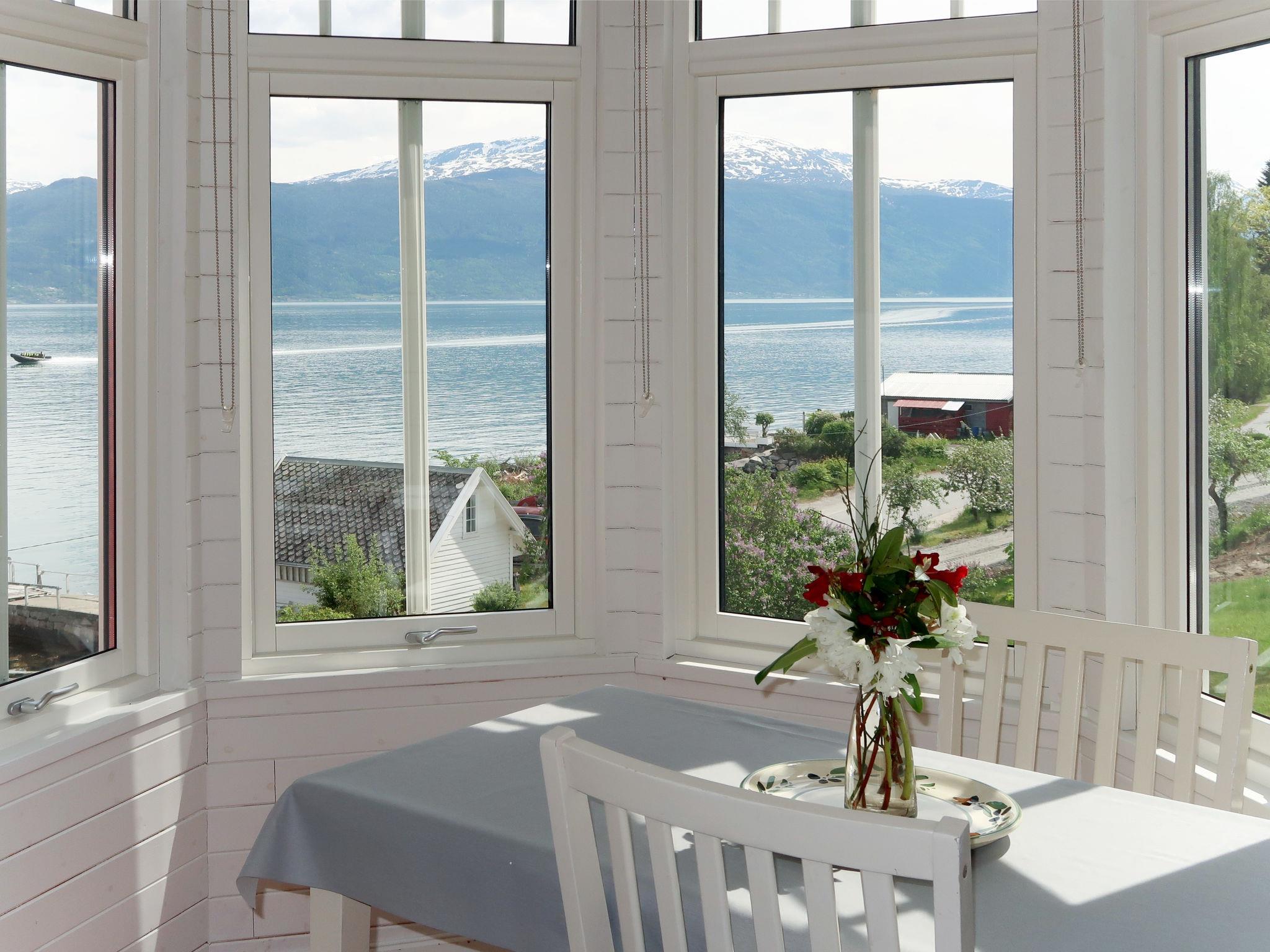 "Villa Lorna", 3-room apartment 55 m2. Bright, renovated in 2015, tasteful and cosy furnishings: living/dining room with Scandinavian wood stove, dining table, satellite TV, international TV channels and DVD. 1 room with 1 double bed. 1 room with 1 bed (90 cm, length 200 cm). Open kitchen (oven, 4 ceramic glass hob hotplates, toaster, kettle, electric coffee machine). Shower/WC. Electric heating. Wooden floors. Terrace. Terrace furniture, barbecue. Very beautiful view of the sea, the mountains and fjord. Facilities: washing machine. Internet (WiFi, free). Please note: non-smoking house. Smoke alarm, fire extinguisher. Fridge and freezer avaliable. 924531169