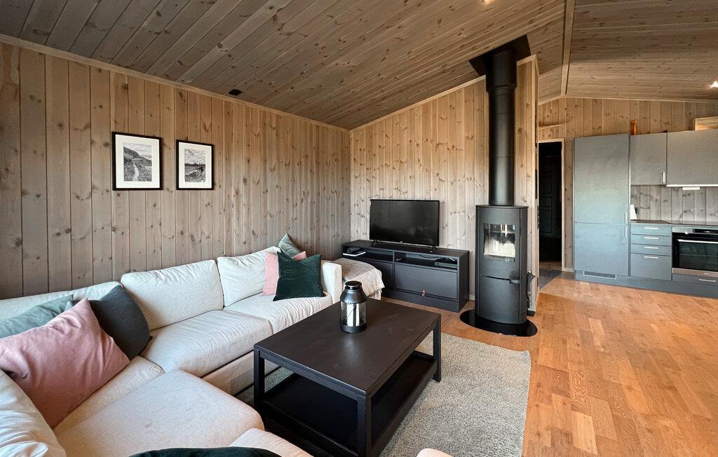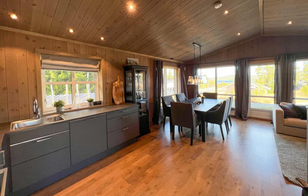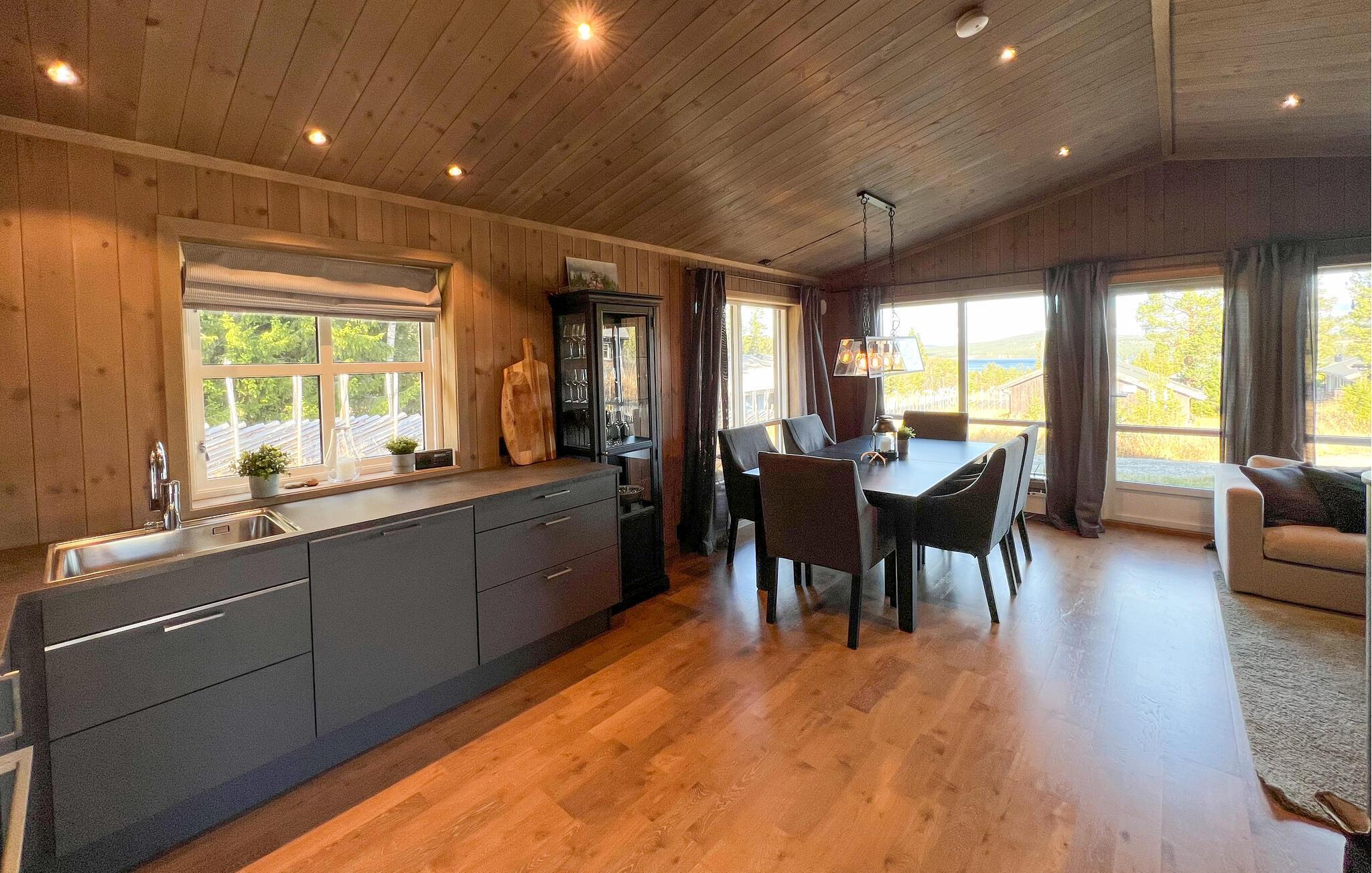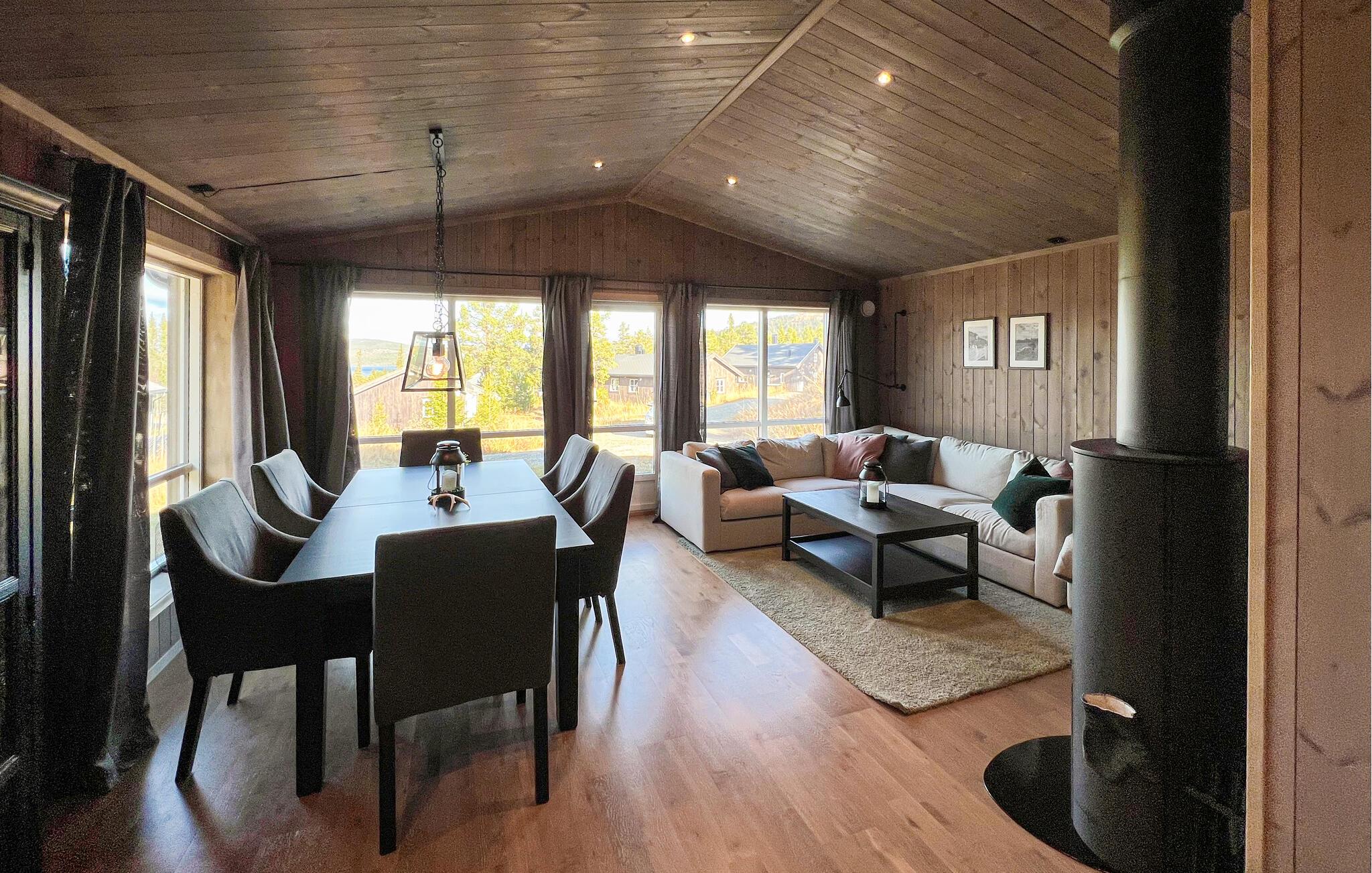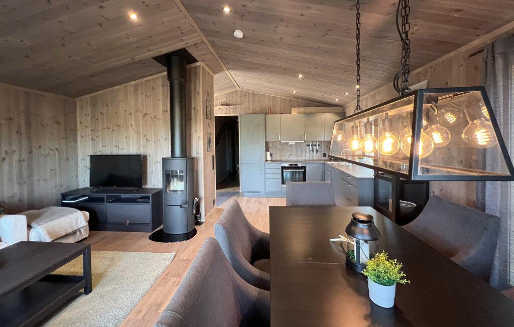 Njut av avkopplande dagar i denna smakfullt inredda stuga, som kombinerar värme, lugn och nordisk design. Huset är omgivet av skogar och berg och erbjuder en idyllisk atmosfär. Koppla av i det ljusa vardagsrummet med stora panoramafönster med utsikt över landskapet. Den mysiga soffgruppen inbjuder till lugna timmar framför braskaminen, medan den öppna planlösningen med matplats och modernt kök ger en känsla av rymd. Förbered dina måltider i det eleganta köket och avnjut dem vid det långa träbordet i det varma ljuset. Träpanel på väggarna och noggrant utvalda detaljer skapar en harmonisk, skandinavisk atmosfär.