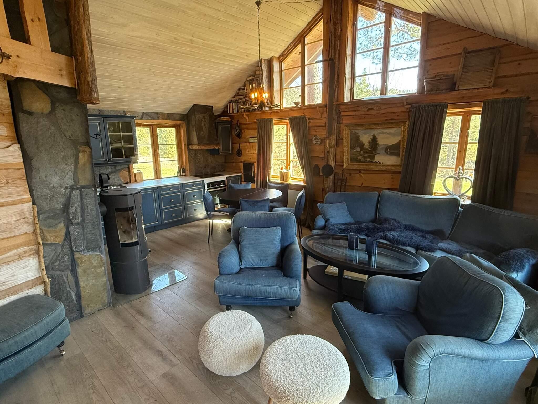 Huset er bygget i klassisk stil med tømmervegger, skråtak og en varm og innbydende fasade. Store vinduer slipper inn rikelig med dagslys og gir flott utsikt til landskapet, og terrassen inviterer til lange sommerkvelder med utsikt over grønne enger og skogkledde åser. Feriehuset har en åpen og luftig planløsning med kombinert kjøkken/stue som er hjertet i huset, et sosialt samlingspunkt hvor man kan lage mat, spise sammen og slappe av TV eller PlayStation. Interiøret er enkelt og funksjonelt, med en lun atmosfære som gjør det lett å føle seg hjemme.