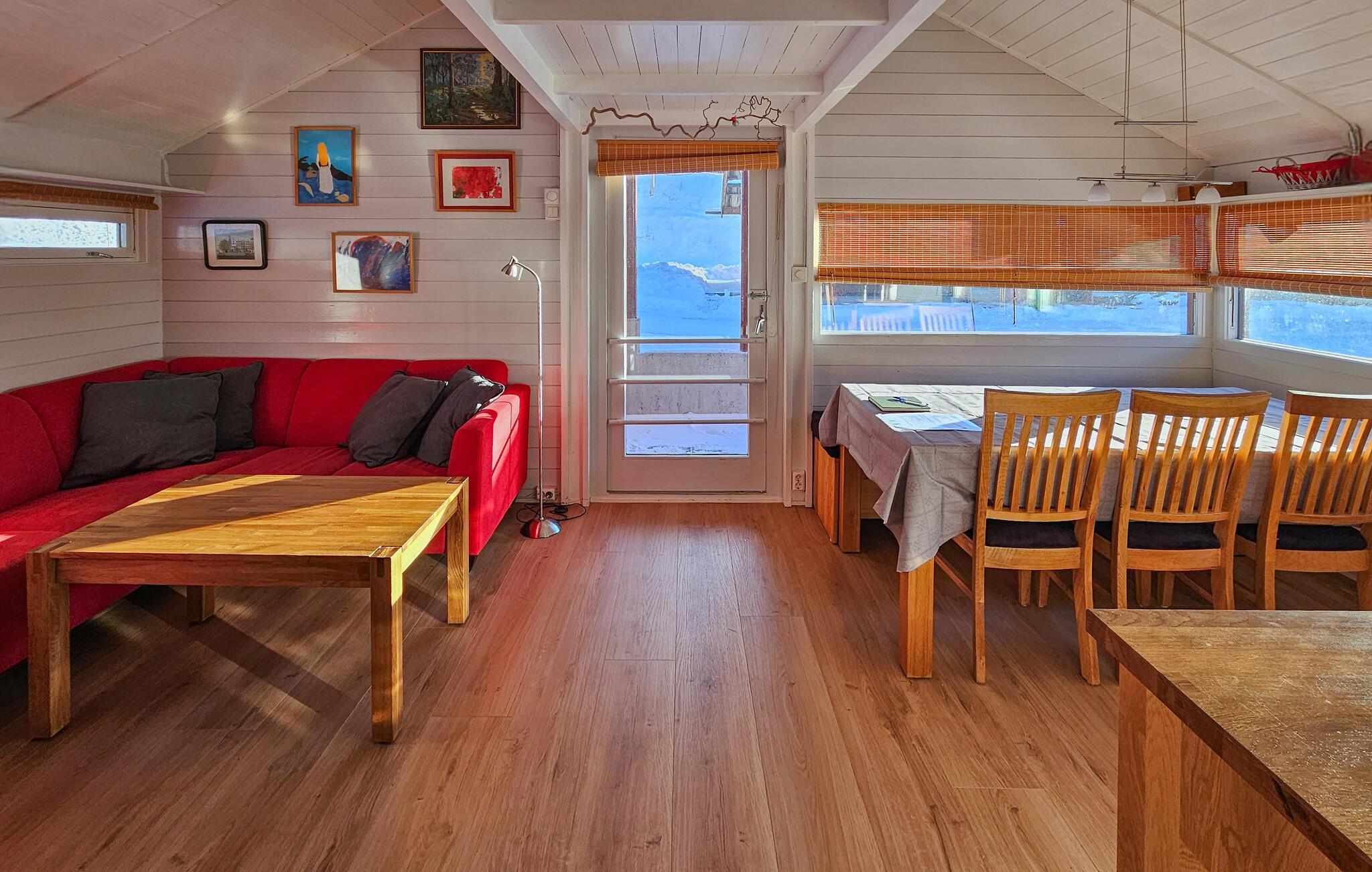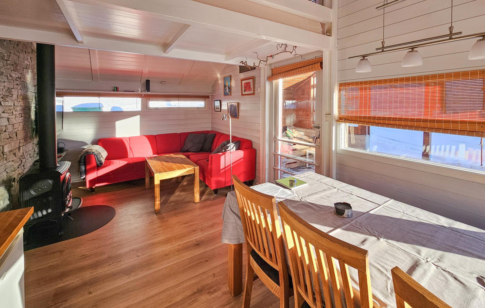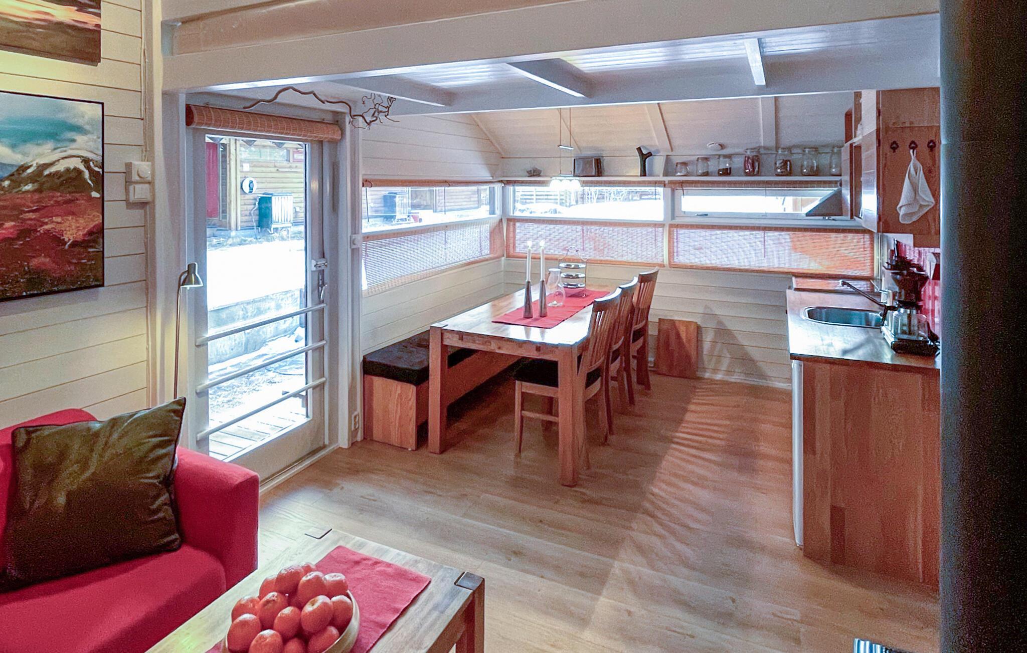 Välkommen till denna mysiga tillflyktsort, där du kan koppla av från vardagen i slutet av Eresfjorden. Förbered dina måltider i den varma atmosfären i köket med öppen planlösning och gör dig bekväm i den ljusa matplatsen. Tänd den vedeldade kaminen och njut av den mysiga atmosfären medan du spelar spel i den bekväma soffgruppen eller streamar en spännande film.