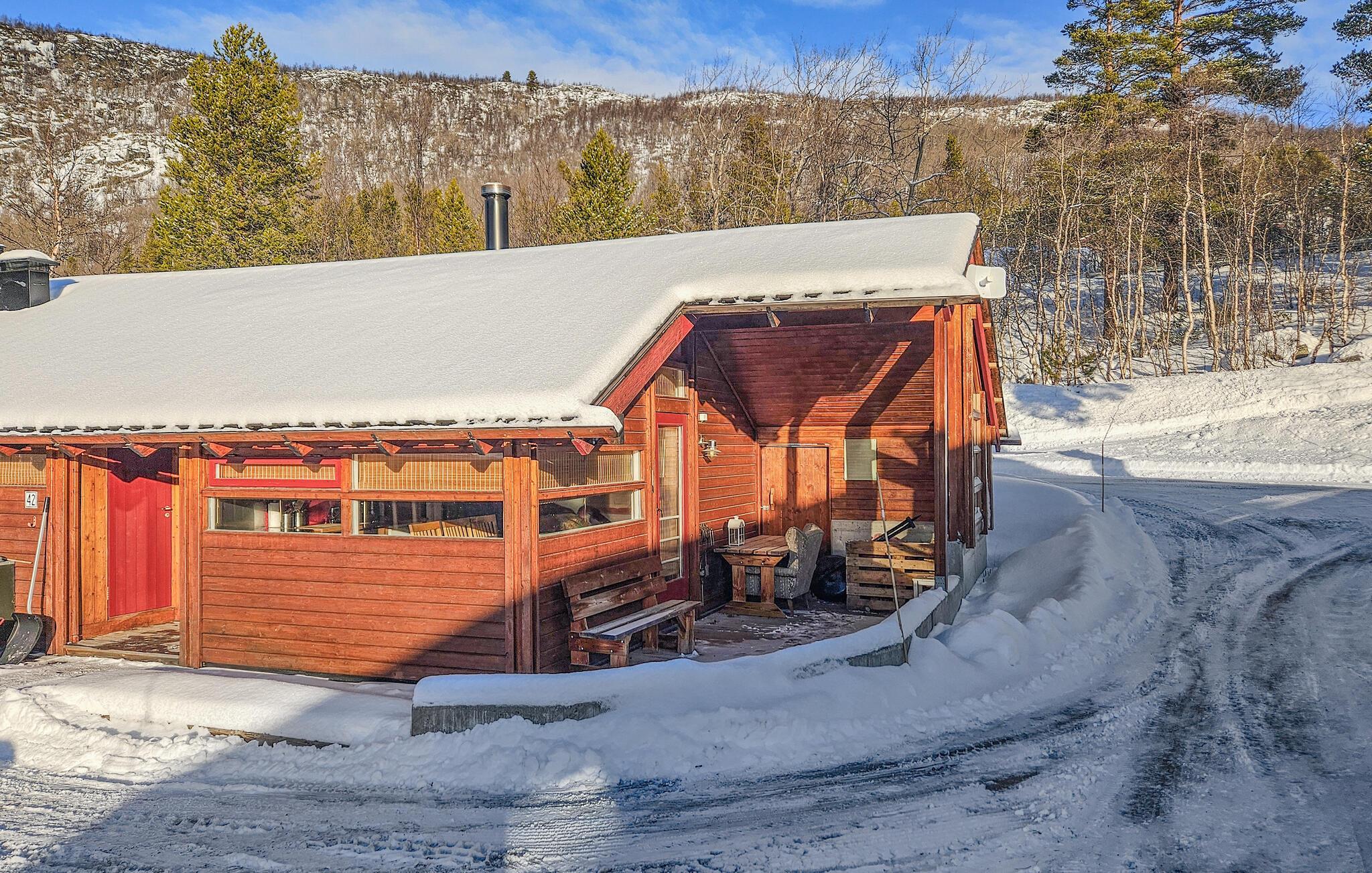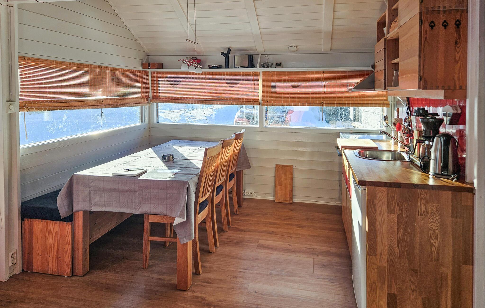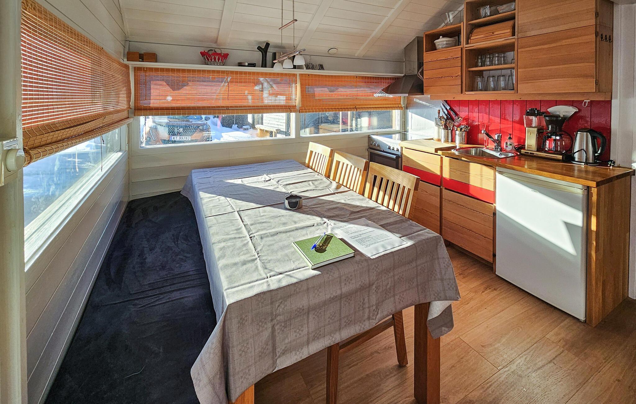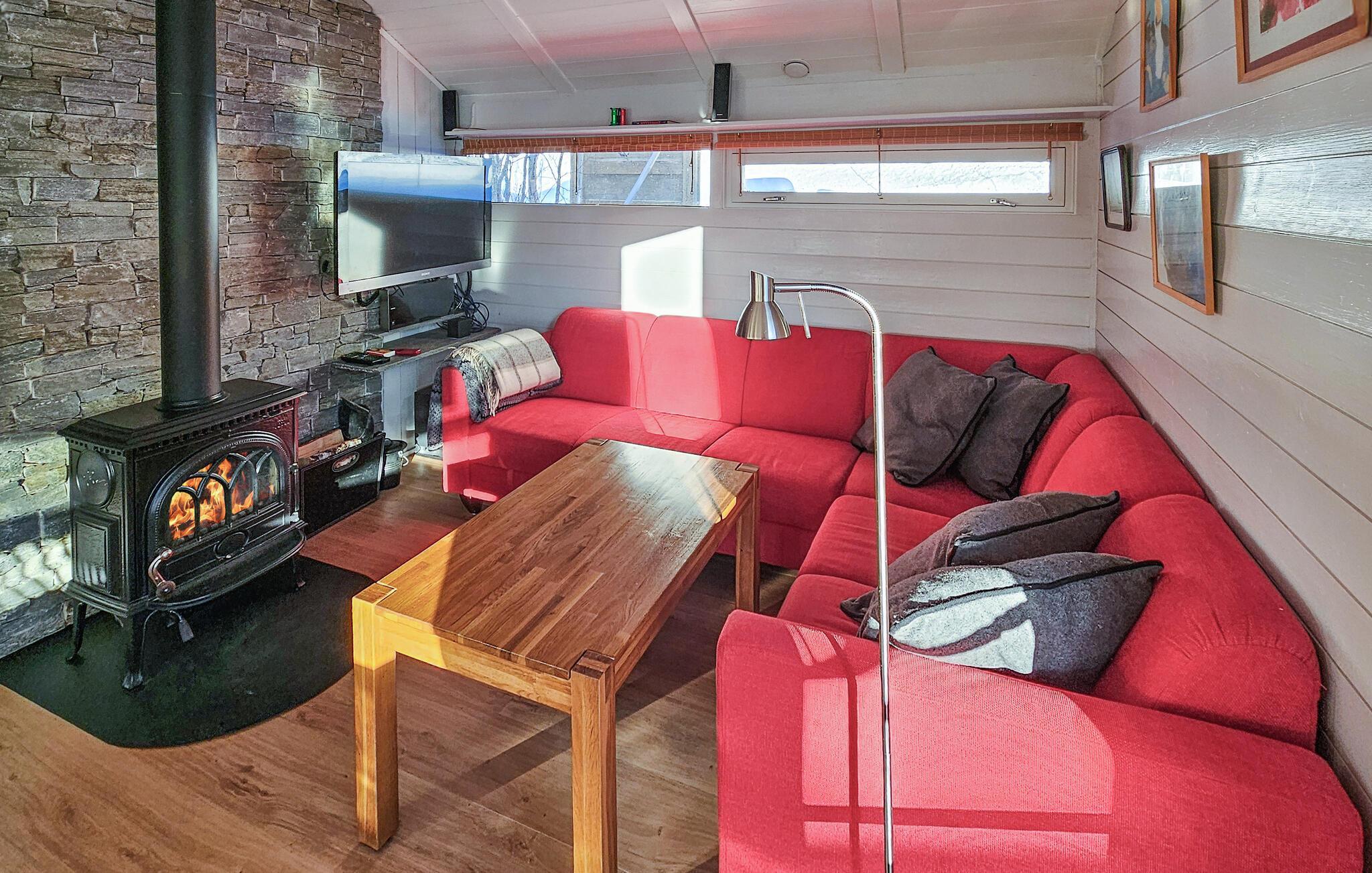 Välkommen till denna mysiga tillflyktsort, där du kan koppla av från vardagen i slutet av Eresfjorden. Förbered dina måltider i den varma atmosfären i köket med öppen planlösning och gör dig bekväm i den ljusa matplatsen. Tänd den vedeldade kaminen och njut av den mysiga atmosfären medan du spelar spel i den bekväma soffgruppen eller streamar en spännande film.