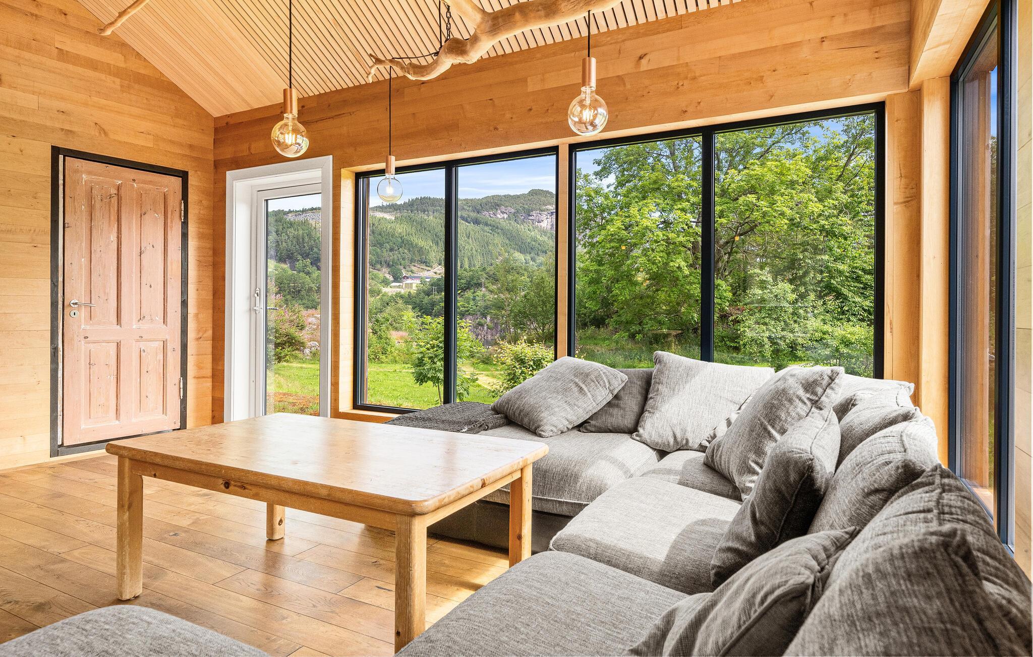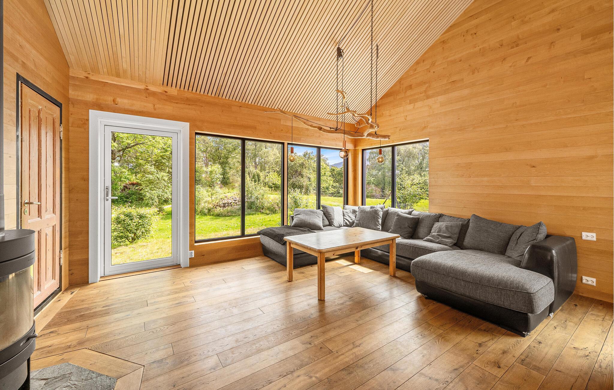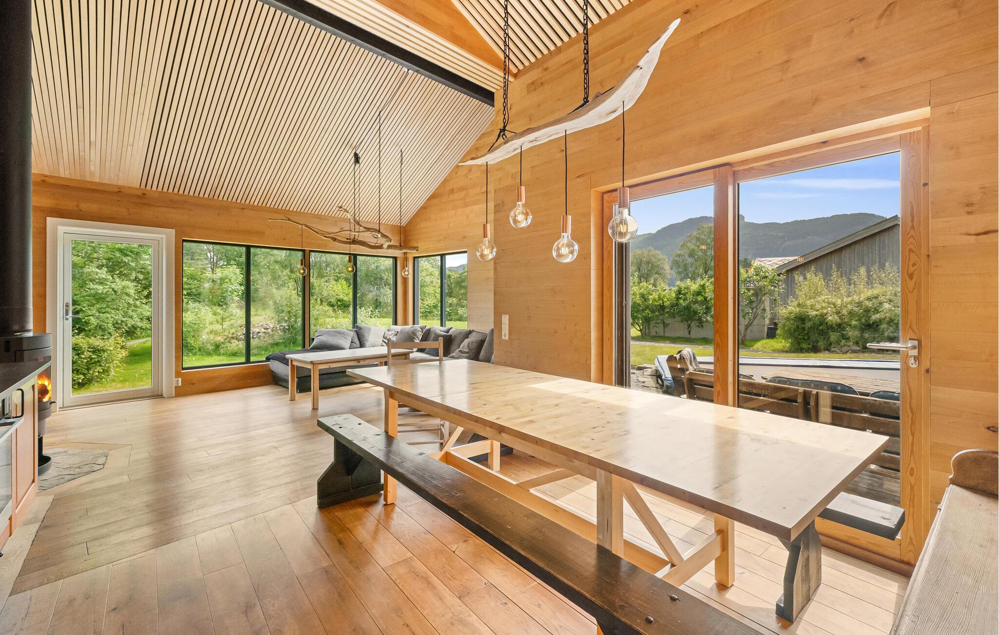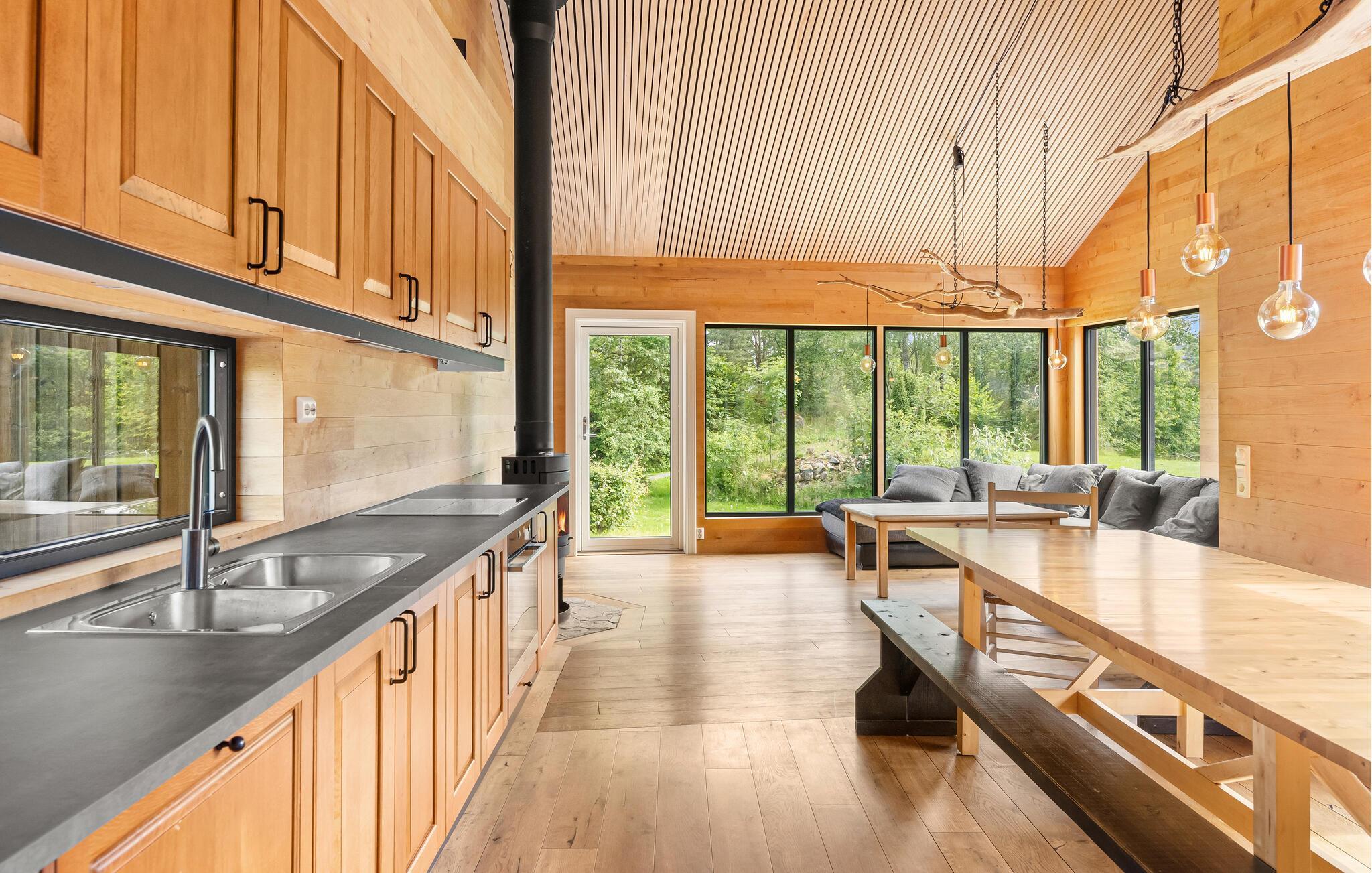 Tillbringa avkopplande dagar i natursköna omgivningar, perfekt för familjer som vill kombinera natur, komfort och aktiviteter. Detta smakfullt designade trähus erbjuder idealiska förutsättningar för en lyckad semester precis vid fjorden. Njut av det rymliga vardagsrummet med högt i tak, mycket trä och stora fönster som erbjuder utsikt över landsbygden. Gör det bekvämt för dig i soffgruppen eller duka upp matbordet för gemensamma måltider. Laga mat i det moderna köket, där flera personer bekvämt kan laga mat tillsammans. Den öppna planlösningen inbjuder till avkopplande timmar i en vänlig atmosfär.