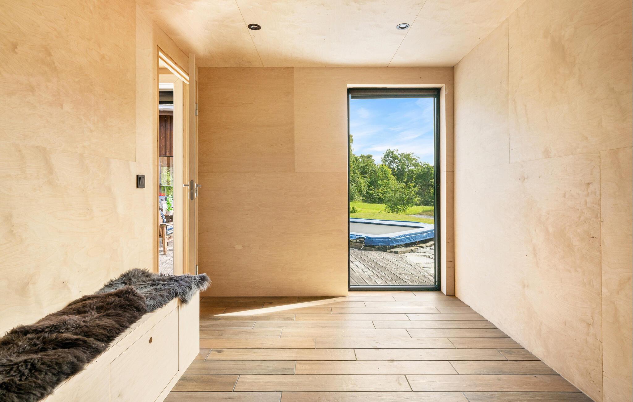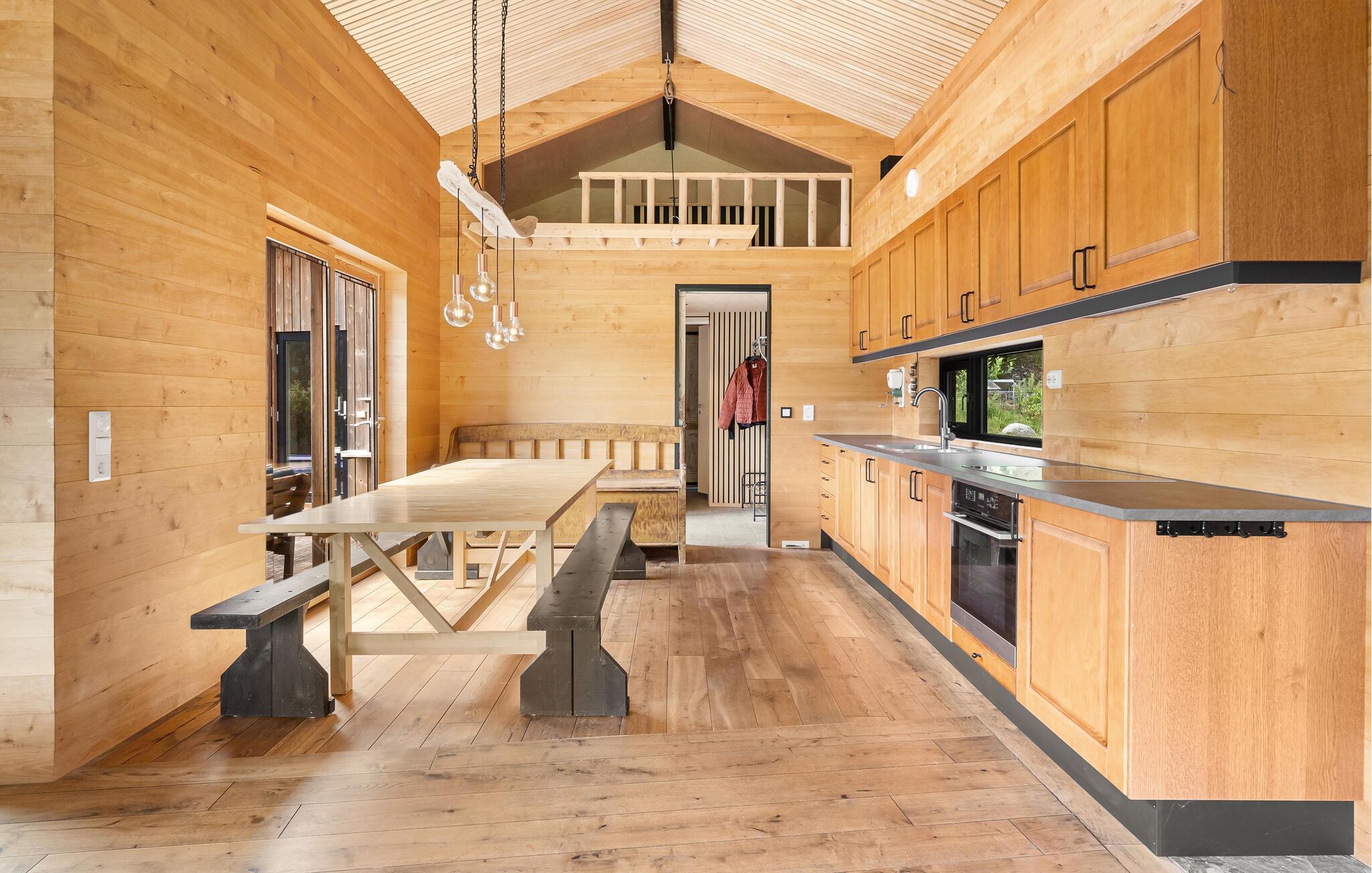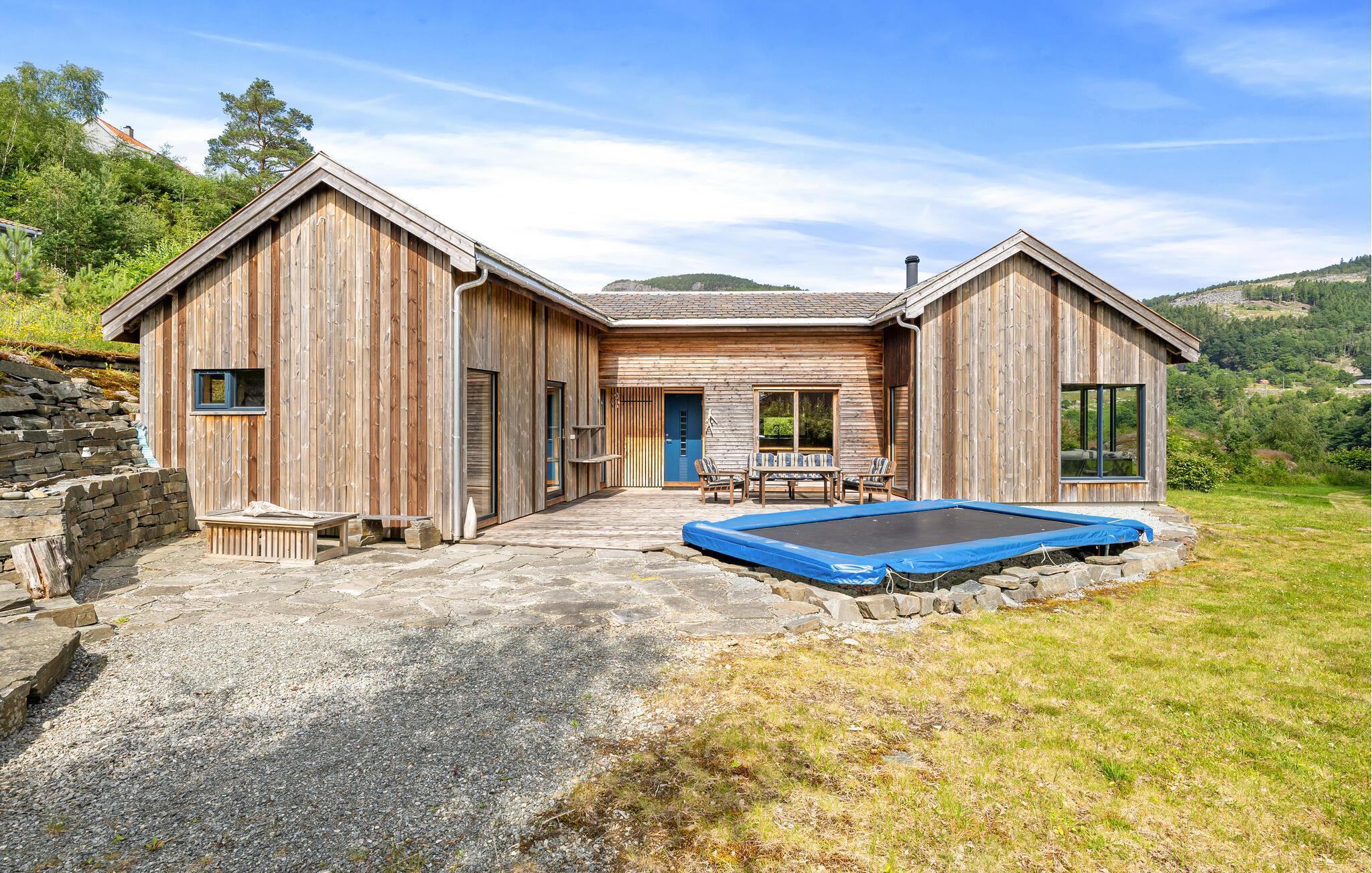Tillbringa avkopplande dagar i natursköna omgivningar, perfekt för familjer som vill kombinera natur, komfort och aktiviteter. Detta smakfullt designade trähus erbjuder idealiska förutsättningar för en lyckad semester precis vid fjorden. Njut av det rymliga vardagsrummet med högt i tak, mycket trä och stora fönster som erbjuder utsikt över landsbygden. Gör det bekvämt för dig i soffgruppen eller duka upp matbordet för gemensamma måltider. Laga mat i det moderna köket, där flera personer bekvämt kan laga mat tillsammans. Den öppna planlösningen inbjuder till avkopplande timmar i en vänlig atmosfär.