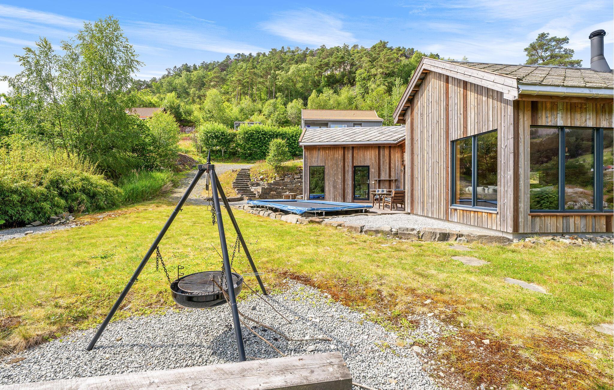 Gå ut på den stora träterrassen, sätt dig i trädgårdsmöblerna och njut av utsikten över den omgivande grönskan. Använd den infällda studsmattan för att ha kul med barnen eller laga pinnbröd vid lägerelden. Den närliggande bryggan erbjuder direkt tillgång till vattnet, perfekt för fiske, simning eller en kort båttur.