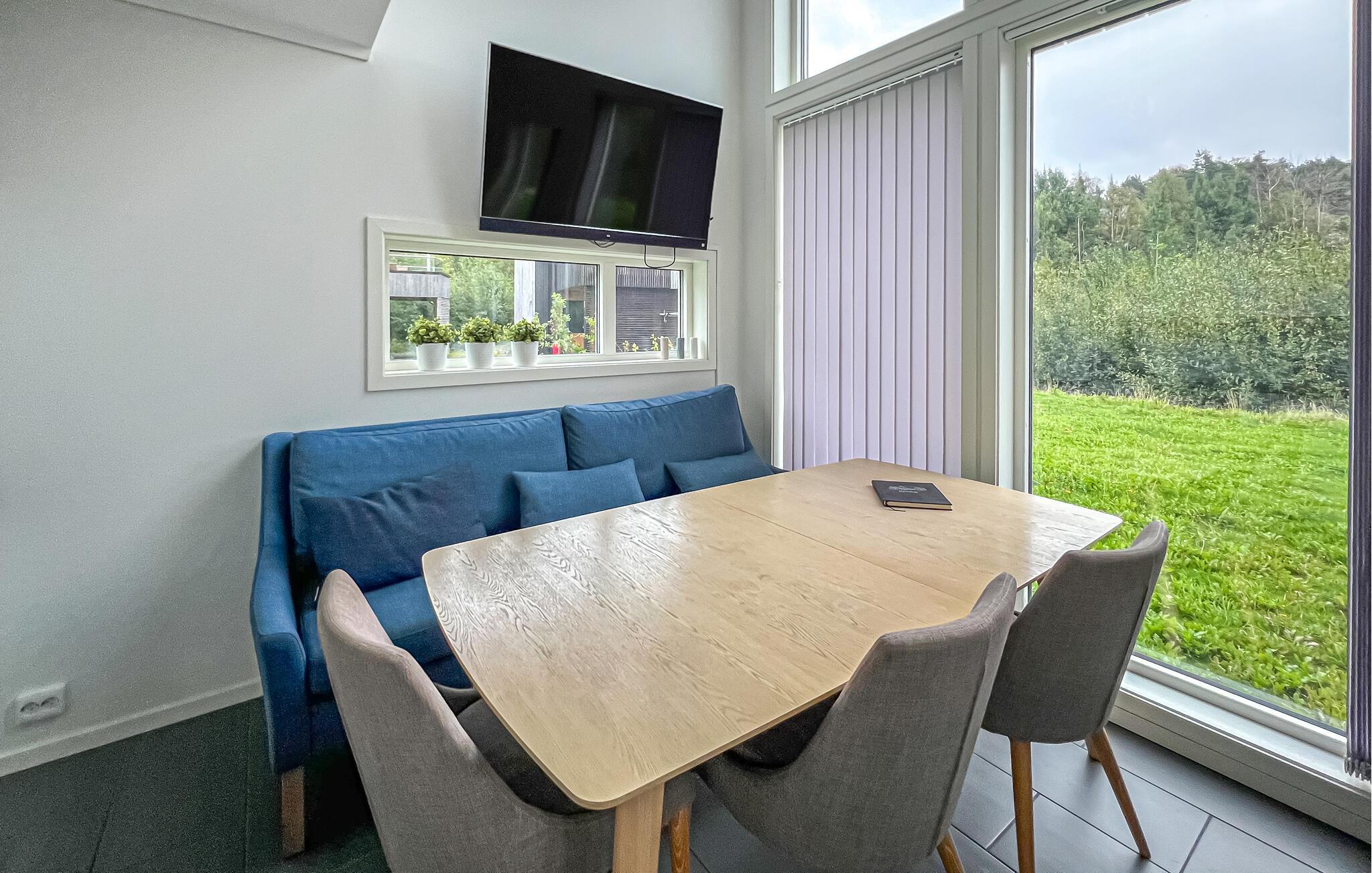 Detta trähus utlovar en avkopplande semester i en klass för sig. En stor fönsterfront släpper in mycket varmt ljus i interiören, samtidigt som du kan njuta av en underbar utsikt över grönskan. Koppla av i soffan med en kopp kaffe, streama din favoritserie eller starta en liten matlagningsduell i köket.