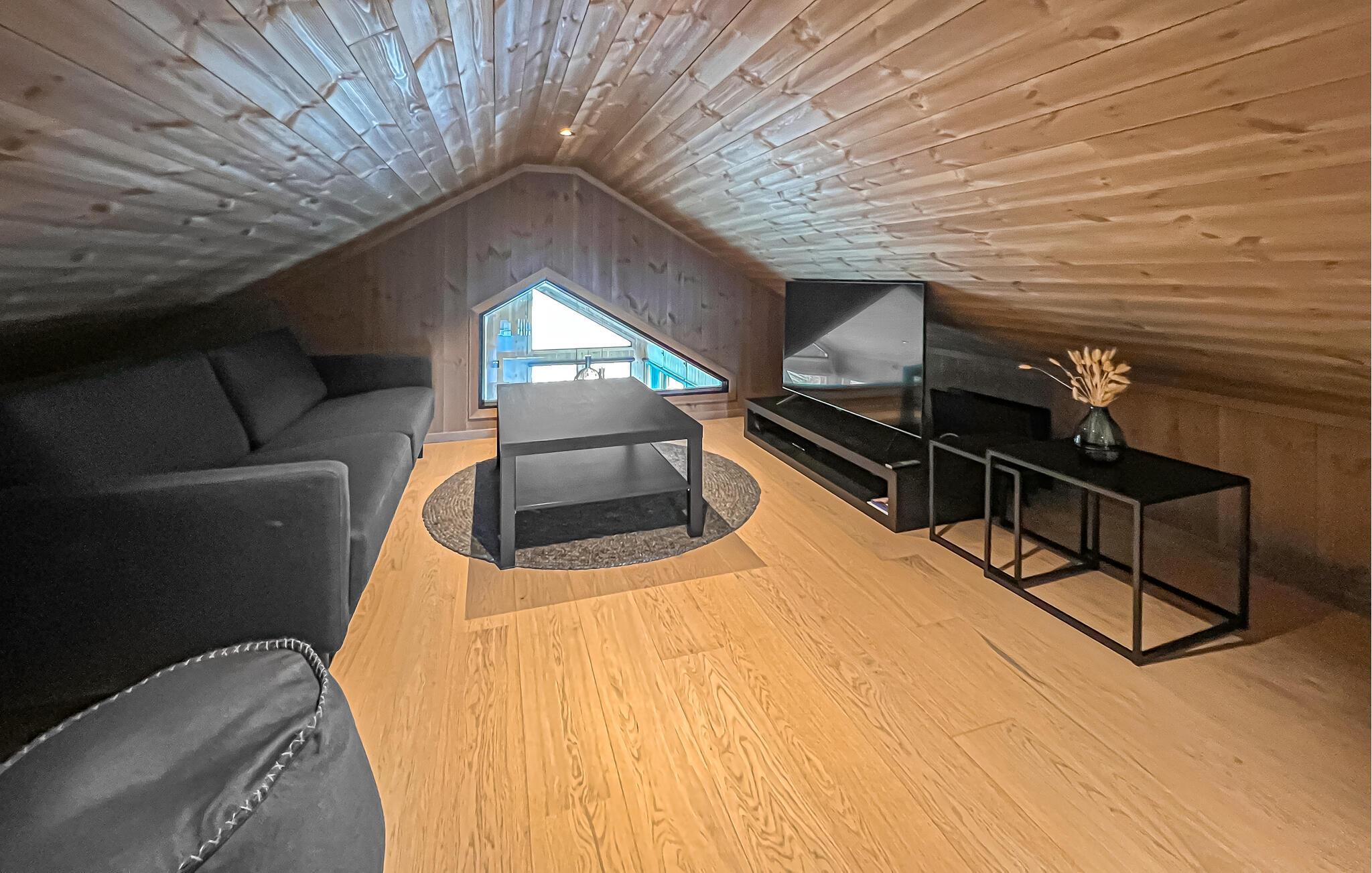 Detta mysiga och smakfullt inredda semesterhus erbjuder dig en bekväm bas för härliga utflykter i naturen året runt. Stora fönster öppnar upp utsikten över det pittoreska landskapet och ger gott om naturligt dagsljus. I vardagsrummet med öppen planlösning kan ni skapa kulinariska höjdpunkter och slå er ner i den inbjudande matplatsen. Efter en lång dag i friska luften kan du tända den öppna spisen och njuta av den mysiga atmosfären under en spelkväll eller medan du streamar en spännande film.