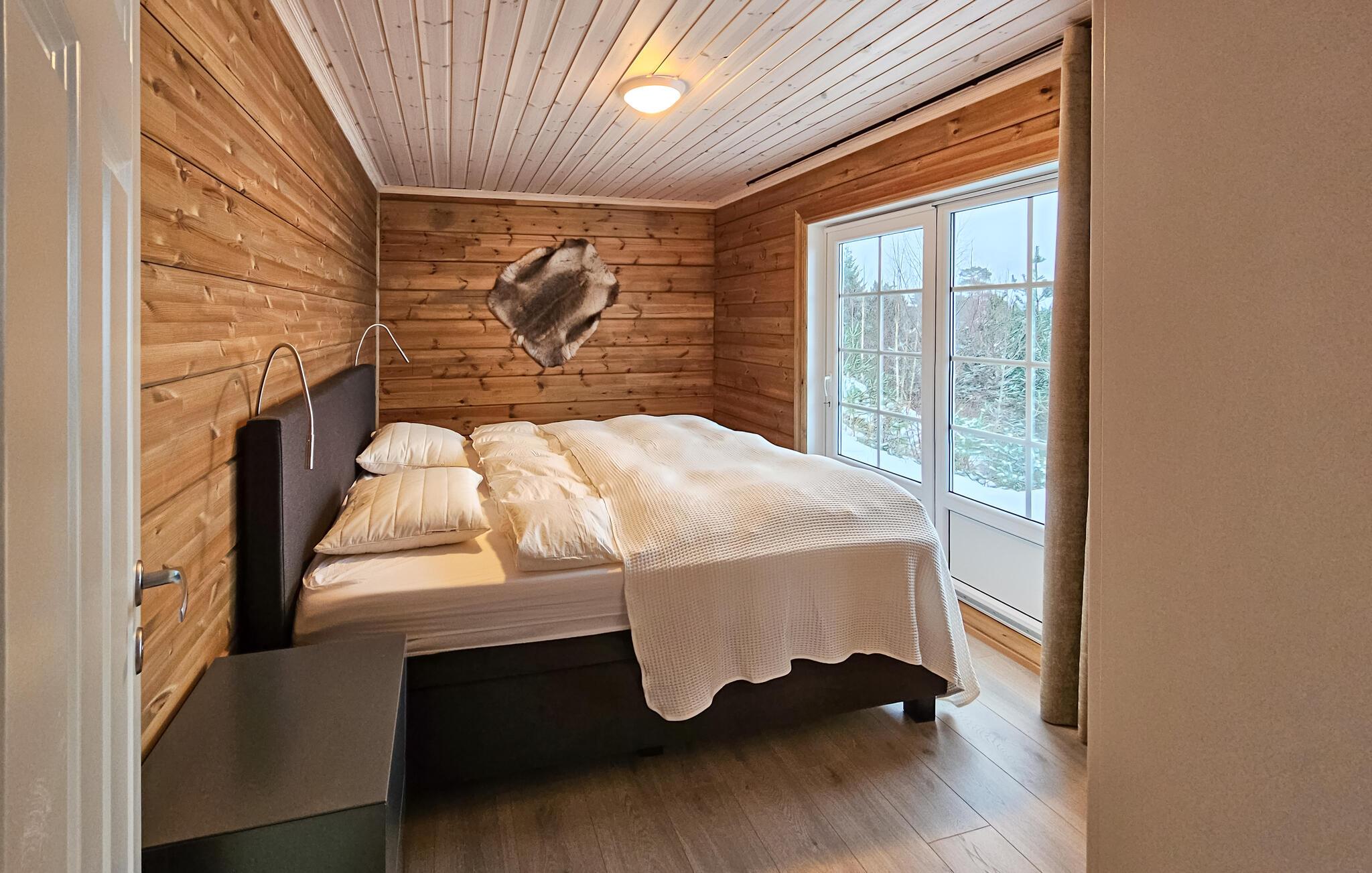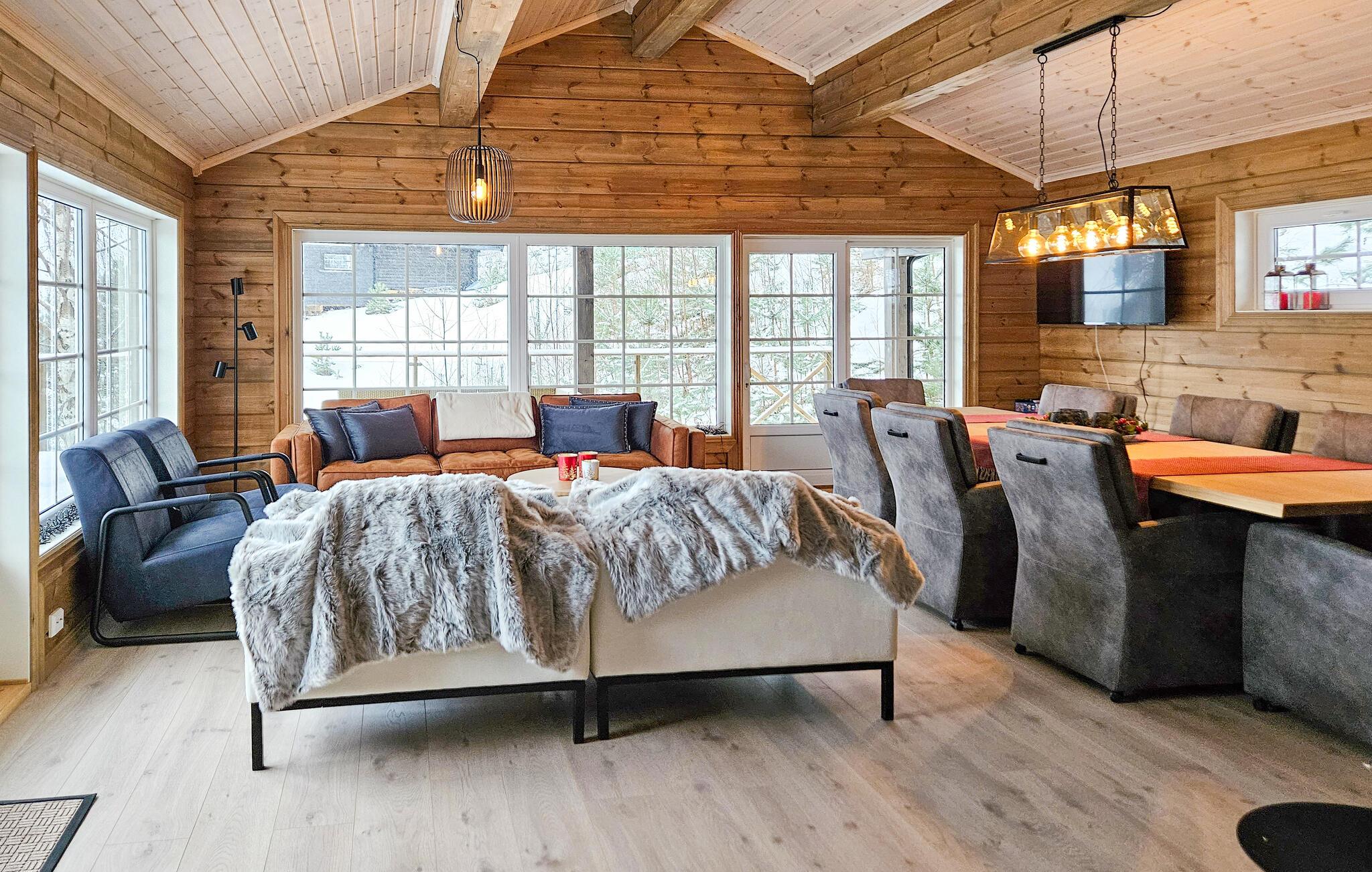 Välkommen till detta bekväma semesterhus i ett underbart panoramaläge, där du kan se fram emot fantastiska naturupplevelser och en fantastisk utsikt över Nisser och dess stränder året runt. Den smakfulla inredningen och mycket trä gör det till en mysig plats för en avkopplande paus från vardagen, vilket också är särskilt lämpligt för en semester med barn. Det långa matbordet och den bekväma sittgruppen inbjuder till umgänge på kvällarna efter en händelserik dag. Prata länge och lyssna på de sprakande lågorna i den öppna spisen.