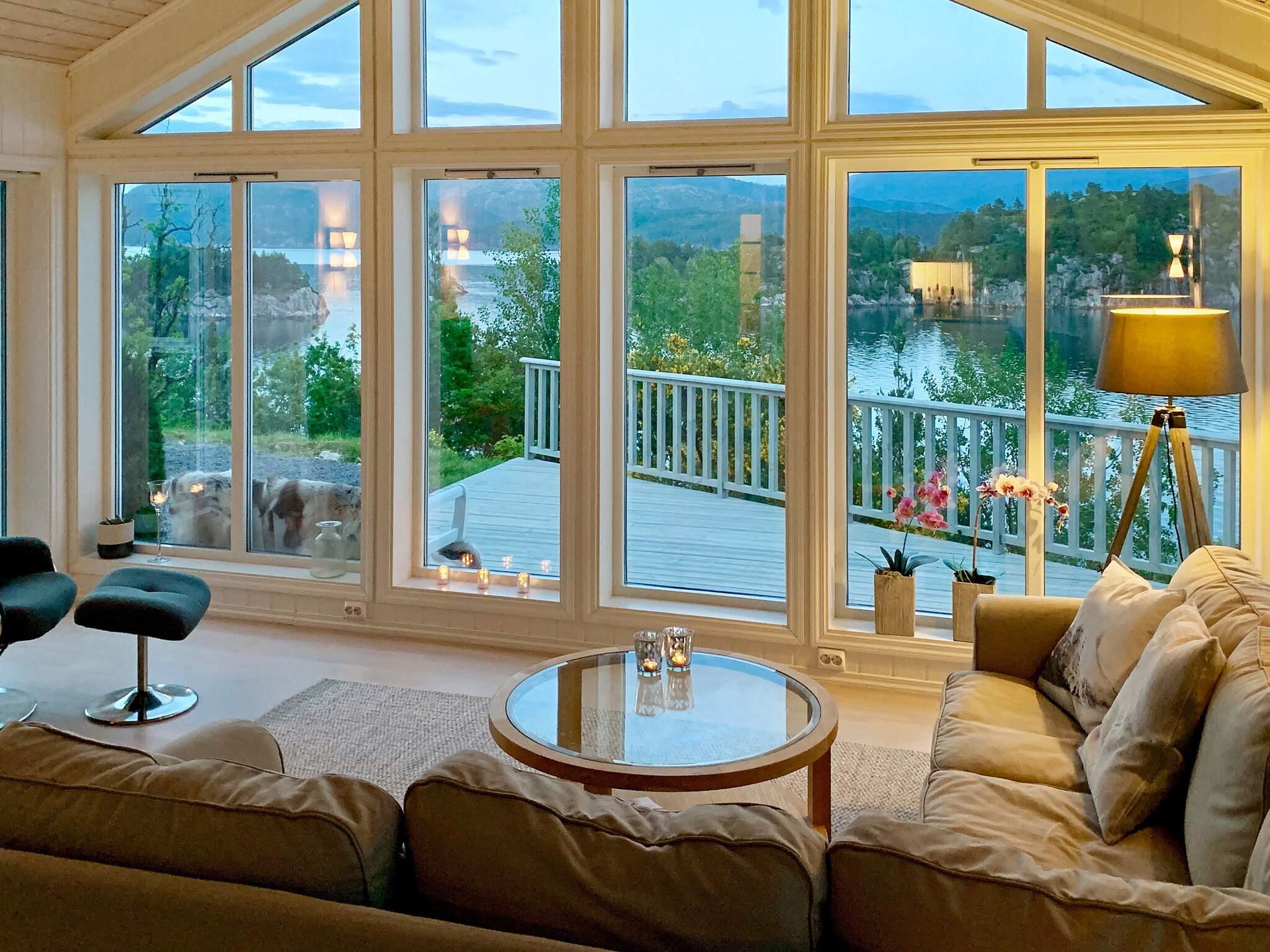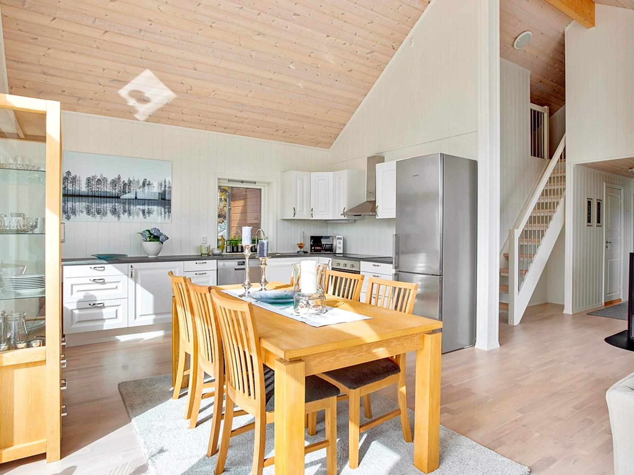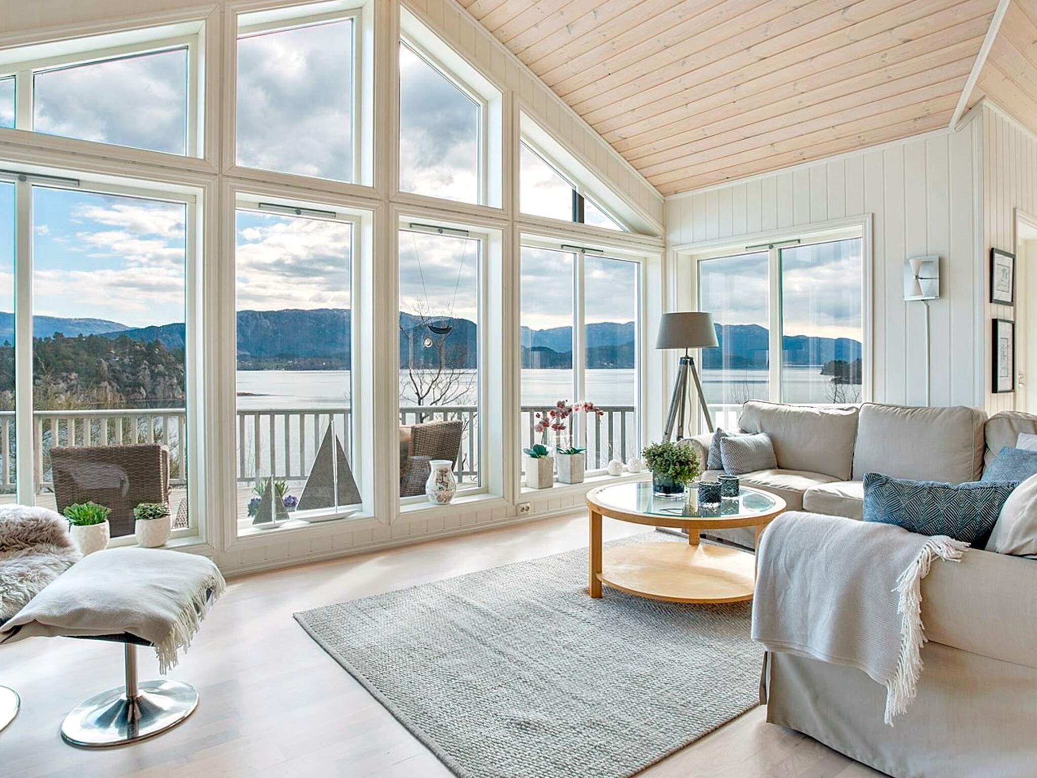 Det er utgang fra stuen til terrassen. Hytten er pent og praktisk innredet med en flott salong i stuen med store vinduer og utsikt over vannet. Rikelig med utstyr på kjøkkenet. Rammemadrasser på alle soverommene hvor noen kan brukes i en kombinasjon av dobbelt eller enkelt senger. Parabolen tar inn en rekke internasjonale kanaler, også tyske. Badet er stort med mye skapplass. Bod med fryseboks og vaskemaskin.