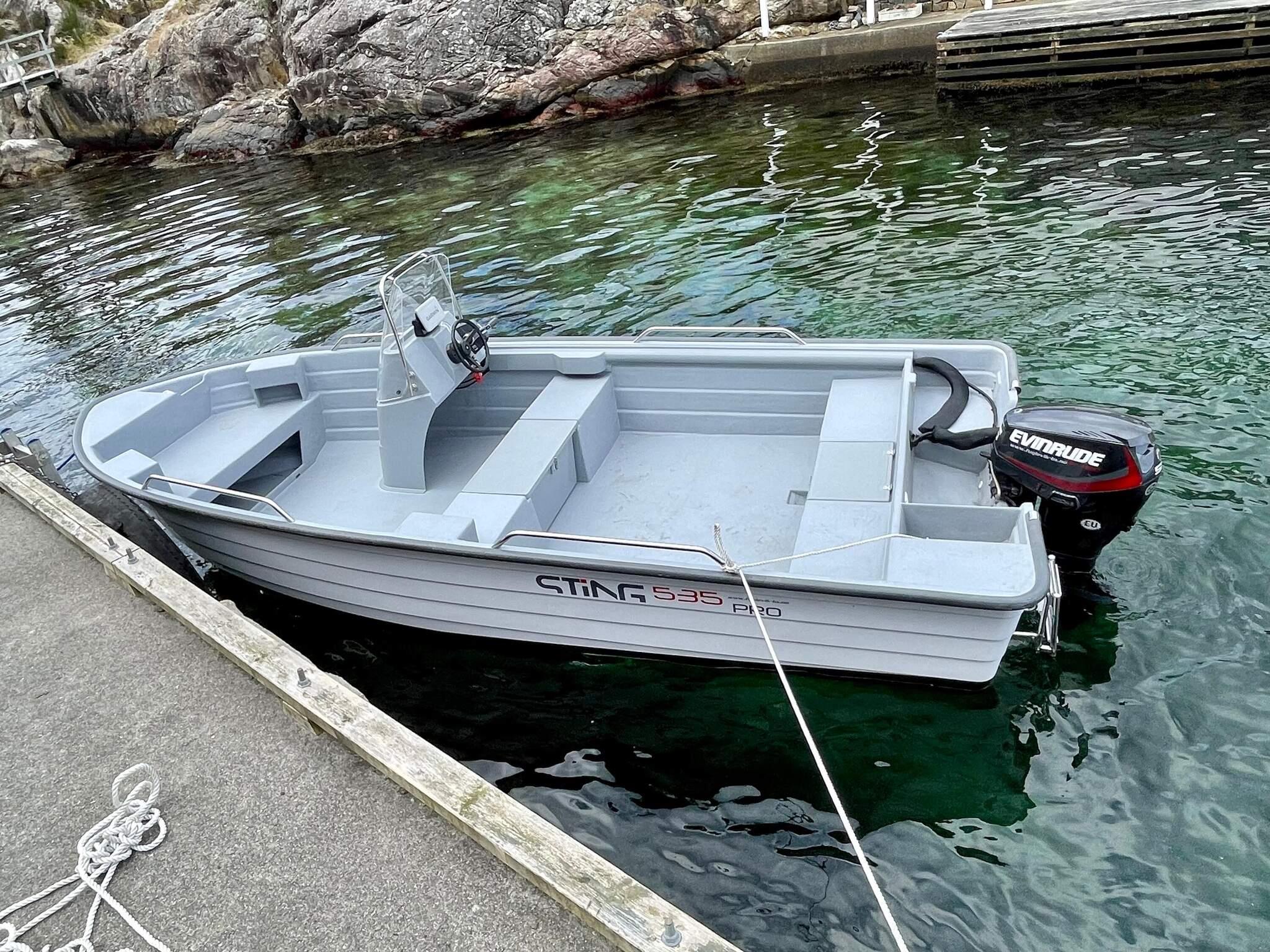 Båt til leie i privat båthavn og fileteringsplass for fiske ca. 450 m fra hytten. Det er parkeringsplass 80 meter fra båtplassen, de siste 30 m er bratt å gå, passer for de spreke. 18 fots båt Sting 535 med 50 HK Evinrude motor, Garmin 7-toms GPS, kartplotter og ekkolodd.