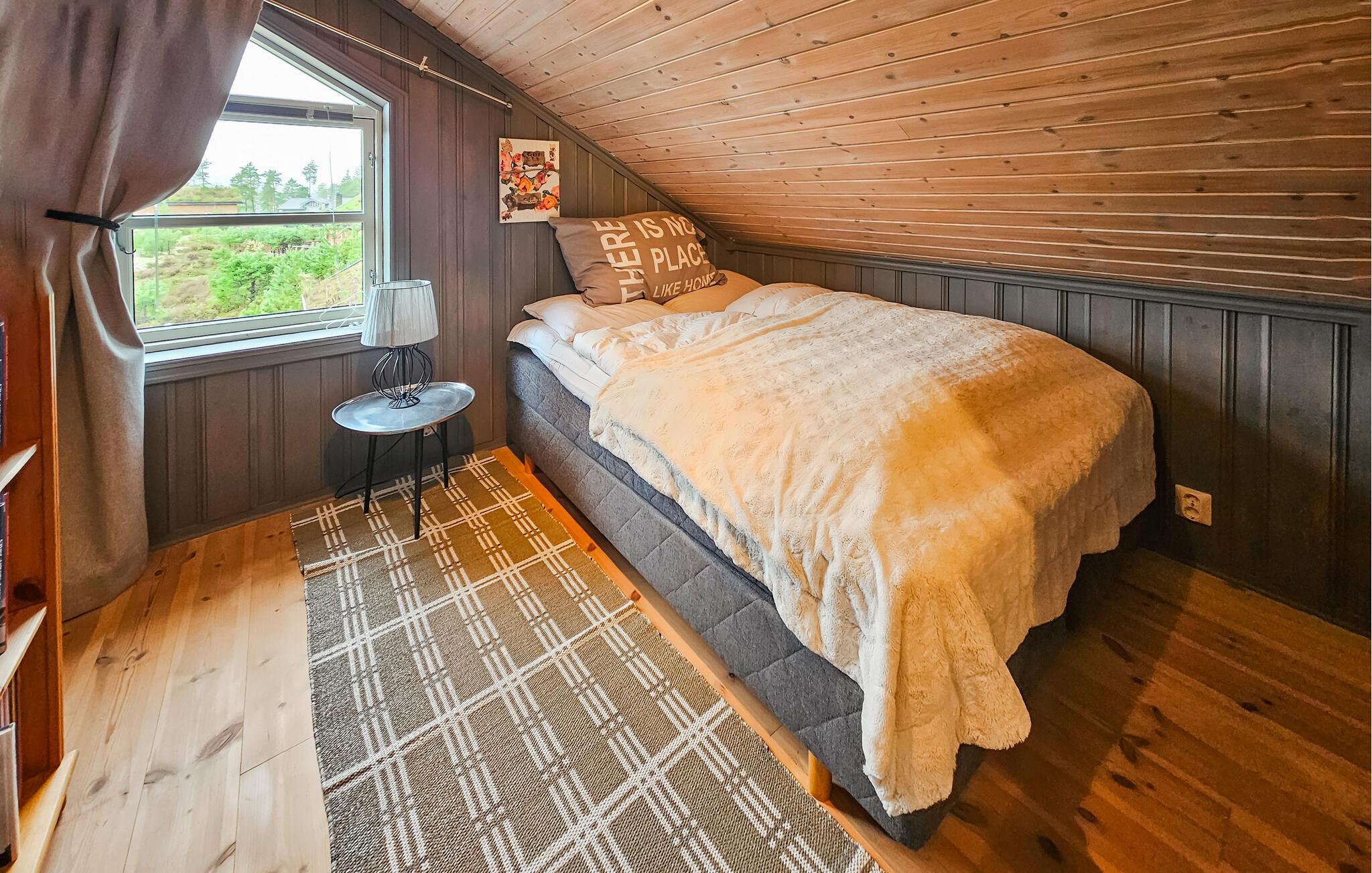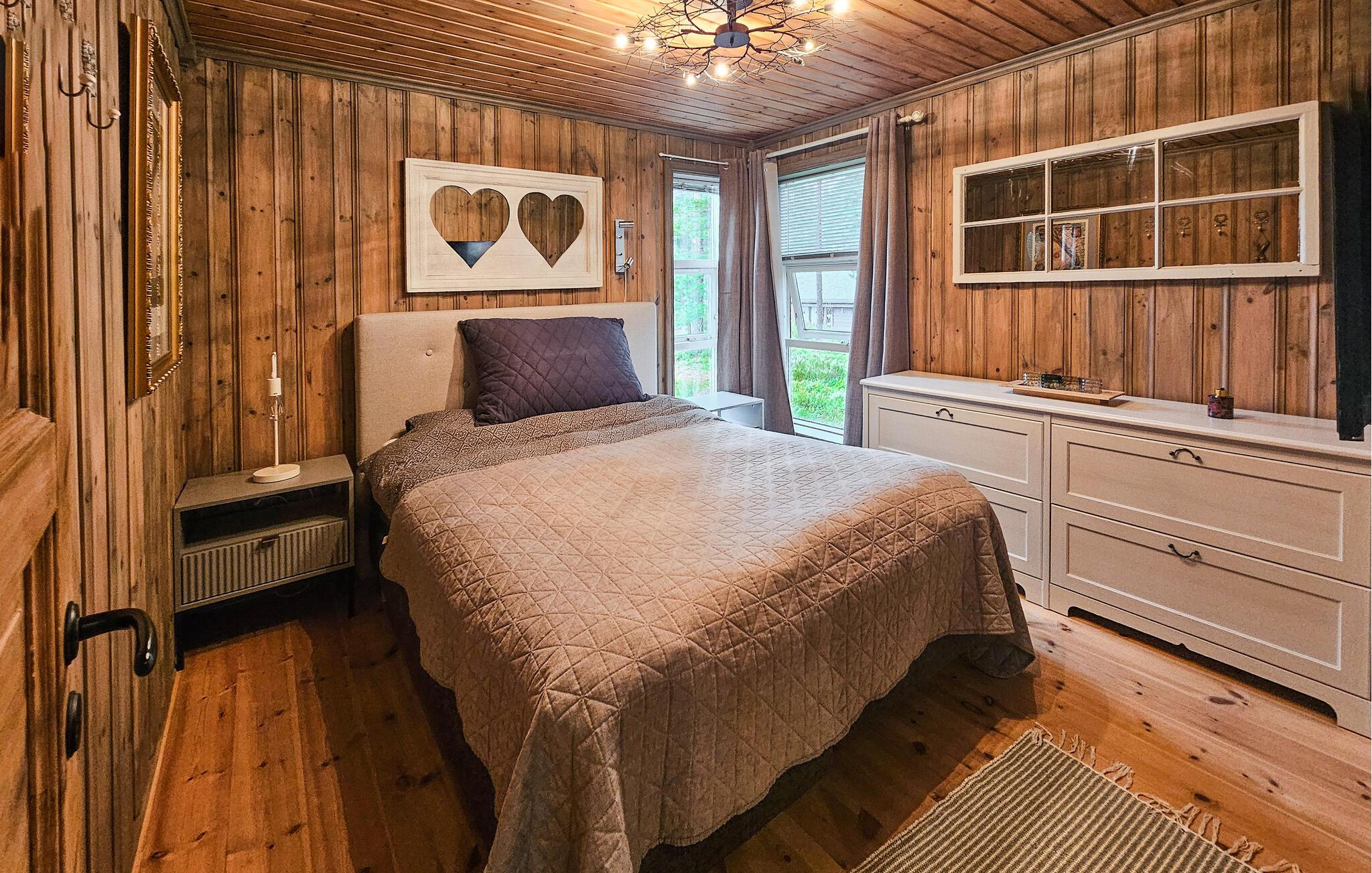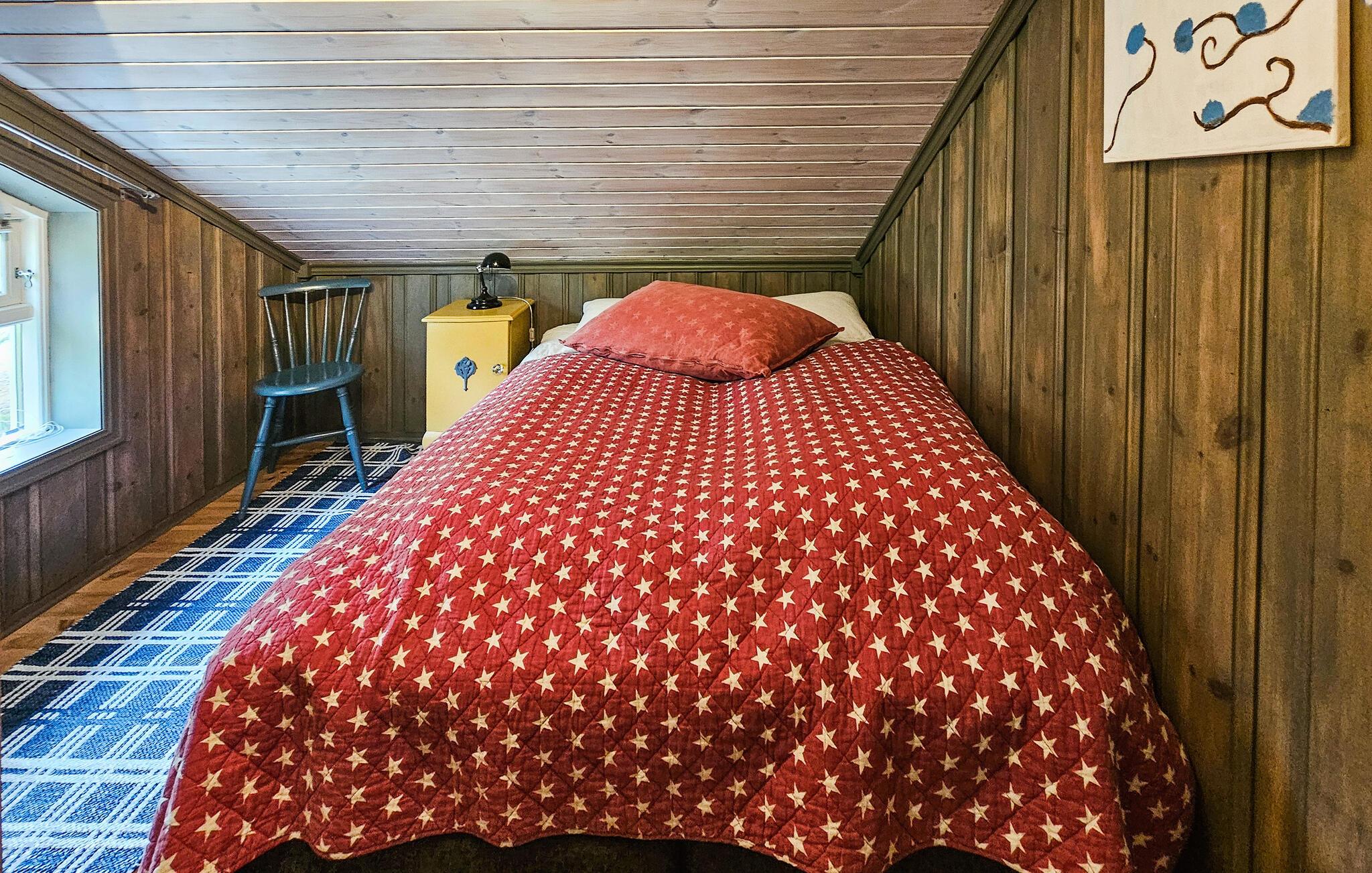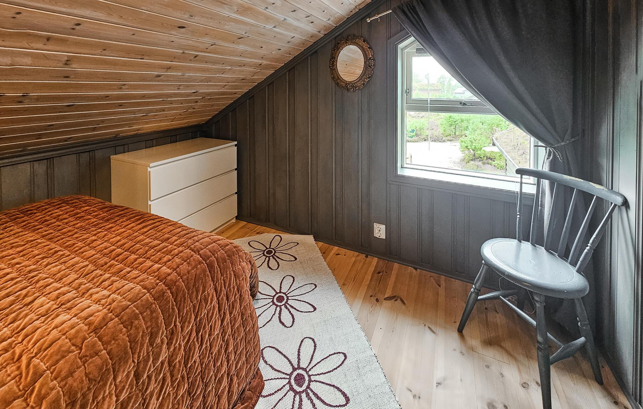 Stugan är smakfullt inredd, med vackra färger och stora fönster som släpper in mycket ljus. Vid matbordet kan du njuta av den vackra utsikten över omgivningarna samt av läckra måltider och göra upp en plan för de kommande dagarna. På första våningen finns ett vardagsrum där du kan titta på tv samt se ut över Nisser och båthamnen.