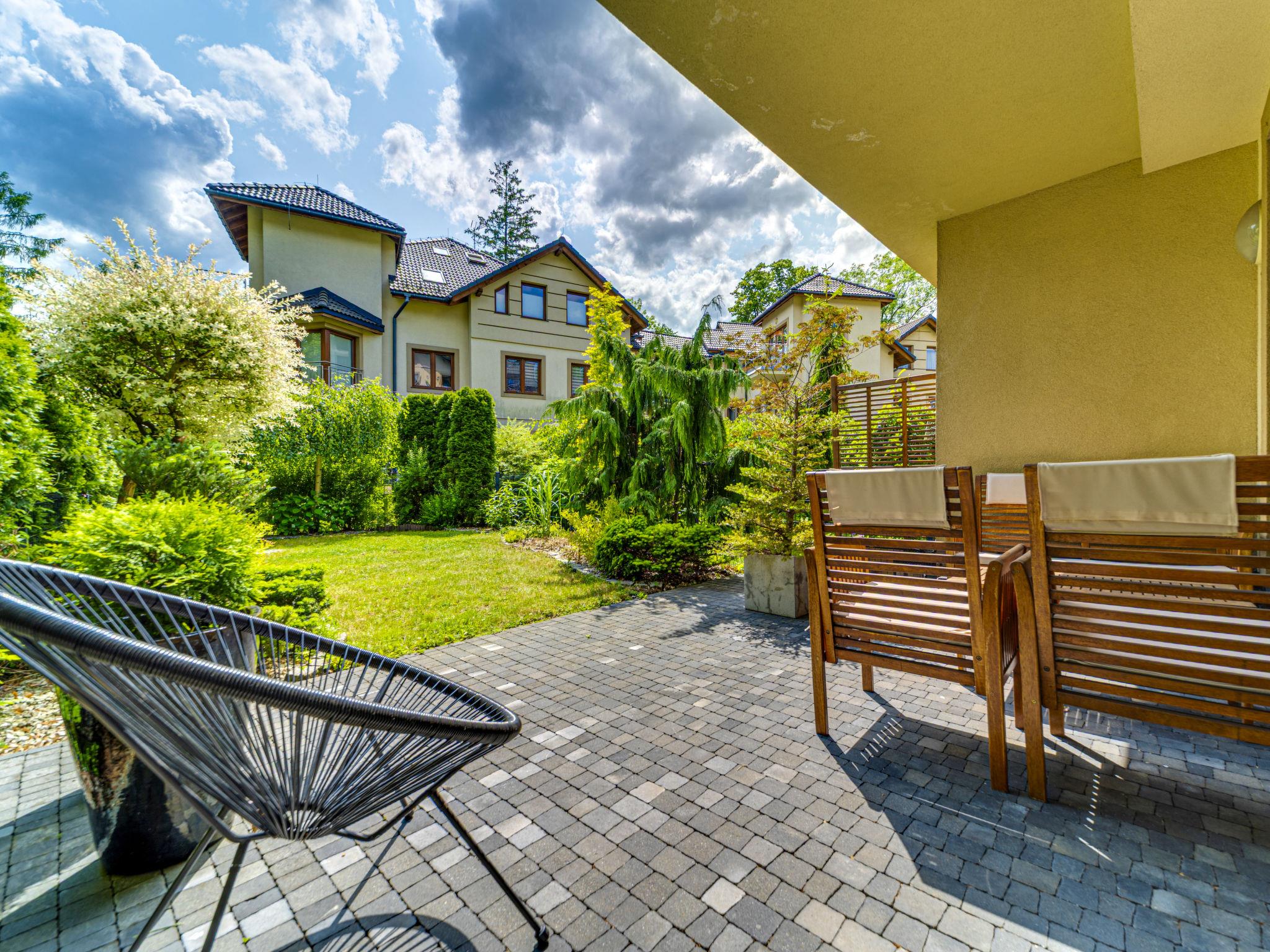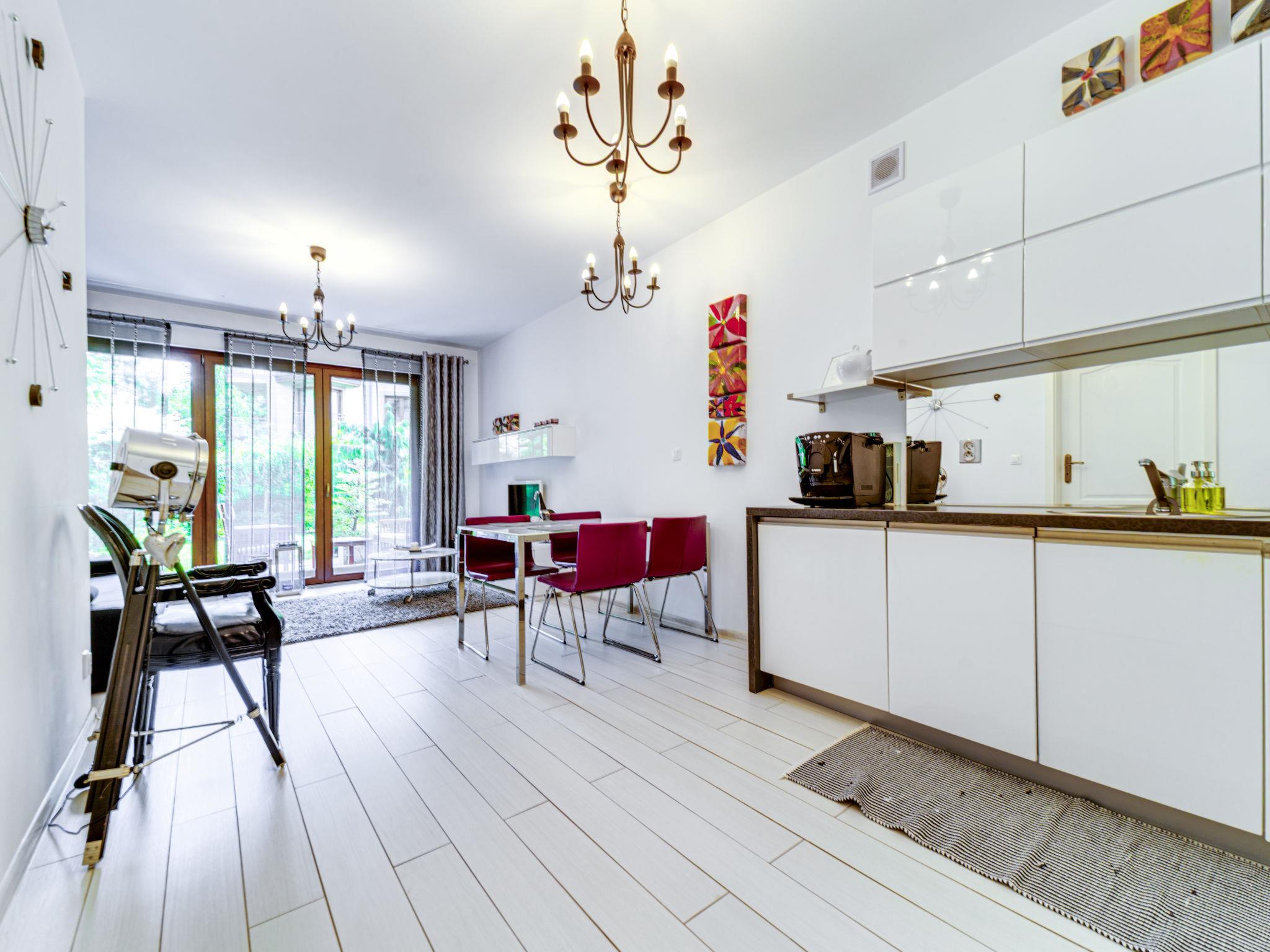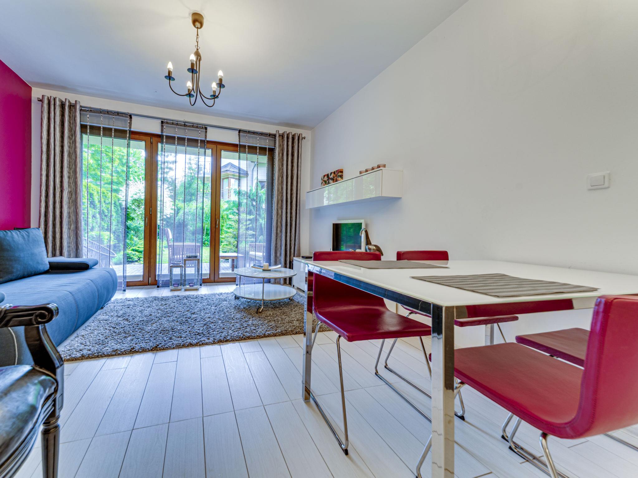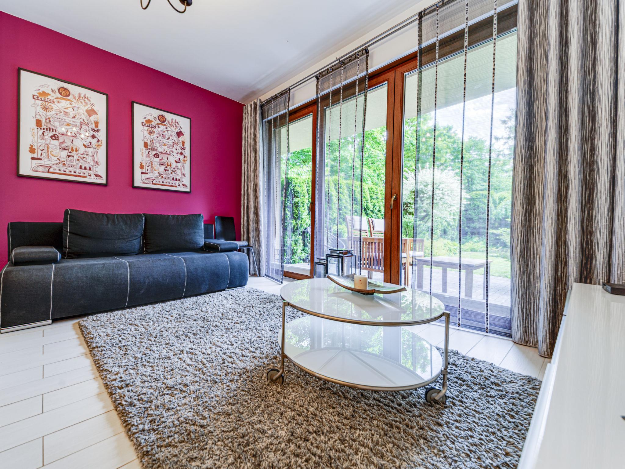 "Apartament Olszówka", 2-room apartment 50 m2, on the ground floor. Comfortable and modern furnishings: open living/dining room with 1 double sofabed (160 cm, length 220 cm), flat screen. Exit to the terrace. 1 room 12 m2 with 1 french bed (140 cm, length 220 cm). Open kitchen (oven, dishwasher, 4 induction hot plates, microwave, electric coffee machine). Shower/WC. Terrace, small garden 21 m2. Terrace furniture. Facilities: washing machine, dryer, iron, hair dryer. Internet (WiFi, free). Garage. Please note: 1 small pet/ dog allowed. TV only PL. Smoke alarm. Available: ironing board, wardrobe.