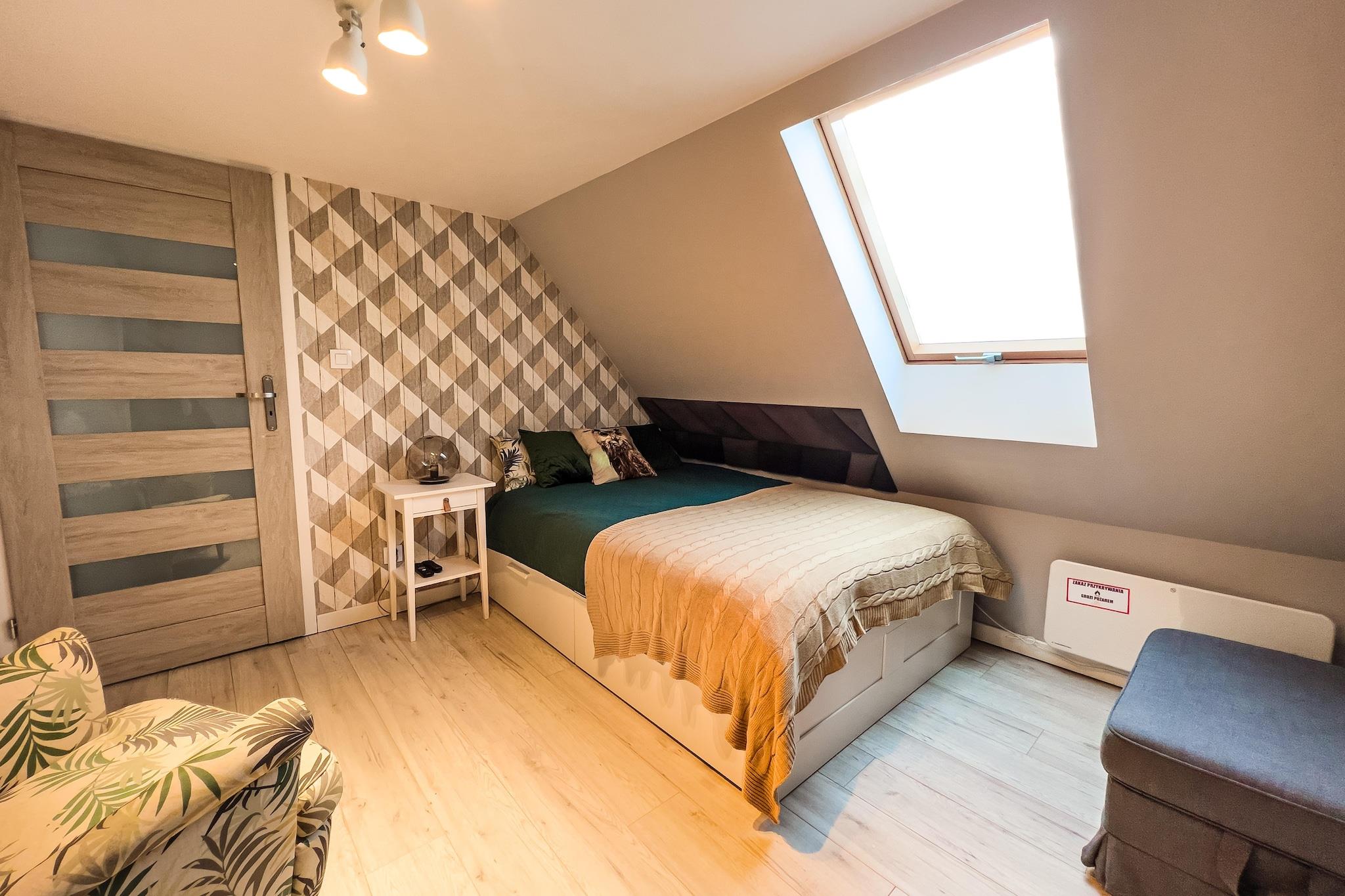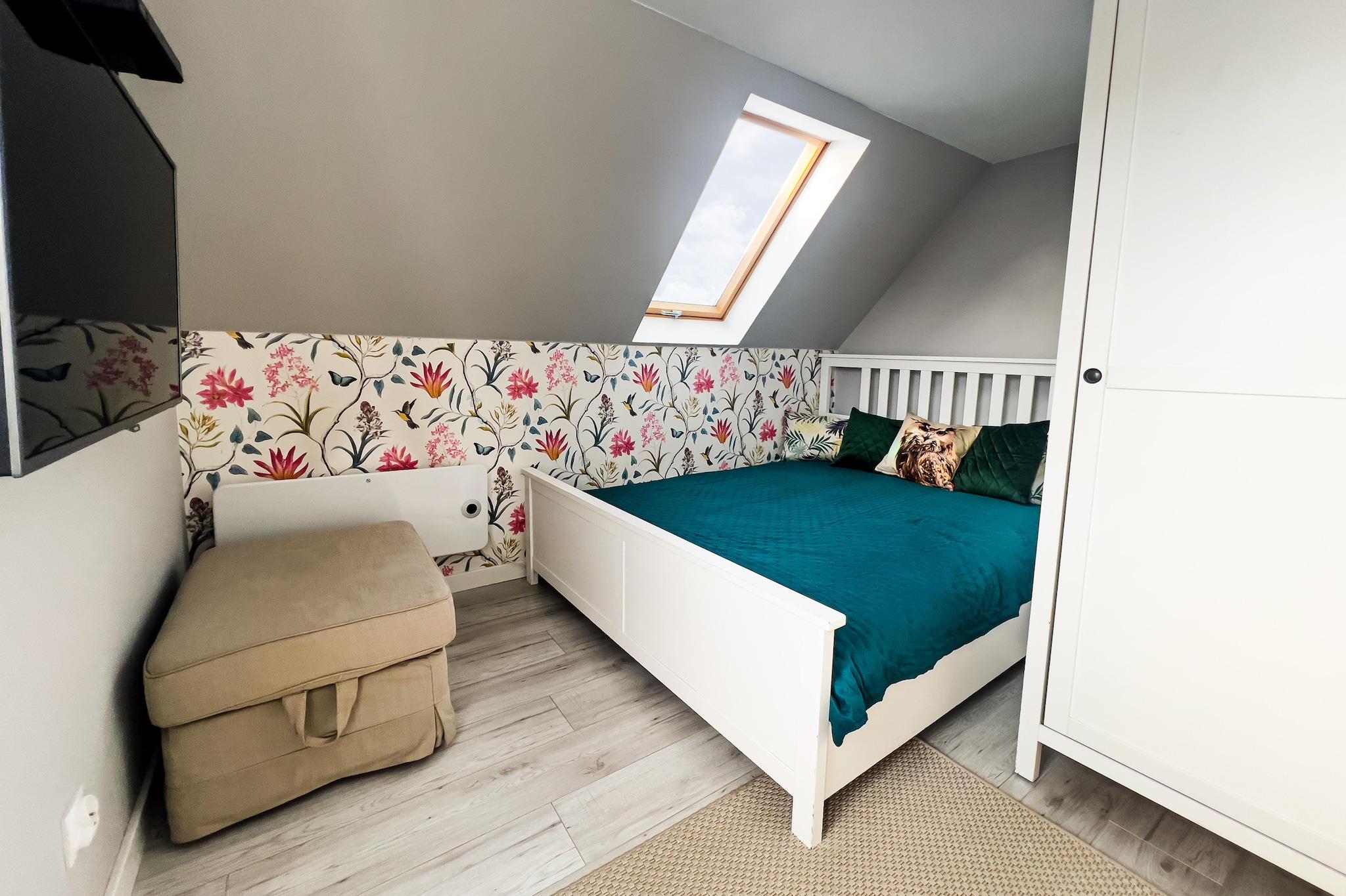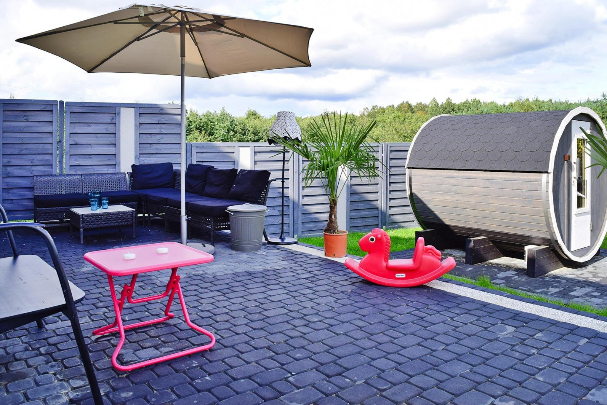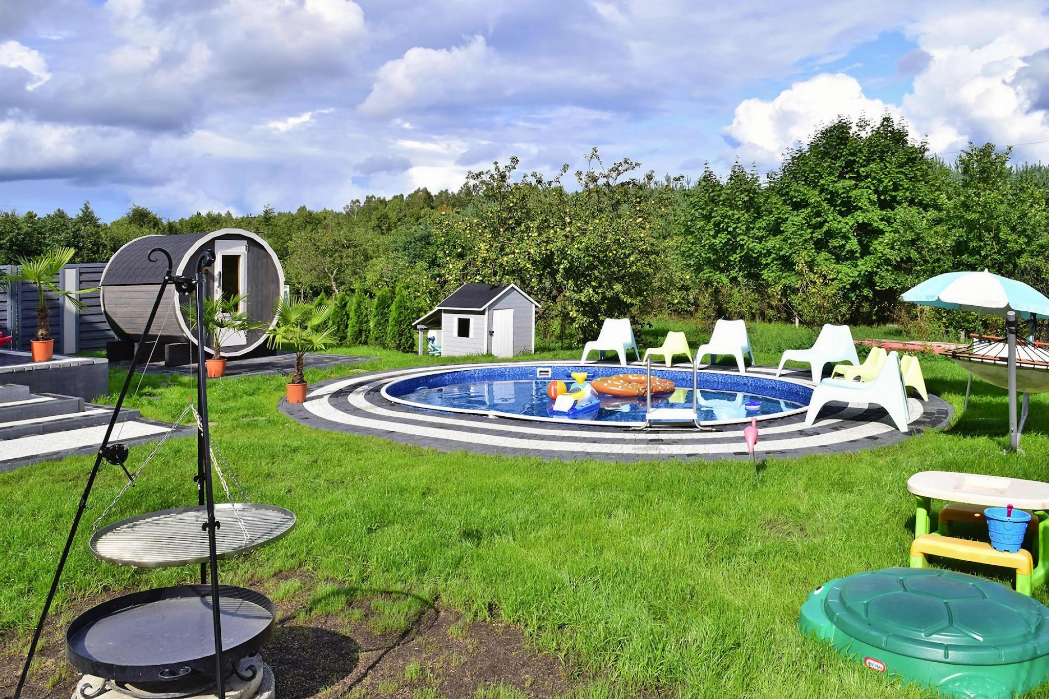 Ett bekvämt semesterhus med exceptionella fritidsfaciliteter (bastu, sommarpool), i ett vackert läge – en liten sommarort vid havet, direkt intill sjön Choczewskie (300 meter från huset). Detta stora tvåvåningshus väntar på dig på en privat, inhägnad tomt. På bottenvåningen hittar du ett vardagsrum (med TV och bäddsoffa för två personer), en matsal med öppen spis, ansluten till ett välutrustat kök (inklusive ugn, diskmaskin, kaffebryggare och tvättmaskin), ett sovrum med dubbelsäng och ett badrum med dusch. På övervåningen finns ytterligare tre separata sovrum. Huset har en täckt terrass med trädgårdsmöbler, solstolar och grillmöjligheter. Elvärme och öppen spis finns (ved ingår i priset). Trådlöst internet finns tillgängligt. På den välskötta tomten (för exklusivt bruk av gäster) finns en sommarpool (öppen från 1 maj till 15 september), en bastu och säker parkering. Ingår i priset: sängkläder, handdukar, el, vatten, värme, ved, bastu, sommarpool (1 maj – 15 september), internet, parkering och slutstädning. Spjälsäng och barnstol finns tillgängliga på begäran. Omgivningarna erbjuder ostörd avkoppling i kontakt med naturen. Det är värt att cykla (eller till och med promenera) runt den närliggande sjön och besöka flera charmiga sandstränder. Sjön är mycket ren och inbjuder till bad och fisk (gädda, ål, sutare). Du kan också besöka den större sjön, Zarnowieckie-sjön, där du kan hyra vattensportutrustning. Stranden vid havet ligger 12 km bort. Härlig avkoppling garanteras, eftersom det inte finns några folkmassor även under högsäsong. Och utsikten är enastående, särskilt i området kring Lubiatowskie-dynerna.