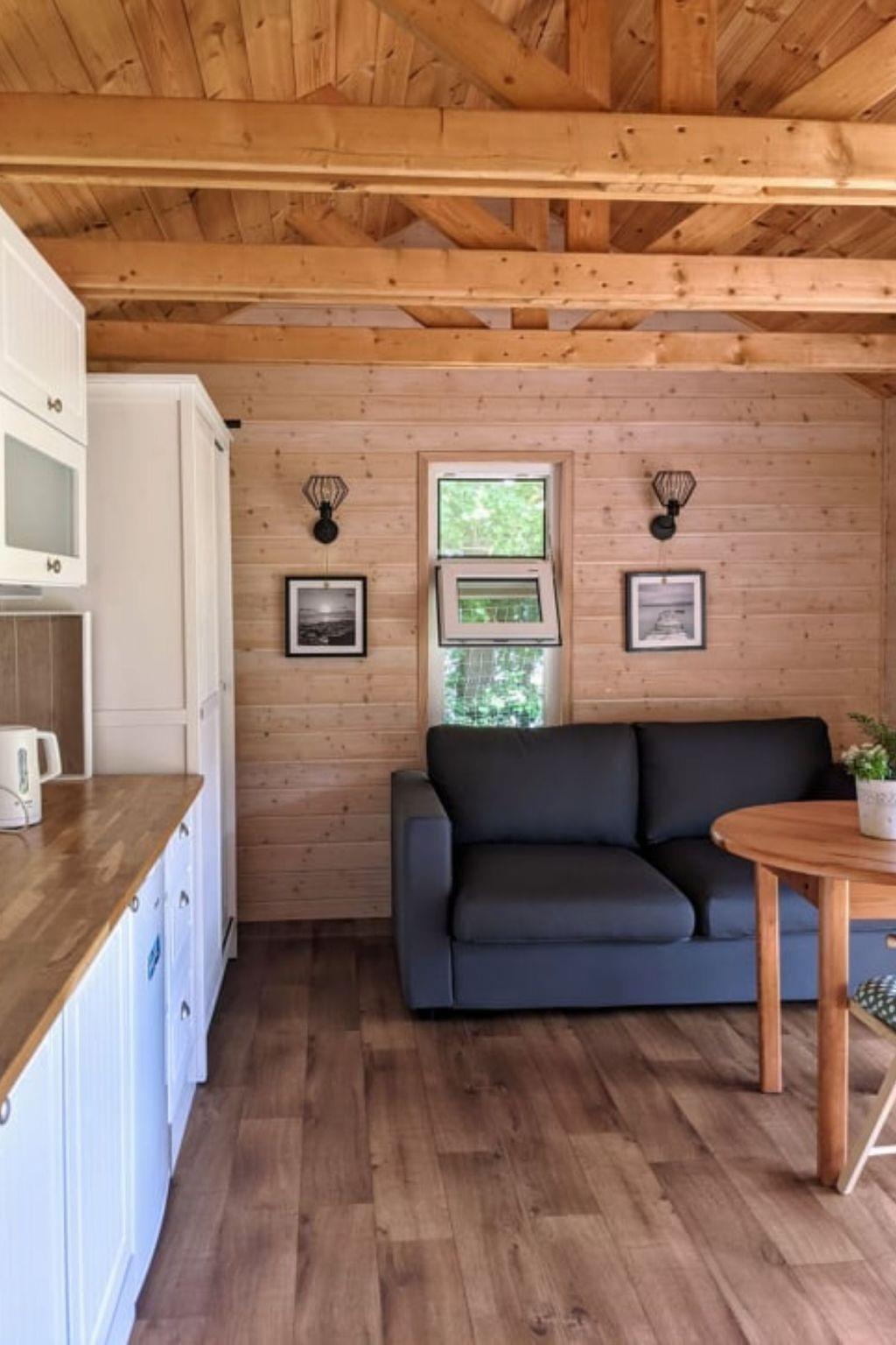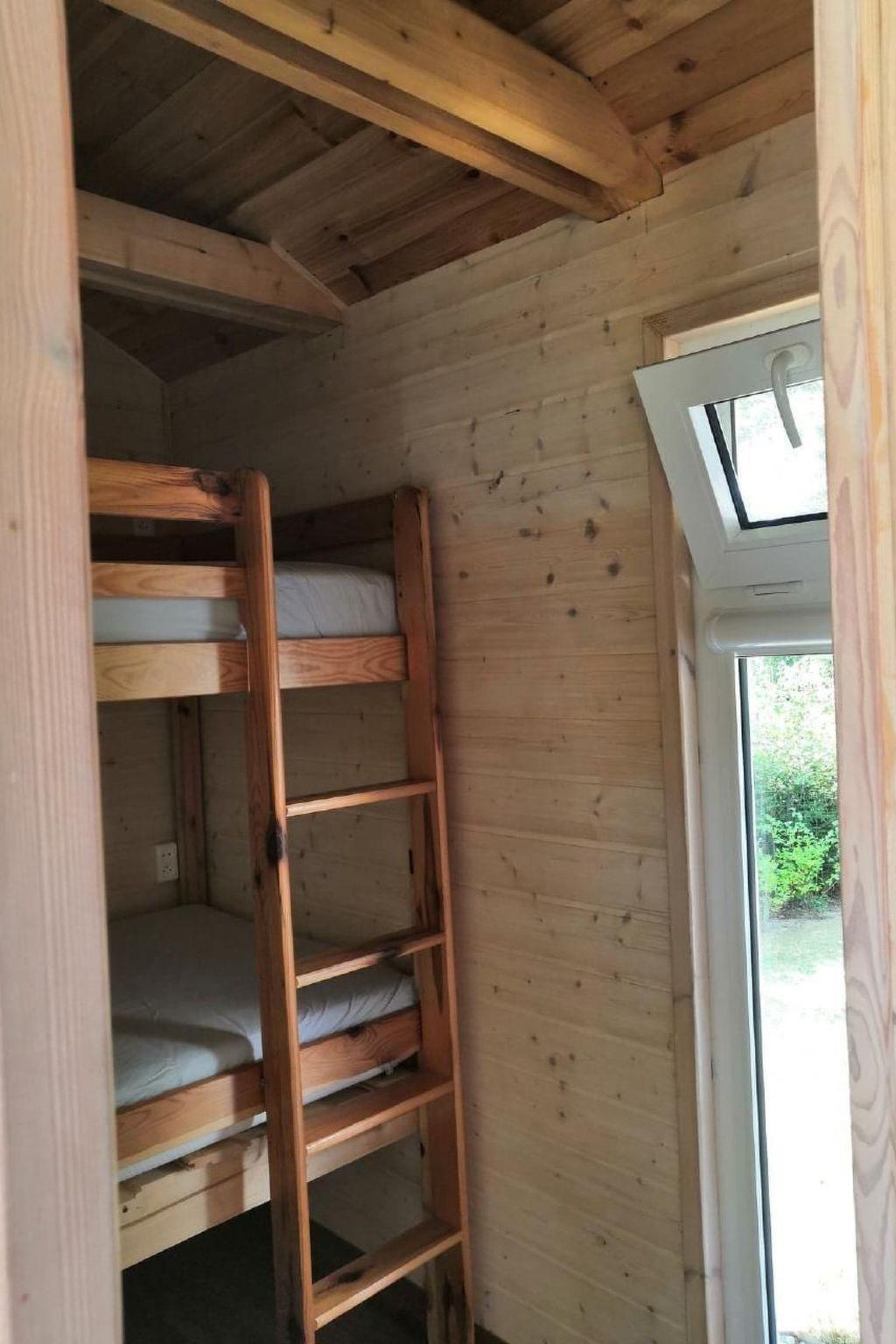 The interior of the 20 m² house offers a living room with kitchenette, equipped with a sofa bed for 2 persons, a bedroom with bunk bed (2 mattresses 190/80 cm) and a bathroom with toilet and shower. There is also an electric cooker, fridge, kettle, a complete set of pots, plates, cutlery, as well as an electric heater and a hammock to make your stay comfortable and hassle-free.
