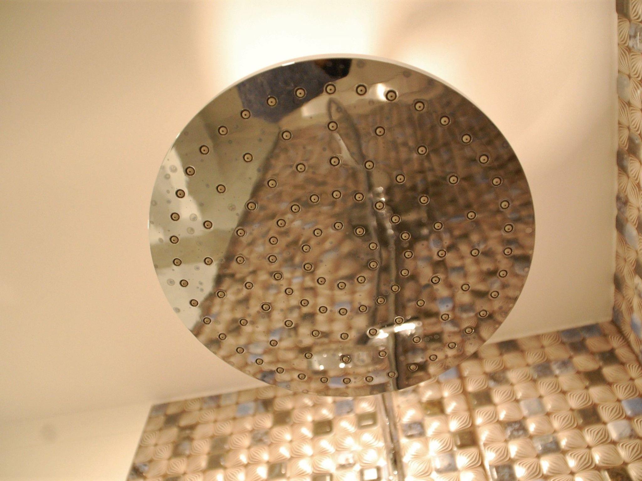 In the bathroom, shower with rain shower, hairdryer, towels.
