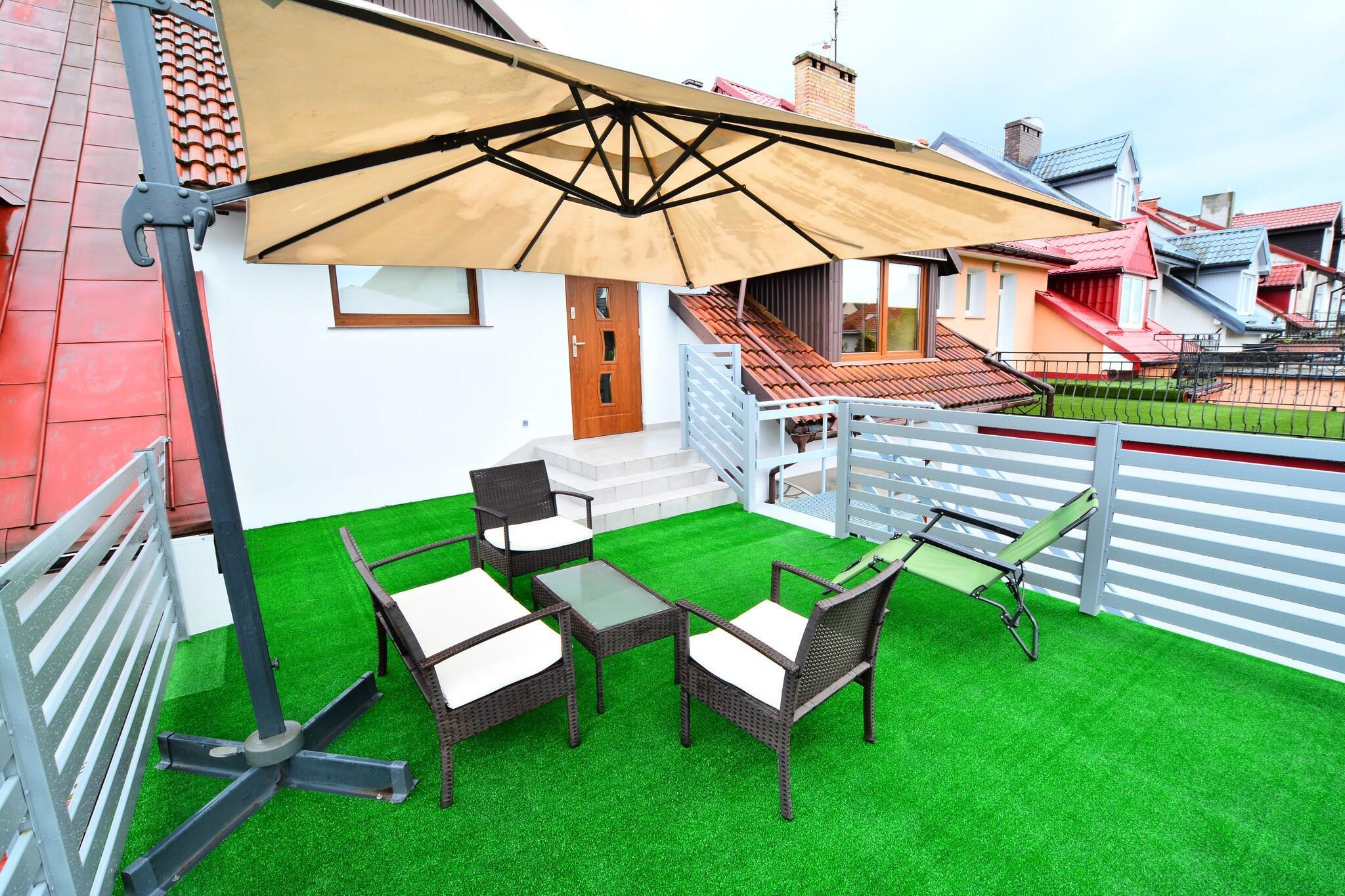Lägenheten ligger i en lugn villagård och har en rymlig terrass från vilken du kan se omgivningarna. På terrassen finns en uppsättning trädgårdsmöbler och ett parasoll. Lägenheten är förberedd för 5 personer. Den har en egen, oberoende ingång från utsidan. Det rymliga vardagsrummet ligger i anslutning till ett välutrustat kök. Det finns ett separat sovrum och badrum med dusch. Utrustningen inkluderar en tvättmaskin. I priset för vistelsen ingår: sänglinne, handdukar, el- och vattenförbrukning, värme, slutstädning, parkering, barnsäng, barnstol. Lägenheten ligger på ett sådant ställe att du bekvämt kan ta dig till både den lugnare stranden på den västra stranden av floden (Parseta), såväl som den bullrigare stranden på den östra stranden av floden, där det finns fler attraktioner (vatten sport etc.). Den största attraktionen på kurorten Kolobrzeg är utan tvekan den breda stranden. Dessutom finns det många vandringsleder i strandparken, längs strandpromenaden, på den historiska piren och i gamla stan. Det är värt att besöka den lokala fyren, oceanariumet, hamnen och katedralen. Sevärdheter i området: för barnfamiljer rekommenderar vi att besöka nöjesparken Pomerania Fun Park. Det är en året runt-park som ligger i byn Dygowo (ca 15 km från Kolobrzeg). Det erbjuder många karuseller och studsmattor. Det finns en vikingaby, en minizoo och många andra attraktioner. I Kolobrzeg är det också värt att besöka en indisk by, där du kan lära dig om regionerna med ursprungskulturer i Nordamerika. Den internationella cykelvägen R-10 går genom resorten, vilket gör att du enkelt och trevligt kan utforska de närliggande städerna på cykel: Grzybowo, Dzwirzyno, Sianozety, Ustronie Morskie.