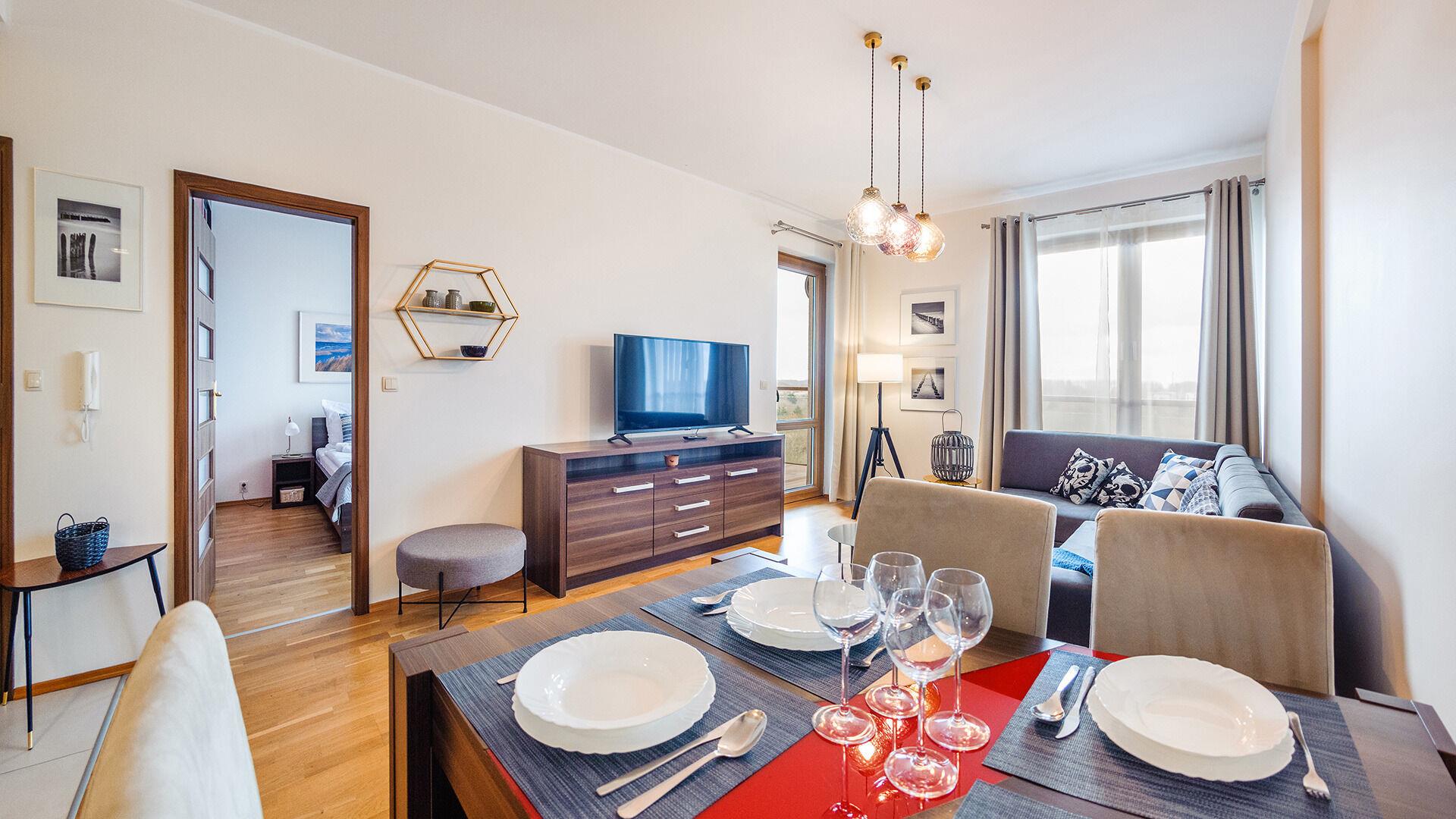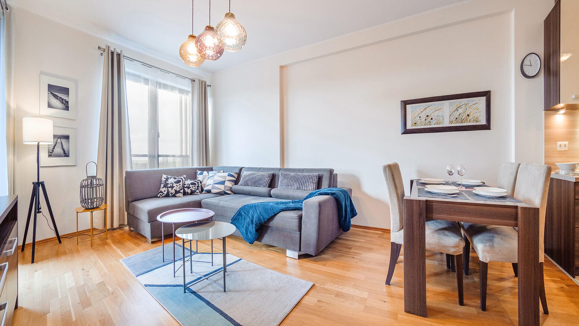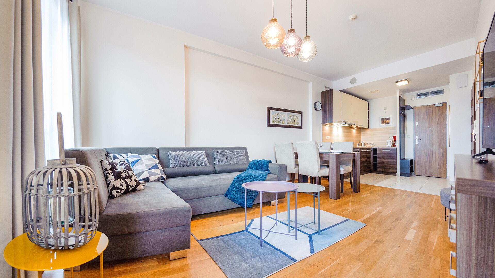 • Haustiere sind in der ausgewählten Wohnung erlaubt. Die Kosten für den Aufenthalt mit einem Haustier betragen 40 PLN pro Tag.