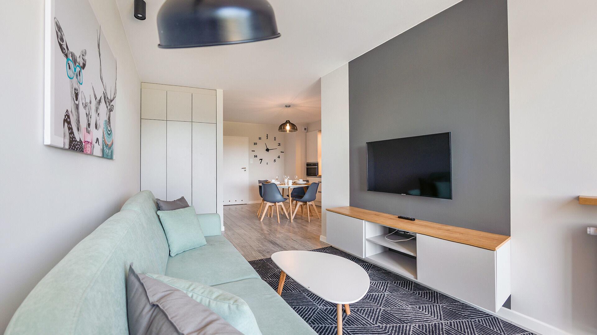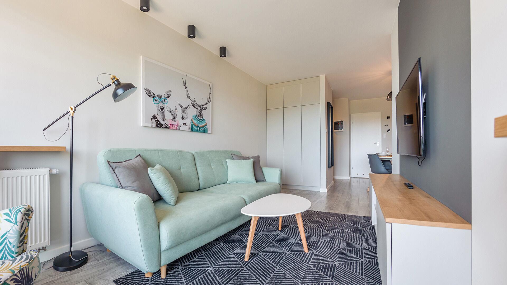 • Haustiere sind in der ausgewählten Wohnung erlaubt. Die Kosten für den Aufenthalt mit einem Haustier betragen 40 PLN pro Tag.