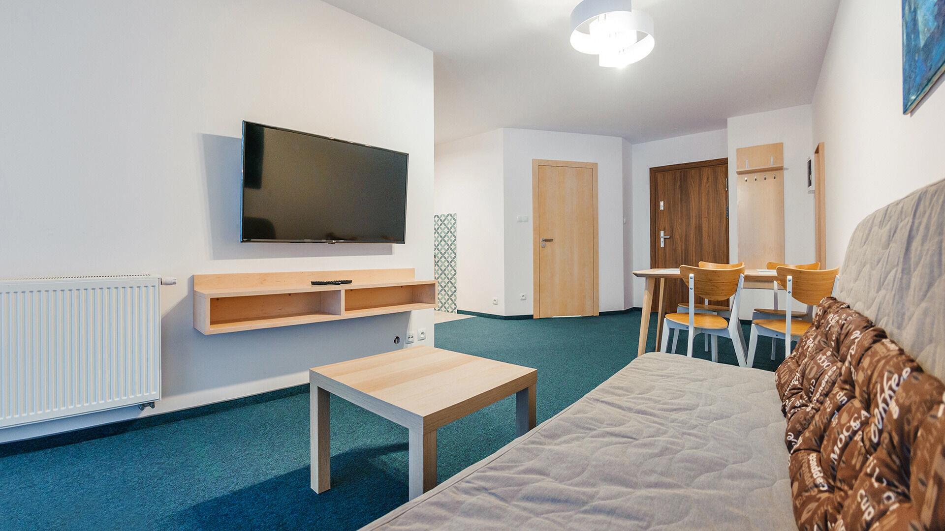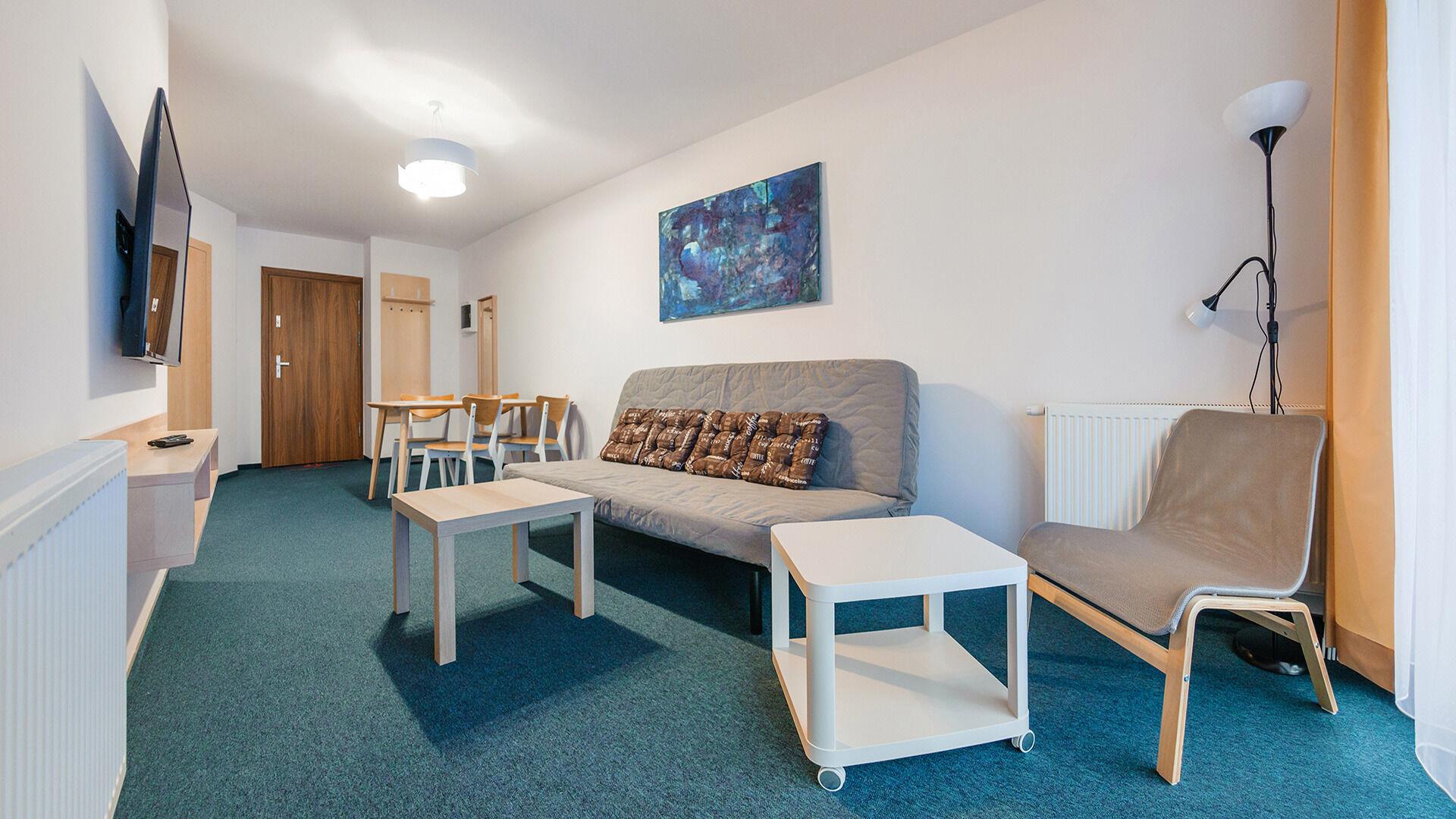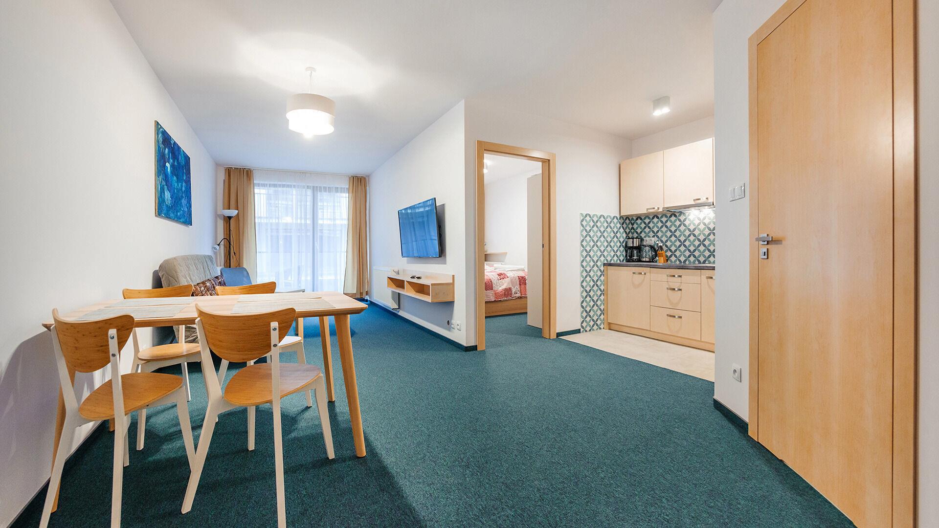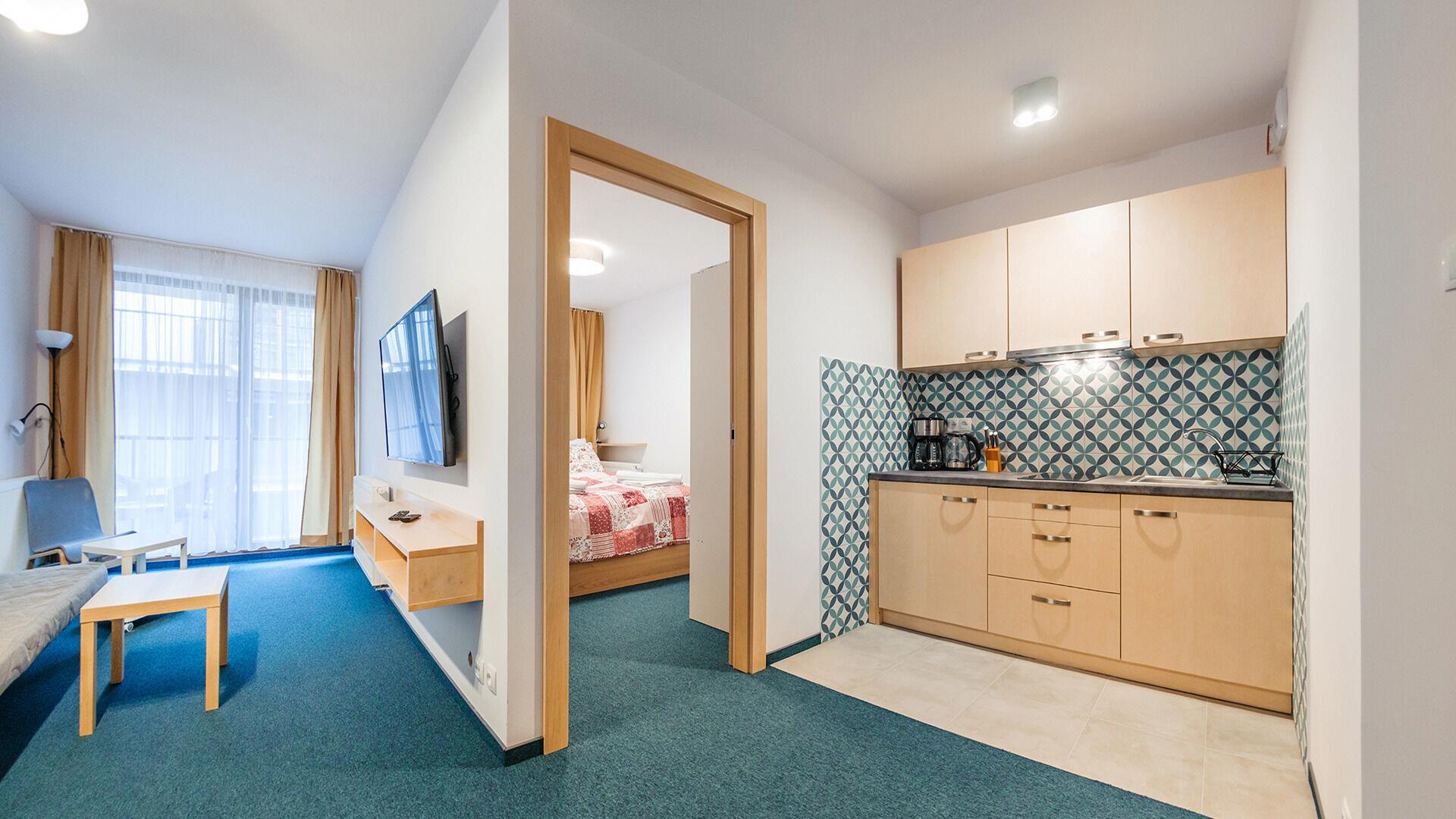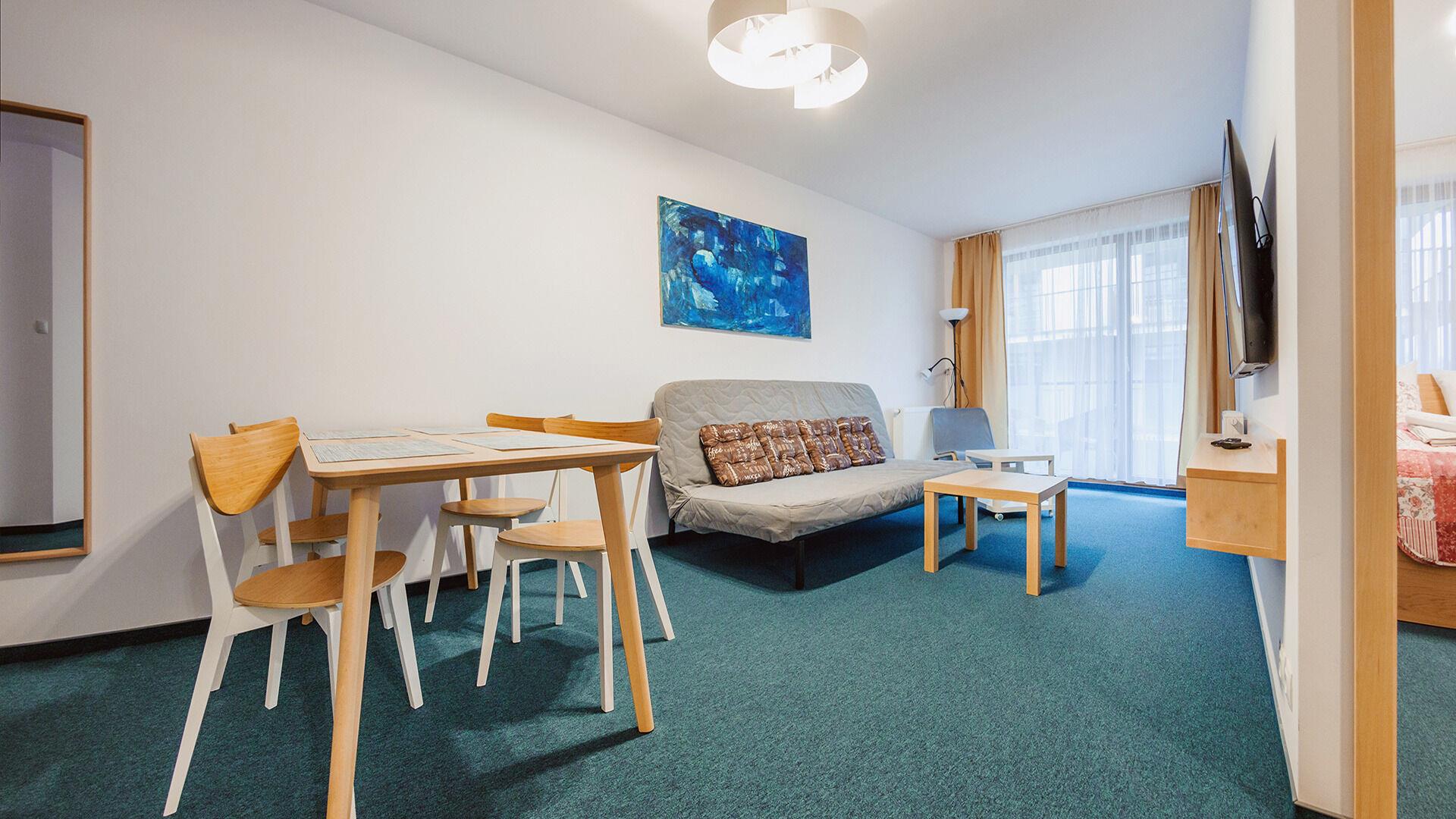 Die Apartments im Objekt Resorts Kolobrzeg befinden sich im westlichen Teil von Kolobrzeg, abseits des städtischen Trubels, umgeben vom Grün des NATURA-2000-Parks. Diese Lage garantiert saubere Luft, malerische Ausblicke und direkten Kontakt zur Natur. Die Plazowa-Straße mit ihren breiten Gehwegen und Radwegen ist ein Teil der R10-Fahrradroute. Ein fünfminütiger Spaziergang über einen direkten Zugang zum Meer reicht aus, um den breiten, sandigen „Weststrand” zu erreichen; ganz in der Nähe befindet sich auch ein Hundestrand. Alle Apartments sind hochwertig ausgestattet und verfügen über funktionale, voll ausgestattete Küchenzeilen sowie geräumige Terrassen mit Blick auf den Innenhof oder das Grün des NATURA-2000-Parks. Vor dem Gebäude gibt es einen öffentlichen, kostenpflichtigen Stadtparkplatz (begrenzte Anzahl an Stellplätzen). Auf dem Gelände stehen ein nummerierter Außenparkplatz sowie Parkplätze in der Tiefgarage zur Verfügung, die den meisten Apartments zugeordnet sind und gegen Aufpreis genutzt werden können. Im Objekt befindet sich ein Schwimmbad, das täglich von 10:00 bis 21:00 Uhr geöffnet ist, sowie eine Sauna, die täglich von 16:00 bis 21:00 Uhr geöffnet ist. Der Pool befindet sich im Gebäude A; aus Gebäude B gibt es keinen direkten Zugang zu Gebäude A.