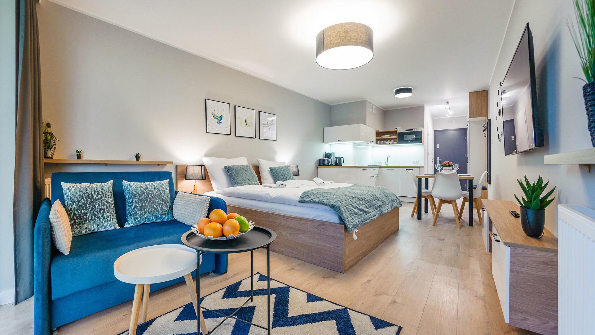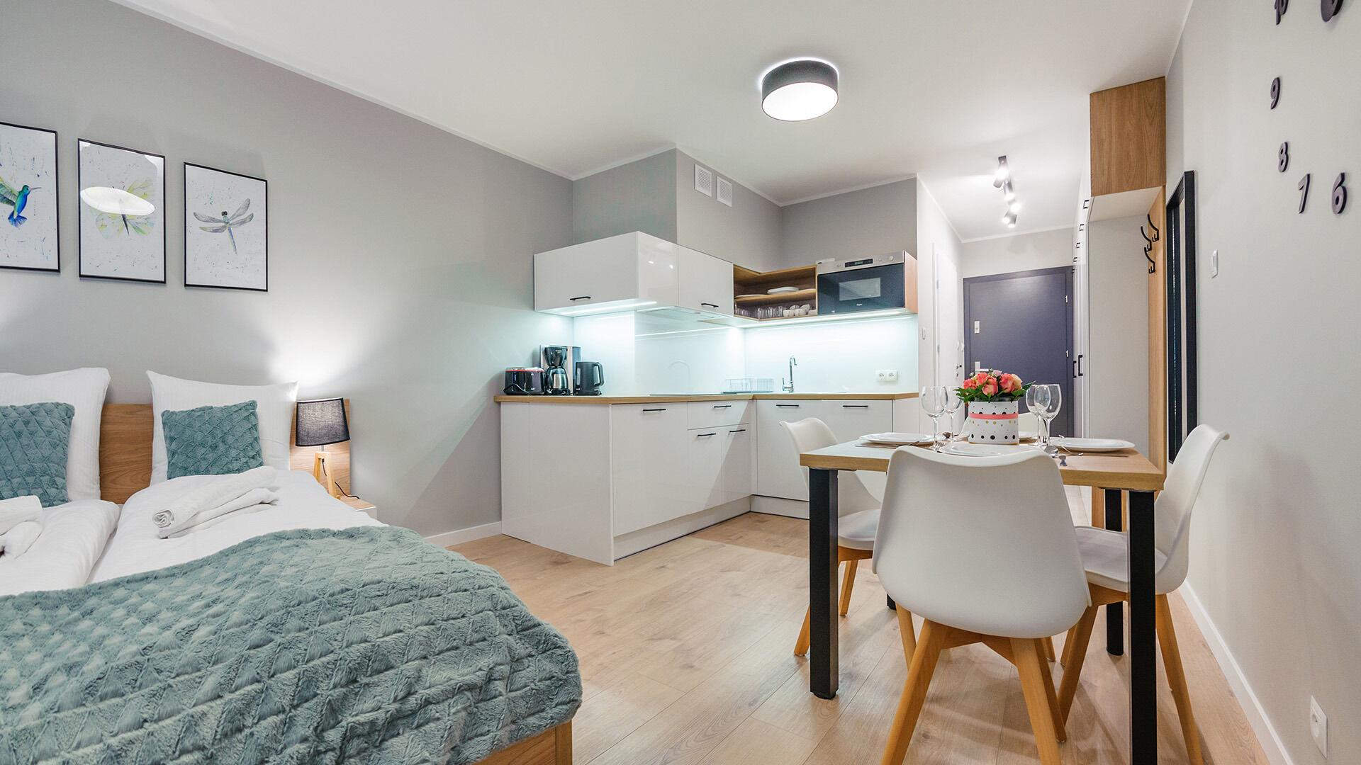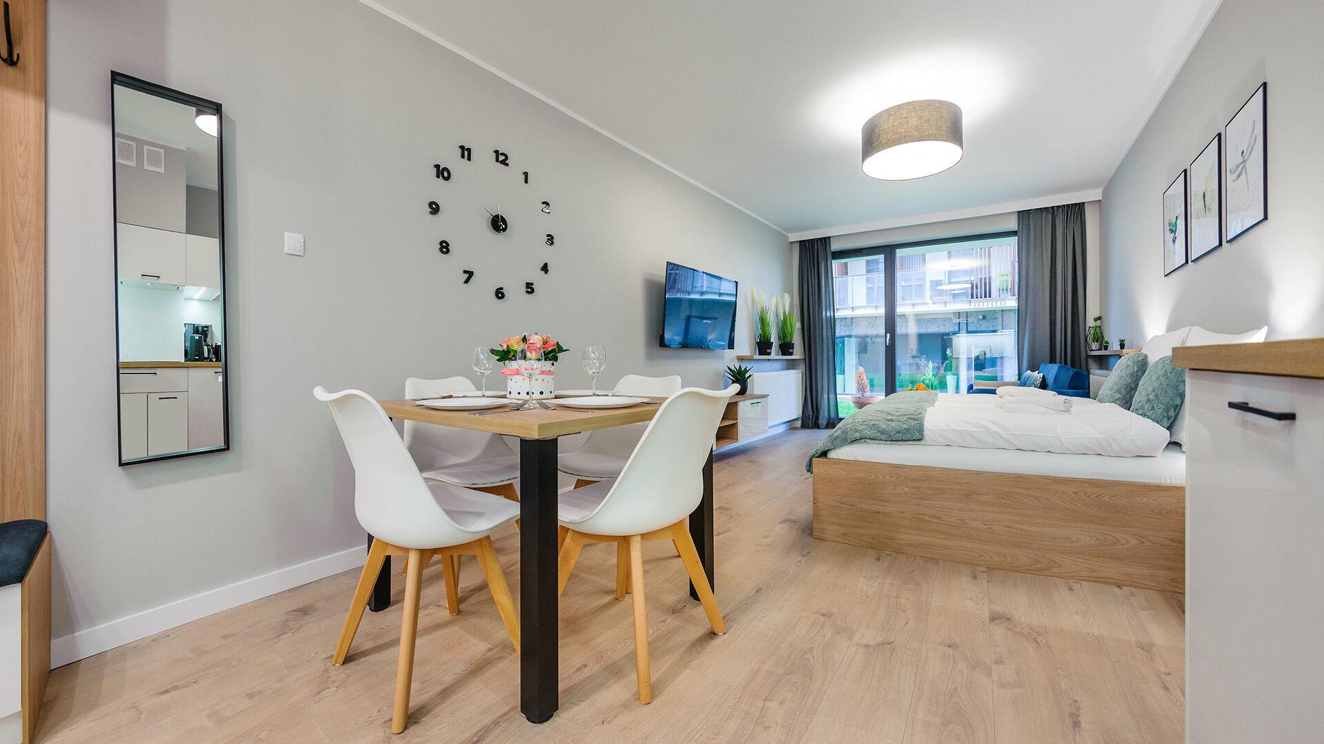 • Haustiere sind in der ausgewählten Wohnung erlaubt. Die Kosten für den Aufenthalt mit einem Haustier betragen 40 PLN pro Tag.