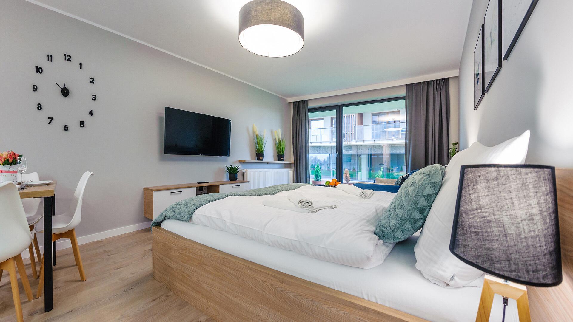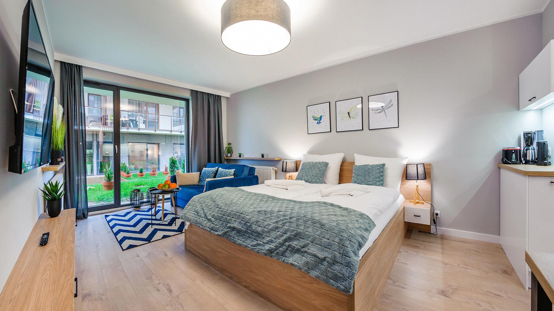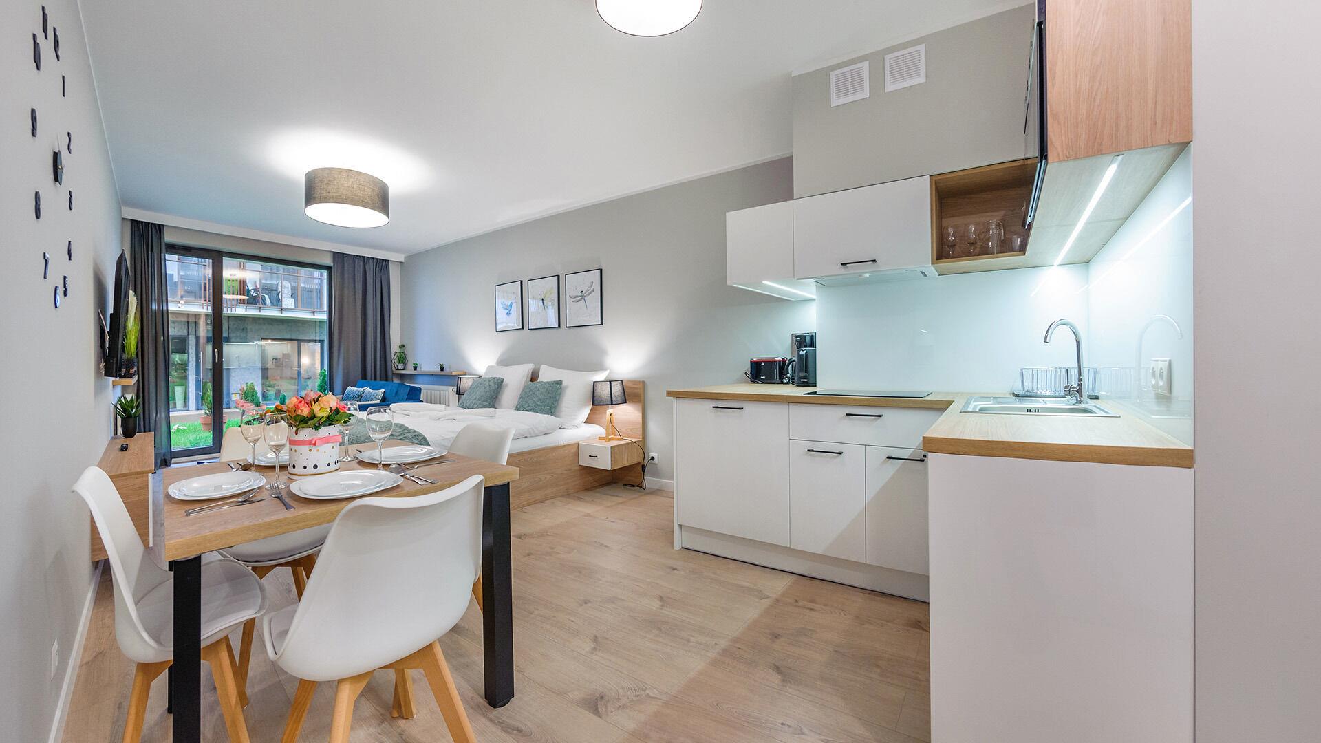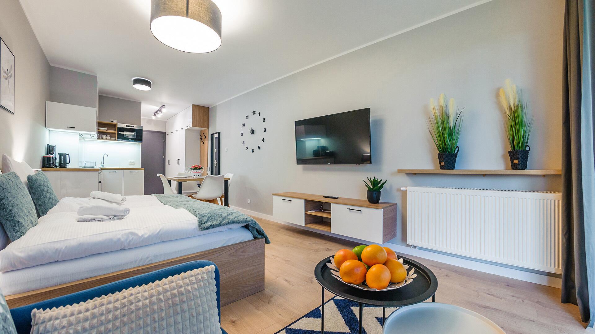 • Haustiere sind in der ausgewählten Wohnung erlaubt. Die Kosten für den Aufenthalt mit einem Haustier betragen 40 PLN pro Tag.
