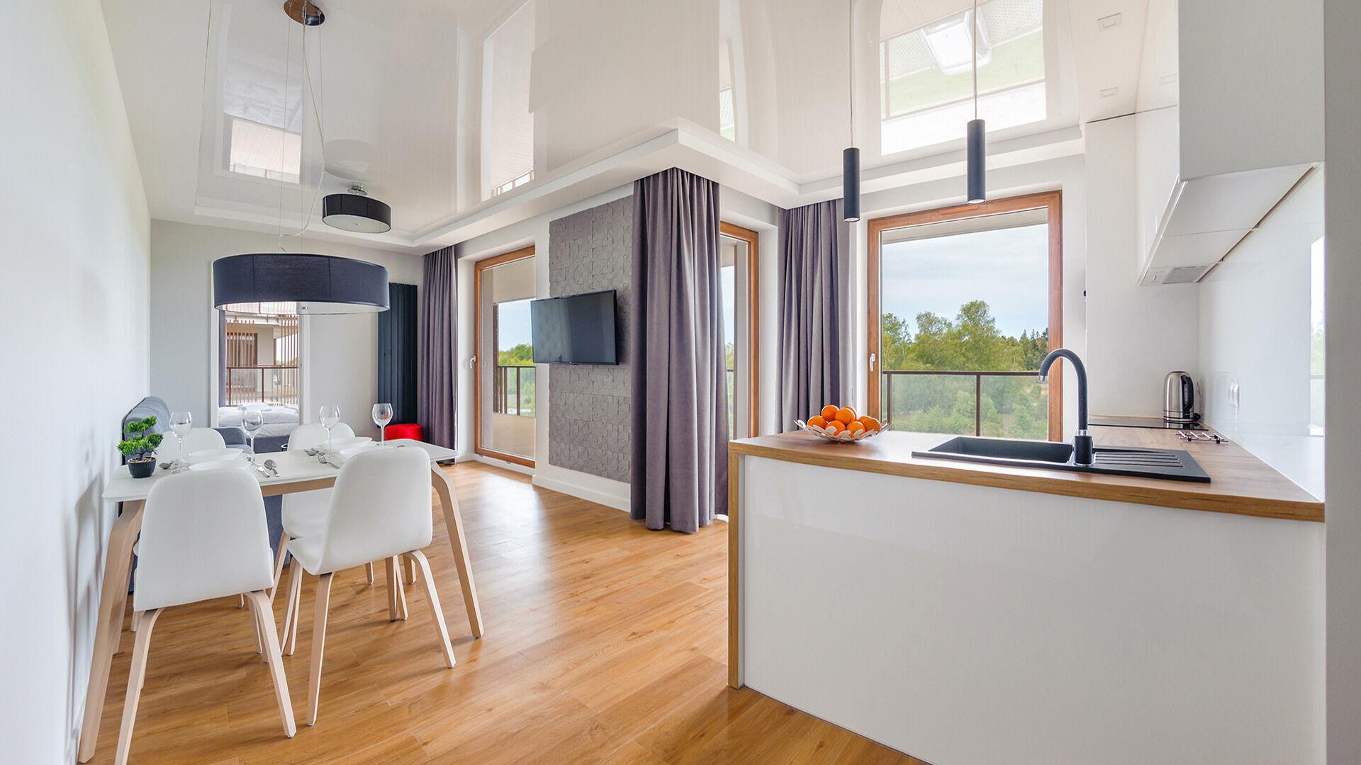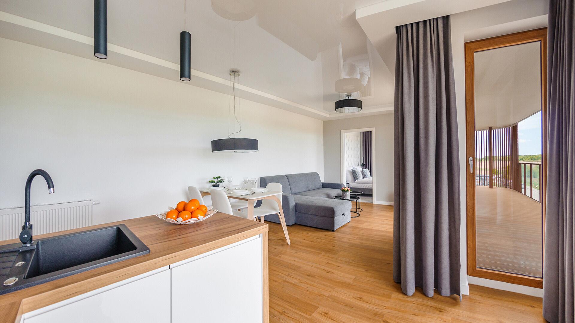 Die Apartments im Objekt Resorts Kolobrzeg befinden sich im westlichen Teil von Kolobrzeg, abseits des städtischen Trubels, umgeben vom Grün des NATURA-2000-Parks. Diese Lage garantiert saubere Luft, malerische Ausblicke und direkten Kontakt zur Natur. Die Plazowa-Straße mit ihren breiten Gehwegen und Radwegen ist ein Teil der R10-Fahrradroute. Ein fünfminütiger Spaziergang über einen direkten Zugang zum Meer reicht aus, um den breiten, sandigen „Weststrand” zu erreichen; ganz in der Nähe befindet sich auch ein Hundestrand. Alle Apartments sind hochwertig ausgestattet und verfügen über funktionale, voll ausgestattete Küchenzeilen sowie geräumige Terrassen mit Blick auf den Innenhof oder das Grün des NATURA-2000-Parks. Vor dem Gebäude gibt es einen öffentlichen, kostenpflichtigen Stadtparkplatz (begrenzte Anzahl an Stellplätzen). Auf dem Gelände stehen ein nummerierter Außenparkplatz sowie Parkplätze in der Tiefgarage zur Verfügung, die den meisten Apartments zugeordnet sind und gegen Aufpreis genutzt werden können. Im Objekt befindet sich ein Schwimmbad, das täglich von 10:00 bis 21:00 Uhr geöffnet ist, sowie eine Sauna, die täglich von 16:00 bis 21:00 Uhr geöffnet ist. Der Pool befindet sich im Gebäude A; aus Gebäude B gibt es keinen direkten Zugang zu Gebäude A.