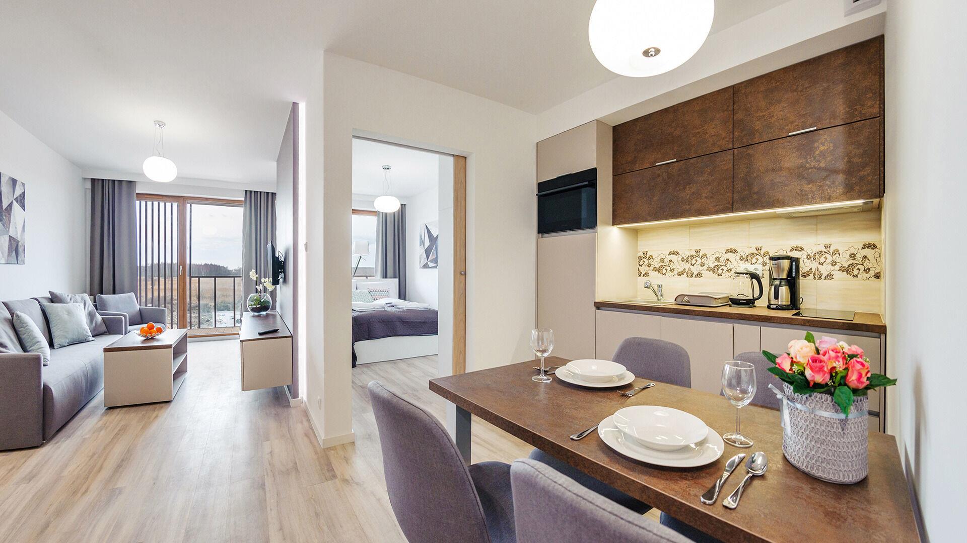 Die Apartments im Resorts Kolobrzeg liegen im ruhigen, westlichen Teil der Stadt, umgeben vom NATURA-2000-Park und nur wenige Minuten vom breiten Weststrand sowie einem Hundestrand entfernt. Die Lage bietet saubere Luft, direkten Kontakt zur Natur und Zugang zu Rad- und Spazierwegen. Die Apartments sind hochwertig ausgestattet und verfügen über voll ausgestattete Küchenzeilen sowie große Terrassen. Auf dem Gelände stehen nummerierte Außenparkplätze und Tiefgaragenplätze gegen Aufpreis zur Verfügung, zudem gibt es einen öffentlichen, kostenpflichtigen Parkplatz vor dem Gebäude. Gästen stehen ein täglich geöffneter Pool sowie eine Sauna zur Verfügung. Kolobrzeg bietet das ganze Jahr über zahlreiche Freizeit- und Kulturangebote sowie eine vielfältige Gastronomie.