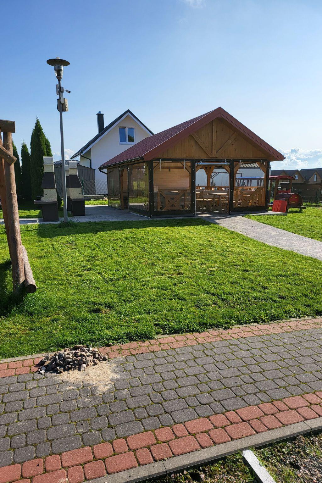 The fenced area has a barbecue area, a children's playground with swings, slide, sandpit and trampoline. There are sun loungers and a parasol in each cottage. There is a parking space on the premises (included in the price 1 space per house).