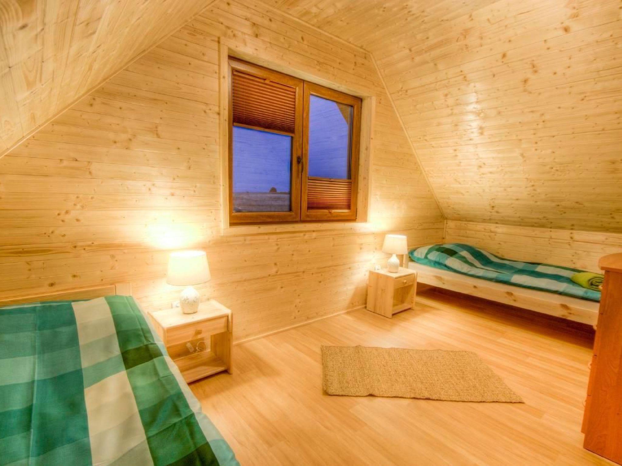 The interior of each cottage is comfortably furnished to ensure maximum comfort for guests during their stay. The living room with a dining area is equipped with a double sofa bed, a TV, a table with chairs and a wardrobe, providing a cosy space to spend time together. The kitchen offers everything you need to prepare meals: cutlery, crockery, kettle, pots and pans, fridge, microwave, toaster, coffee machine and spices, as well as accessories needed for barbecues. The two comfortable bedrooms, one of which has direct access to the terrace, are equipped with comfortable beds, chests of drawers, nightstands and are insulated with radiators for warmth on colder days.