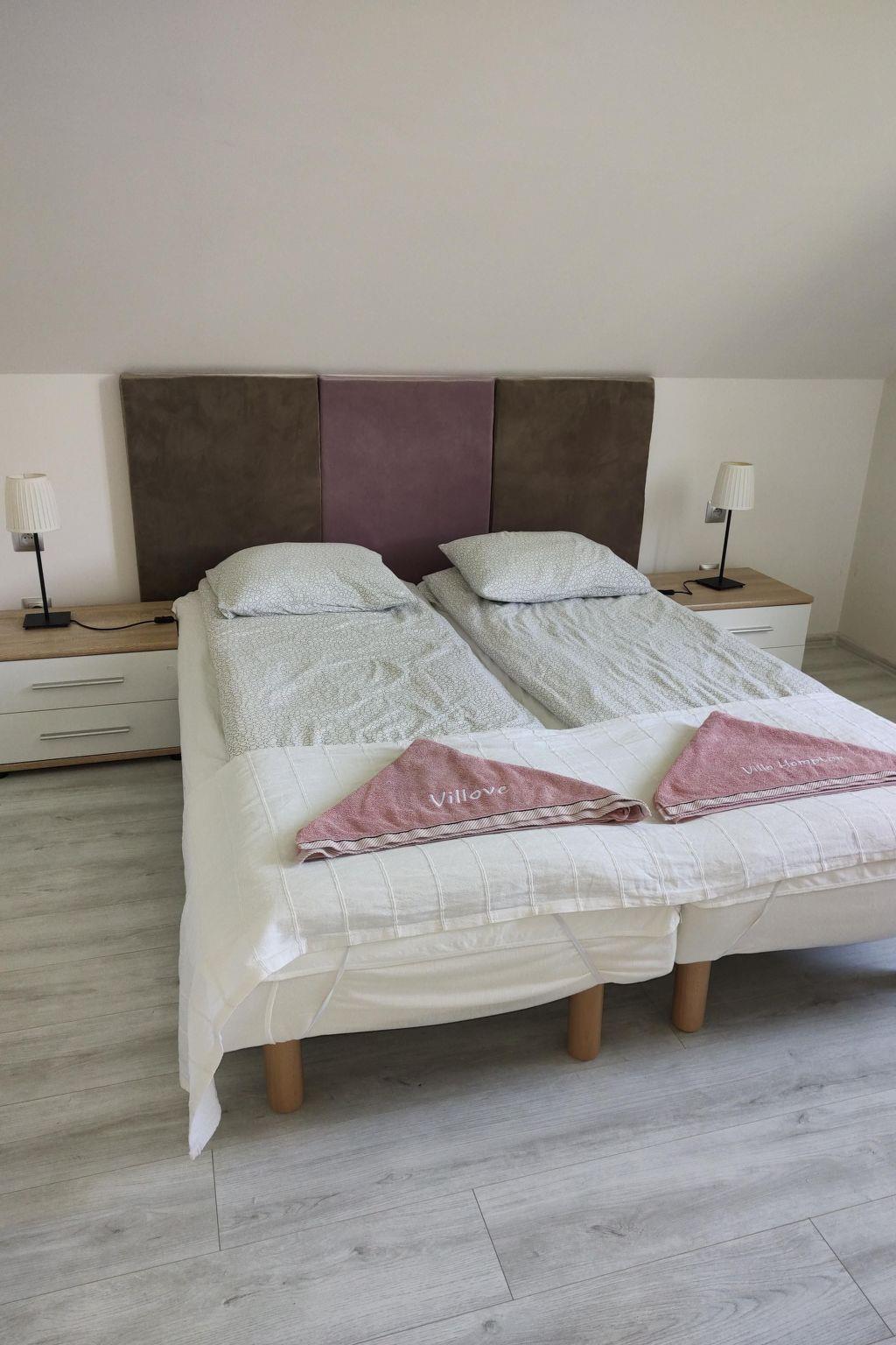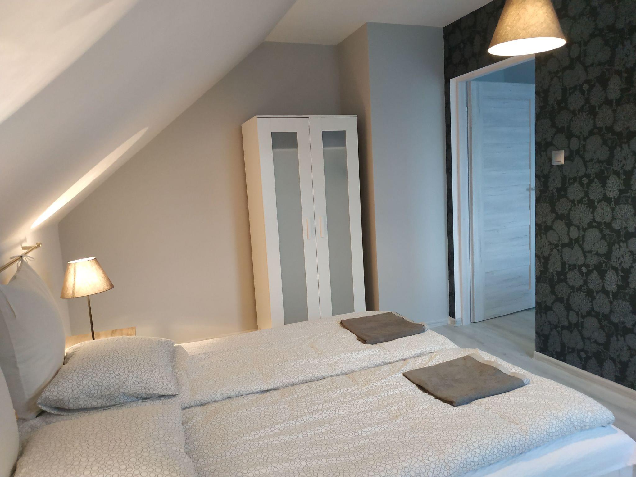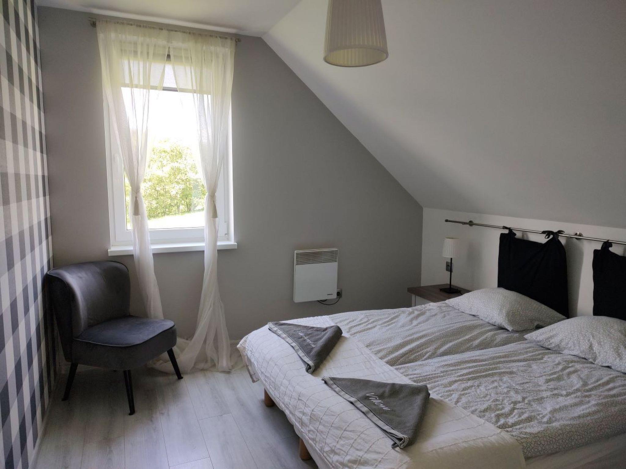 The living space totals 100m², with a modern and fully-equipped kitchen (10m²) on the ground floor, including a fridge with a freezer compartment, a stove, a microwave and a coffee machine. Next to it there is the cosy living room with a large dining table and comfortable chairs. The area with a sofa and fireplace stove occupies around 20m². An LCD TV with 40 international channels provides entertainment. A special stereo system with a CD player rounds off the entertainment programme. One of the bedrooms is on this floor, furnished with a comfortable double bed (180 x 200cm) that can be easily converted into two single beds (each 90cm wide). The bedroom also has a wardrobe, a dresser and two bedside tables. On the ground floor there is also a little bathroom with a WC and shower.