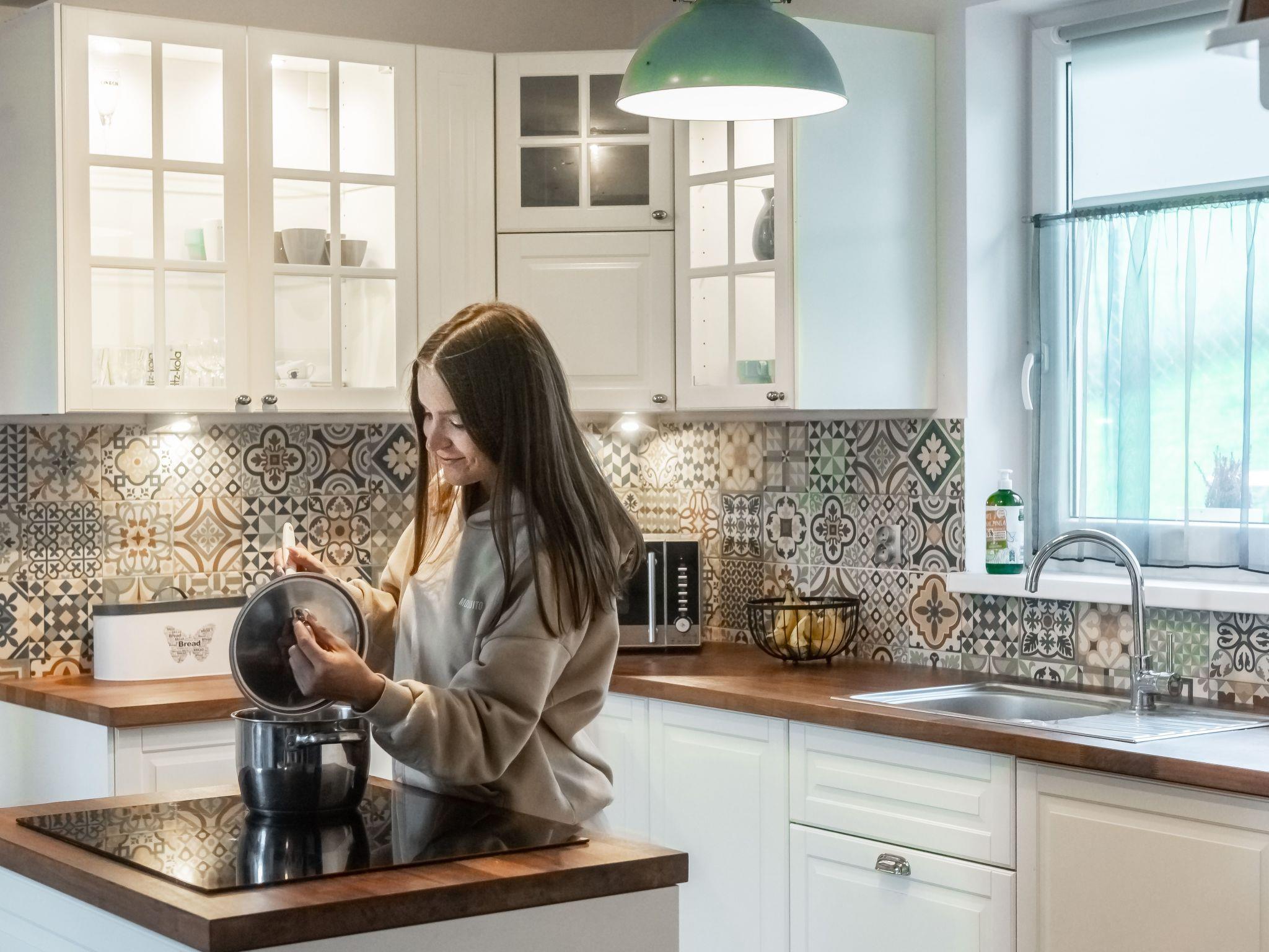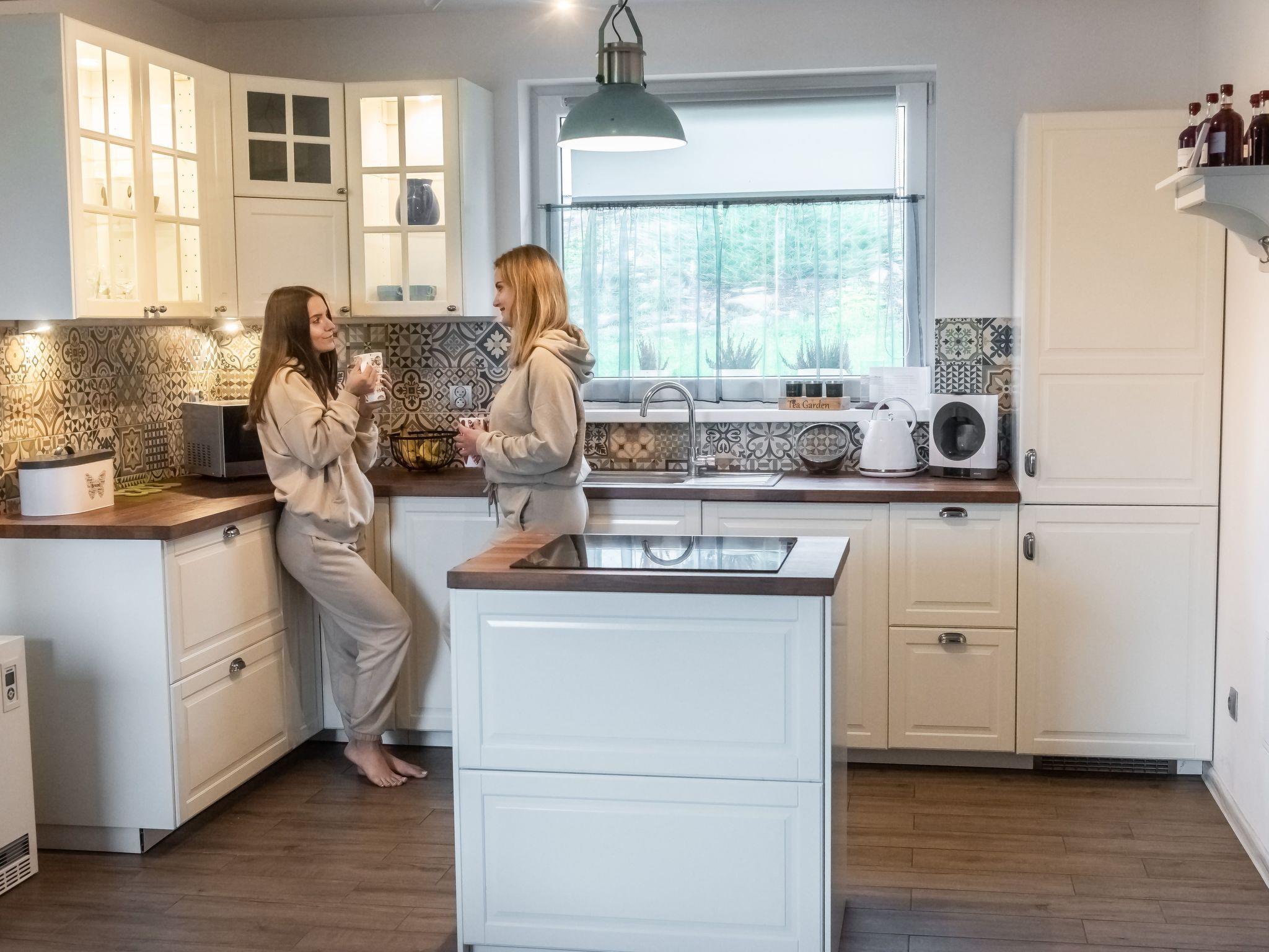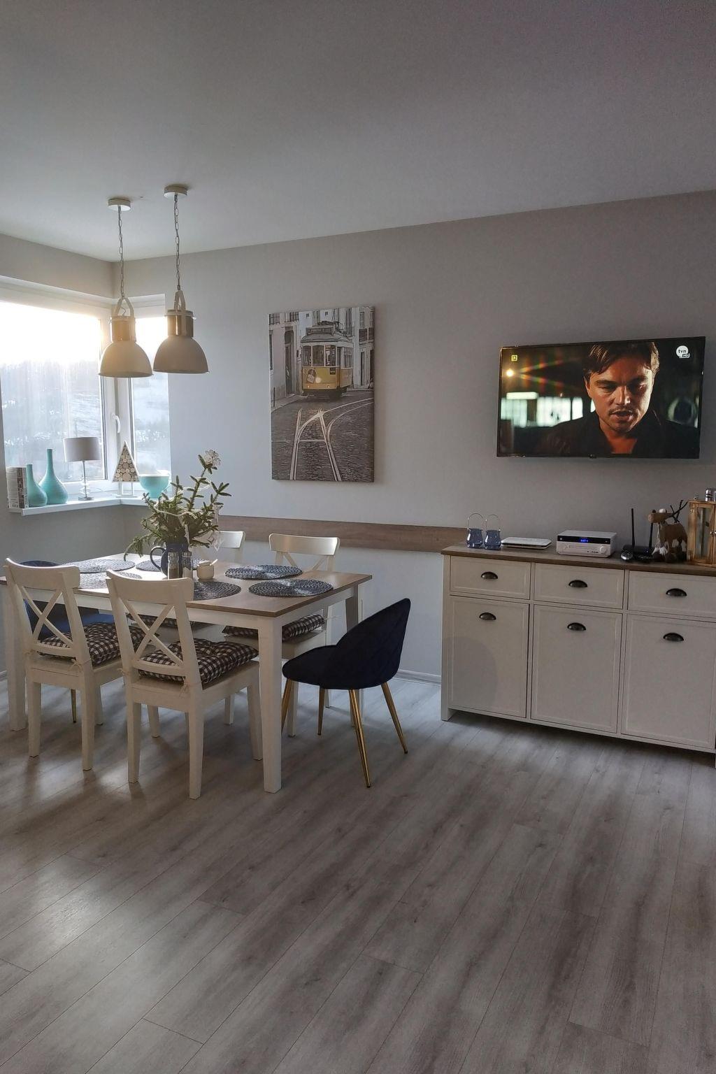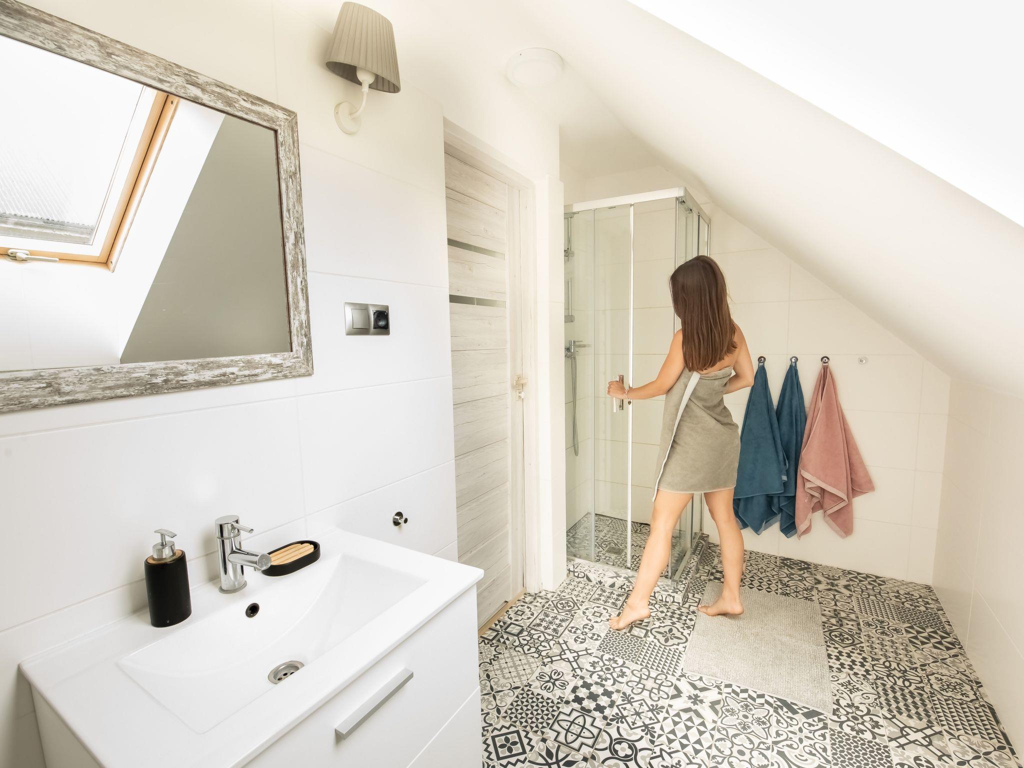 The living space totals 100m², with a modern and fully-equipped kitchen (10m²) on the ground floor, including a fridge with a freezer compartment, a stove, a microwave and a coffee machine. Next to it there is the cosy living room with a large dining table and comfortable chairs. The area with a sofa and fireplace stove occupies around 20m². An LCD TV with 40 international channels provides entertainment. A special stereo system with a CD player rounds off the entertainment programme. One of the bedrooms is on this floor, furnished with a comfortable double bed (180 x 200cm) that can be easily converted into two single beds (each 90cm wide). The bedroom also has a wardrobe, a dresser and two bedside tables. On the ground floor there is also a little bathroom with a WC and shower.