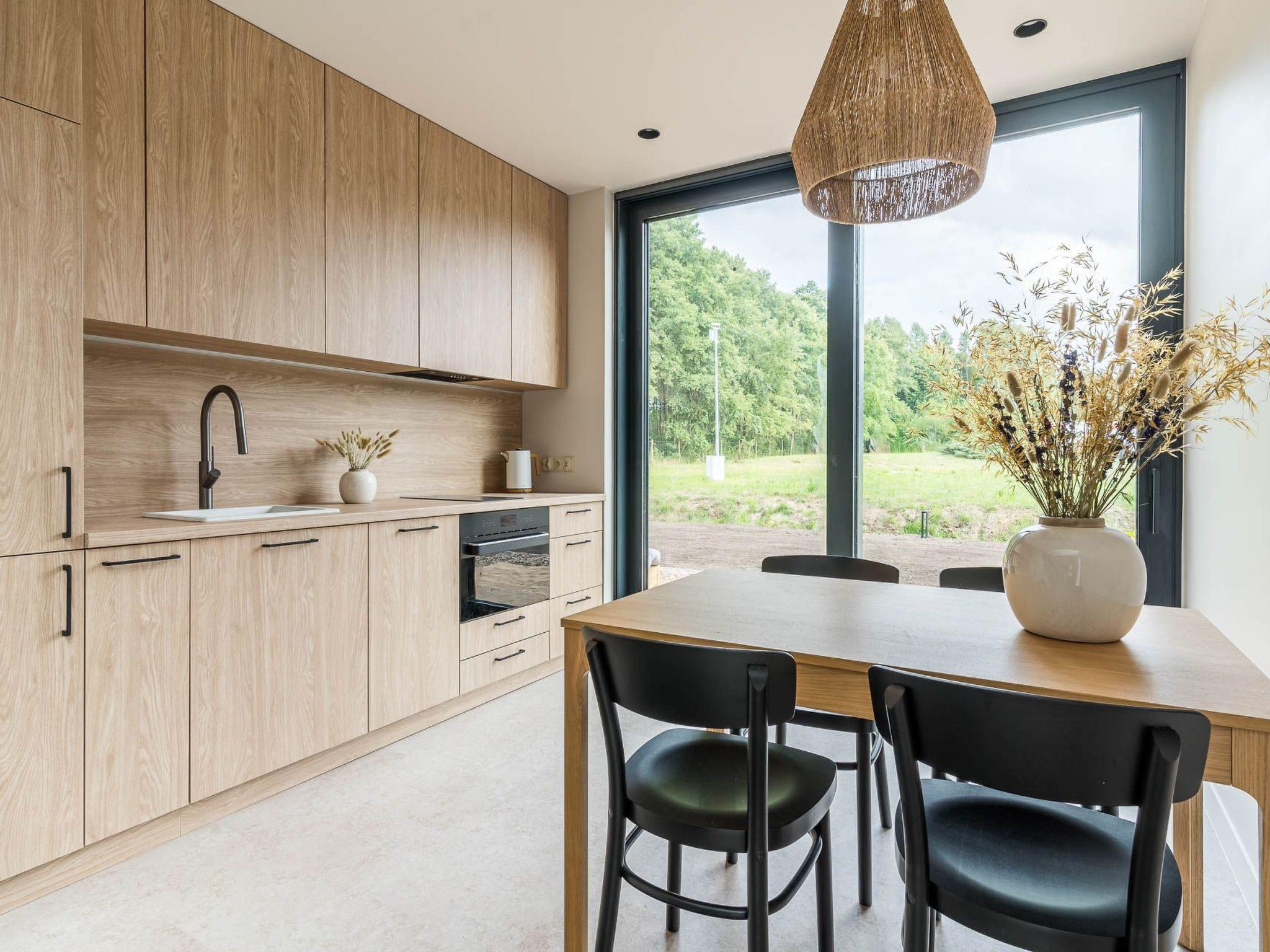 The living room is the lounge area, with the characteristic panoramic window overlooking the forest, a modern, atmospheric fireplace and access to one of the two terraces. A comfortable sofa bed also offers the possibility of an additional 2 sleeping places.