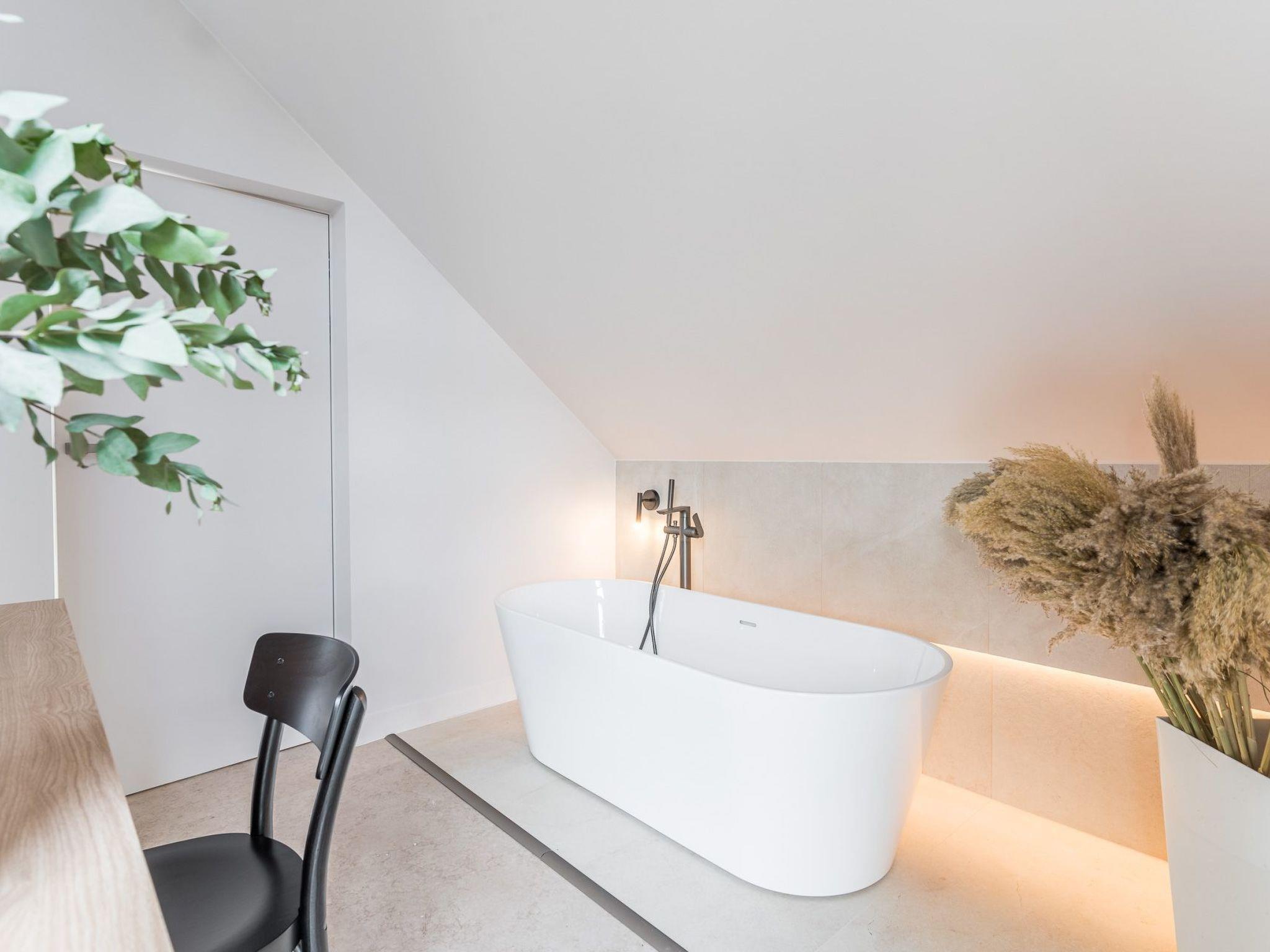 One bedroom is furnished with 2 single beds and a unique openwork relaxation area with a panoramic window facing the forest. The second bedroom, on the other hand, features a large double bed together with a private free-standing bathtub and a dressing table with mirror and a view of the garden and the stream.
