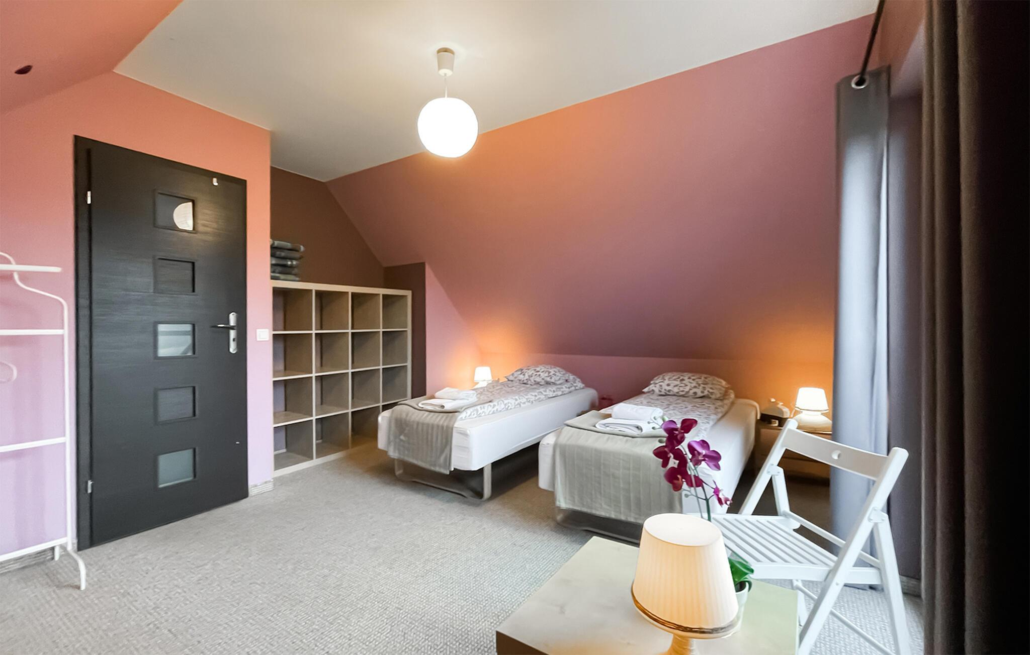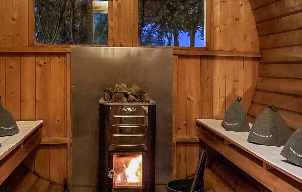 Semesterhuset i Szarejki imponerar med sin smakfulla inredning, som perfekt kombinerar moderna och rustika element. Den rymliga interiören ger dig utrymme att känna dig som hemma, från det mysiga köket till det eleganta sovrummet. Den stora terrassen är särskilt inbjudande: Här kan du börja dagen med en frukost utomhus eller njuta av solnedgången på kvällen. Två hus, som kan bokas tillsammans i mån av tillgång, delar en bastu och två finska träbad på fastigheten, medan en lägereldsplats och spel som bordtennis och volleyboll ger gott om variation.