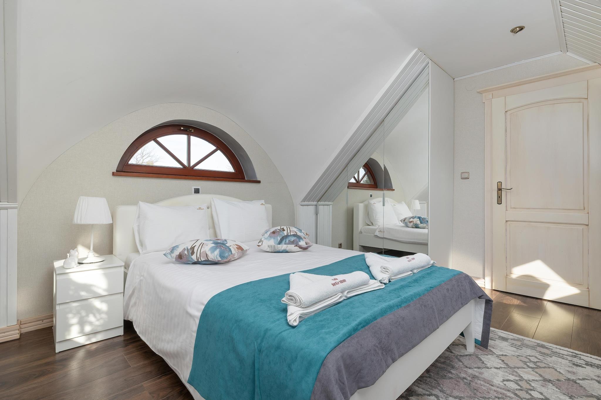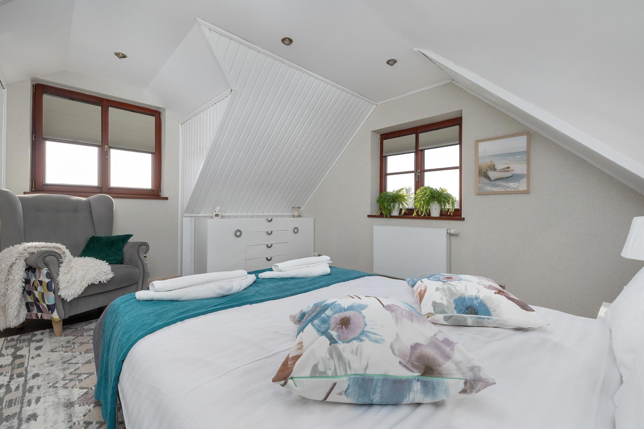 Utmärkt läge, 500 m från stranden, i ett lugnt område, bara 300 m från ett attraktivt poolområde. Ett lyxigt tvåvånings XXL-semesterhus med privat trädgård, där gästerna har exklusiv tillgång till grillplats, trädgårdsmöbler och solstolar. På bottenvåningen finns ett vackert och rymligt vardagsrum (med TV, bäddsoffa och dekorativ öppen spis), ett stort och välutrustat kök med matplats (med stort bord), ett sovrum med dubbelsäng, en klädkammare, ett badrum med dusch och bubbelbadkar samt en separat toalett. På första våningen finns tre separata dubbelrum (varav ett har balkong), en mezzanin med ett litet bibliotek och ett skrivbord samt en toalett (med tvättmaskin och torktumlare). Huset har en stor, täckt terrass. Centralvärme (golvvärme på bottenvåningen) och trådlöst internet finns tillgängligt. Semesterhuset ligger i en liten semesteranläggning, men har en separat, privat, inhägnad trädgård. Den gemensamma tomten, tillgänglig för alla gäster, inkluderar en lekplats, ett trädgårdslusthus och cykeluthyrning. Säker parkering finns tillgänglig. Hyran inkluderar sängkläder, handdukar, vattenförbrukning, uppvärmning, internet och parkering. Spjälsäng och barnstol finns tillgängliga på begäran. Ustronie Morskie ligger i Vorpommern, 10 km öster om Kolobrzeg. En ren sandstrand, en promenadbrygga, en kustatmosfär och en pittoresk klippa är fördelarna med denna resort. Den internationella cykelleden R-10 går genom Ustronie Morskie, vilket gör det till ett enkelt och trevligt sätt att cykla till Kolobrzeg. Längs vägen passerar du Sianozety, en liten sommarort. Om du reser i motsatt riktning (österut) kan du besöka Gaski (en fyr), Sarbinowo och till och med Mielno, belägen på en udde mellan Östersjön och sjön Jamno.