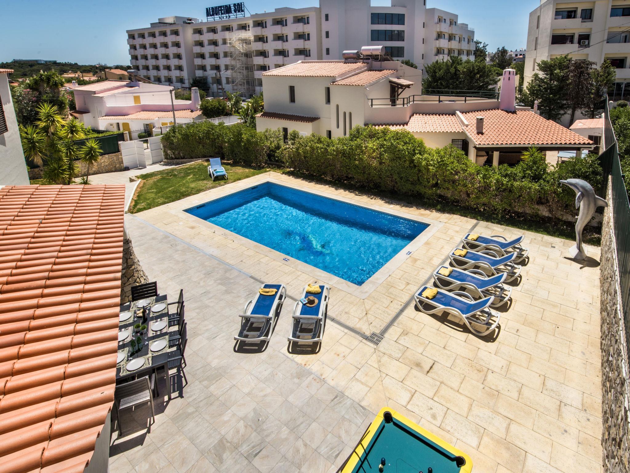 Very cosy, comfortable villa "Corcovada V4". In the resort 2.8 km from the centre of Old Town of Albufeira, 1.2 km from the sea. Private: swimming pool angular, heated (4 x 8 m, depth 90 - 200 cm, seasonal availability: 01.Jan. - 31.Dec.). Outdoor shower. In the house: WiFi, billiard table, table football, air conditioning, washing machine. Parking at the house. Shop 800 m, grocery 400 m, supermarket 200 m, shopping centre 1.9 km, restaurant 190 m, bar 700 m, bakery, café 400 m, bicycle rental 3.4 km, bus stop 290 m, railway station 5.6 km, sandy beach "Praia da Oura" 1.4 km, diving center 6.2 km. Marina 5.3 km, golf course (18 hole) 2.2 km, surf school 10.8 km, sailing school 16 km, minigolf 1.6 km, riding stable 11.1 km, children's playground 2 km. Nearby attractions: Adventure Mini Golf Park 1.6 km, Zebra Safari Tours 1 km, Electric Karting Albufeira Marina Albuf 6.3 km, Algarve Shopping in Guia 10.2 km, Zoomarine 11.7 km, Faro Airport 39 km. Well-known lakes can easily be reached: Lagoa dos Salgados 14.1 km. Young groups under 25 y.o. will be charged an extra deposit per person on spot. The pool heating service (20ºC-22ºC) must be informed to the KH one week before of your arrival.