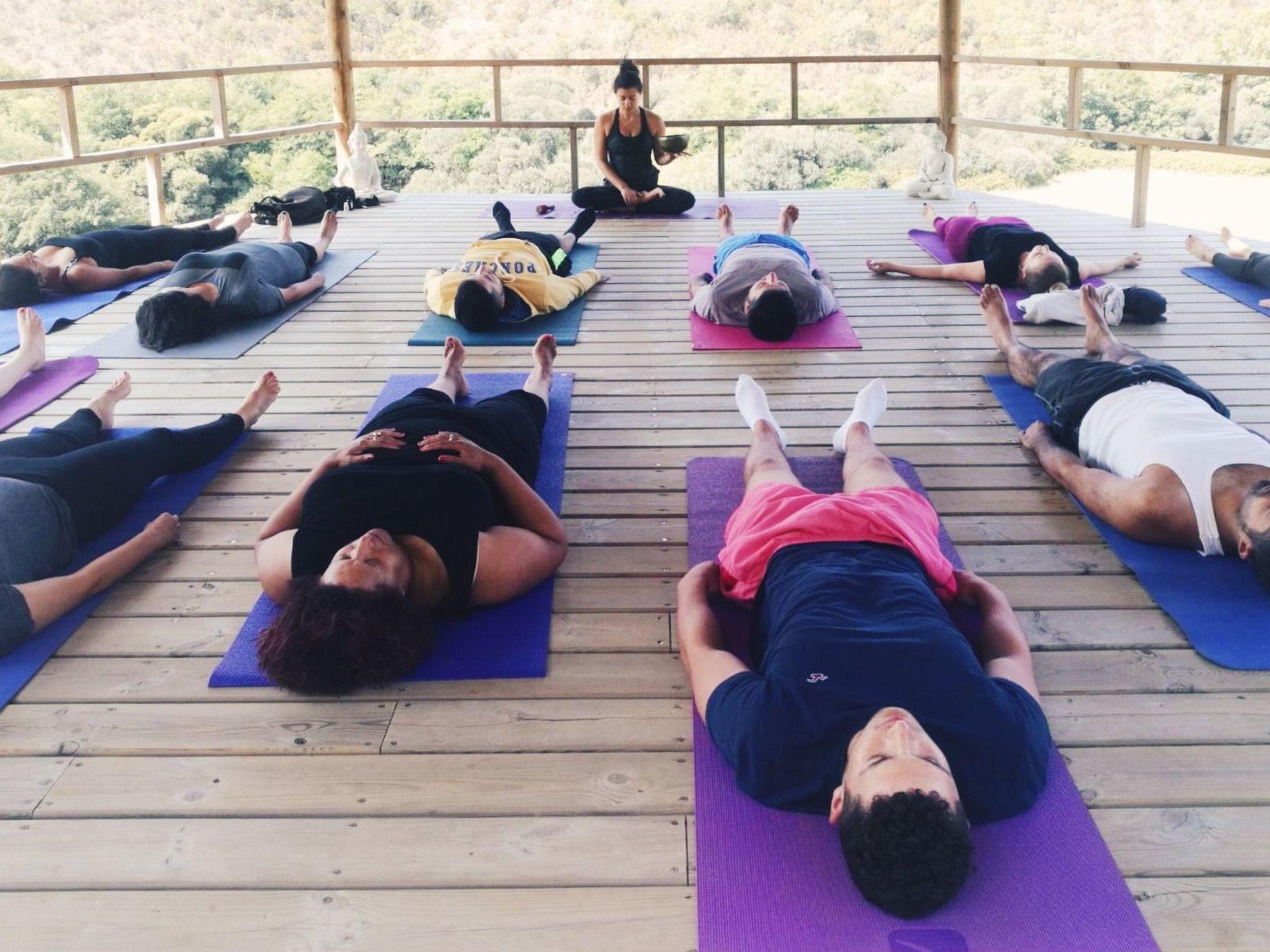 with outside shower and plenty of space for lounging, sitting, or doing yoga.