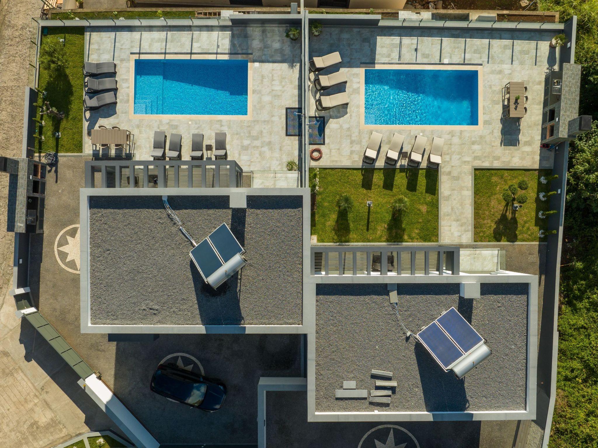 This beautiful kouse air-conditioned 3-bedrooms Villa has all the features to make it the perfect holiday villa, wirth an inside/out living area that with the solarium, pool and barbecue creates a wonderful social area with loads of natural light and an extremely high quality.The living area is totally open plan and comprises a seating area with flat-screen cable TV, dining table and a fully equipped kitchen. An adjoining shower room can be found off the living area, as can a laundry room.Upstairs, there are two bedrooms with king-sized double beds and en-suite shower rooms and sea-view, with the front balcony. The third bedroom have two single beds and share the family shower room.