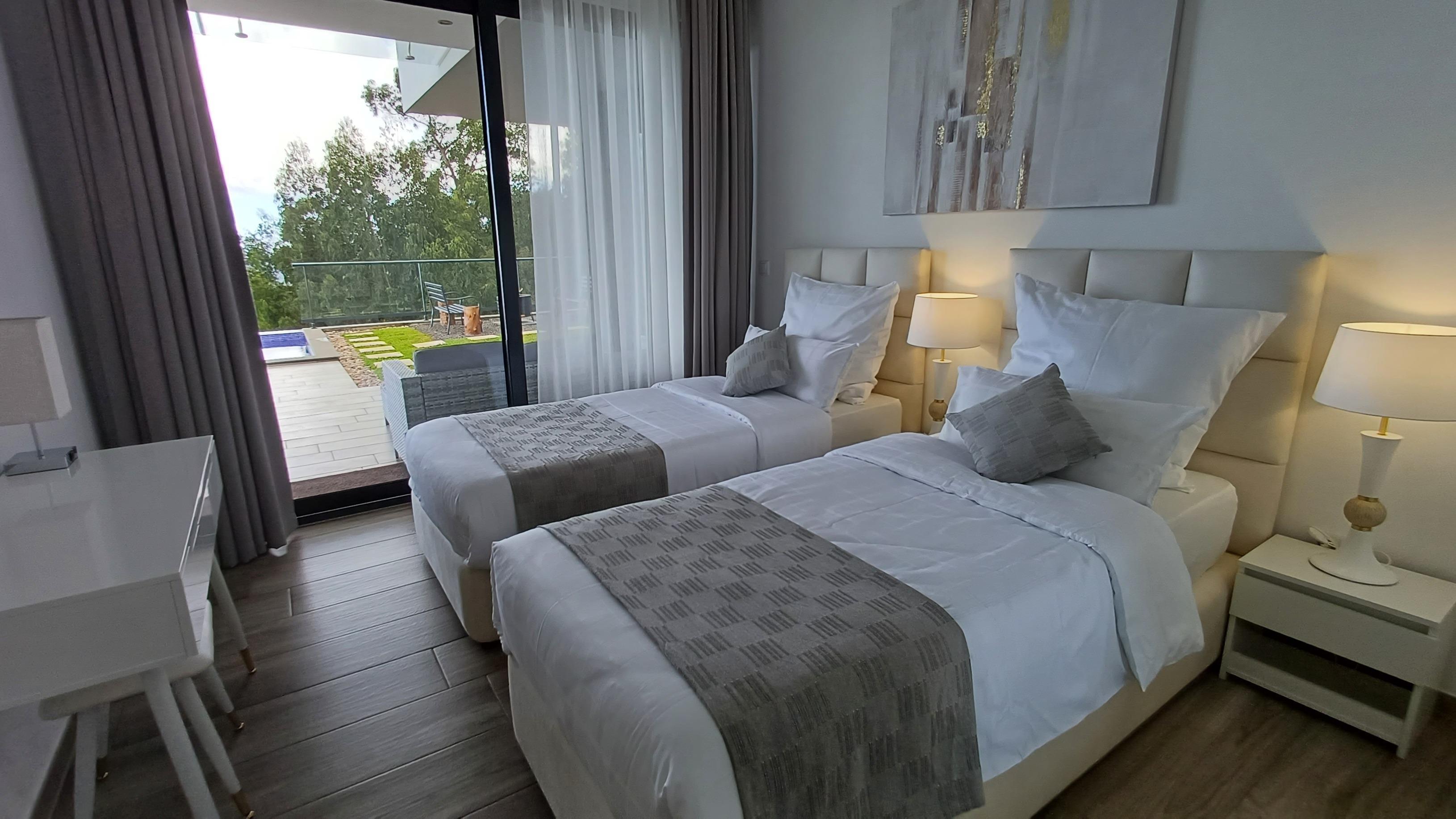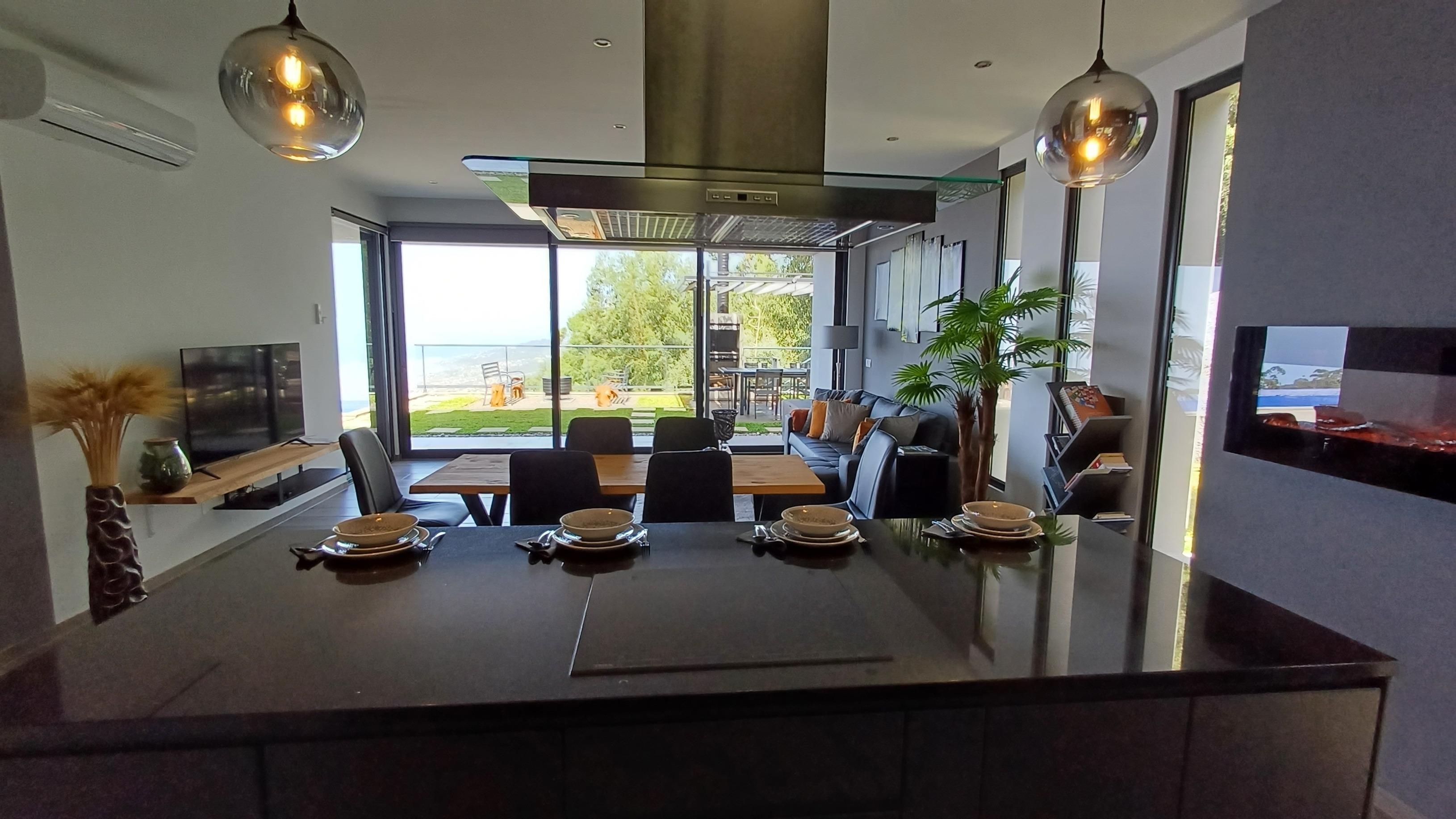 Neubau über den Dächern von Calheta in Mitten des örtlichen Eukalyptuswaldes. Genießen Sie die traumhafte Aussicht, egal ob im beheizbaren Pool, an der Feuerstelle oder beim Grillen. Die Außenanlagen und großzügige Terrasse lässt keine Wünsche offen.