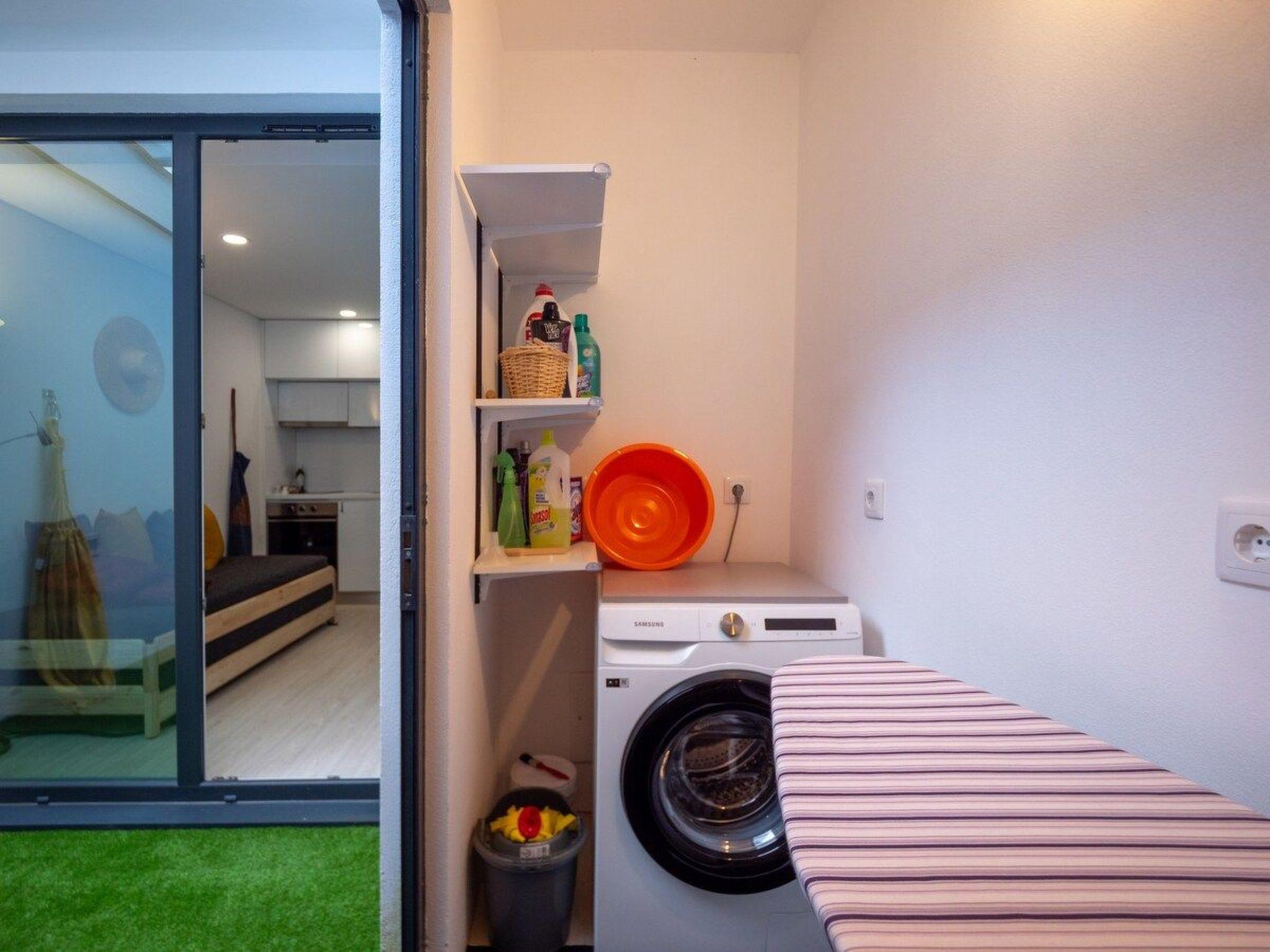 There is a full bathroom, a built-in wardrobe and a storage room where suitcases can be stored. There is also a laundry room with a washing machine and tumble dryer.