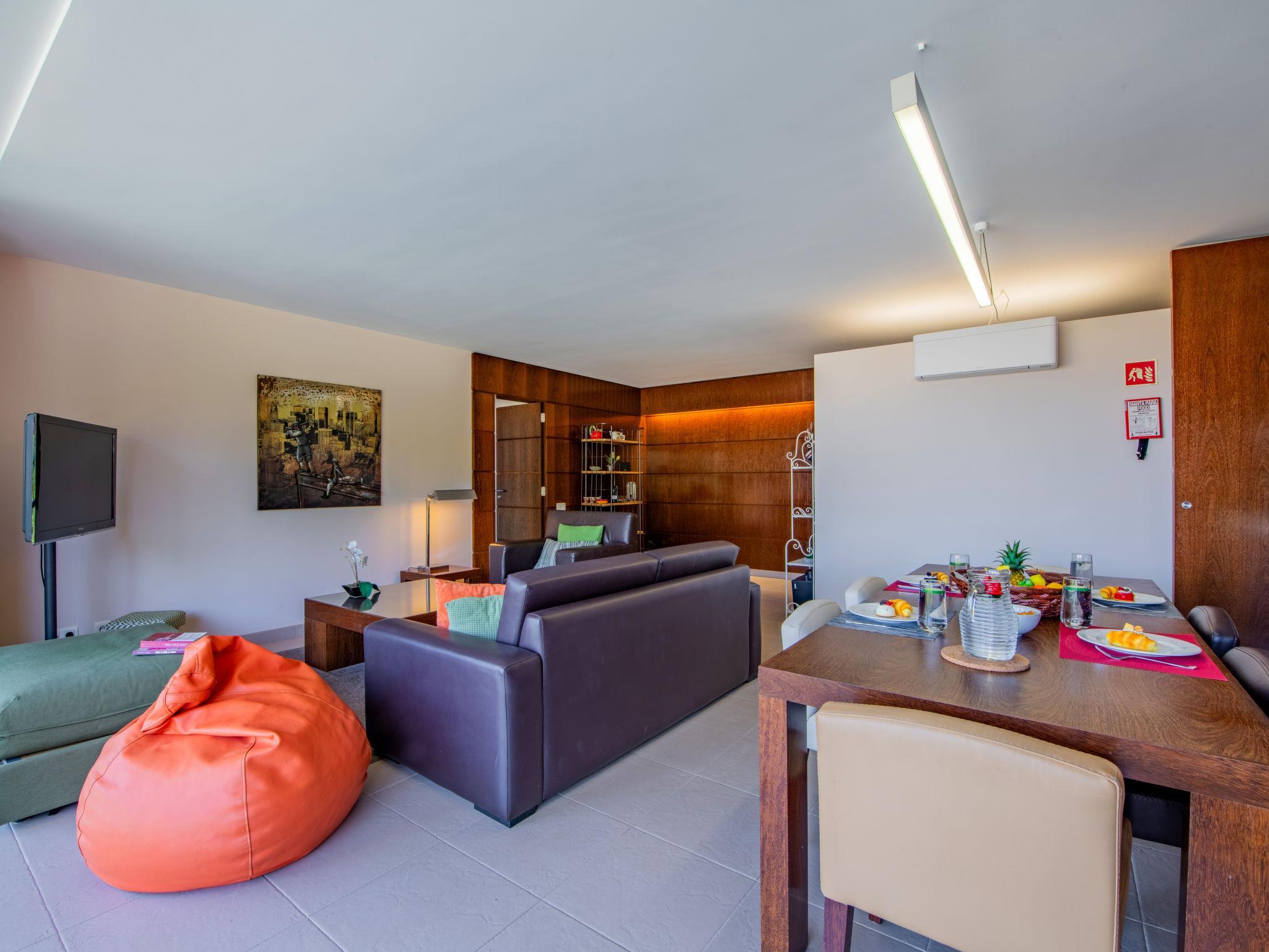 "Algarve Golf & Golden Coast", 3-room apartment 102 m2. Spacious and bright, practical and cosy furnishings: open living/dining room with TV, international TV channels, flat screen, air conditioning and forced-air heating. Exit to the terrace. 1 room with 1 double bed (180 cm, length 200 cm), bath/WC, air conditioning and forced-air heating. Exit to the terrace. 1 room with 2 beds (90 cm, length 190 cm), air conditioning and forced-air heating. Exit to the balcony. Open kitchen (oven, dishwasher, 4 ceramic glass hob hotplates, toaster, kettle, microwave, freezer, electric coffee machine) with air conditioning and forced-air heating. Exit to the terrace. Bath/WC, sep. WC. Large terrace. Terrace furniture. Facilities: washing machine, iron, children's high chair, baby cot for up to 2 year olds, hair dryer. Internet (WiFi, free). Parking space n 5A0A (roofed). Please note: suitable for families. Non-smokers only. Fire extinguisher. 72957/AL