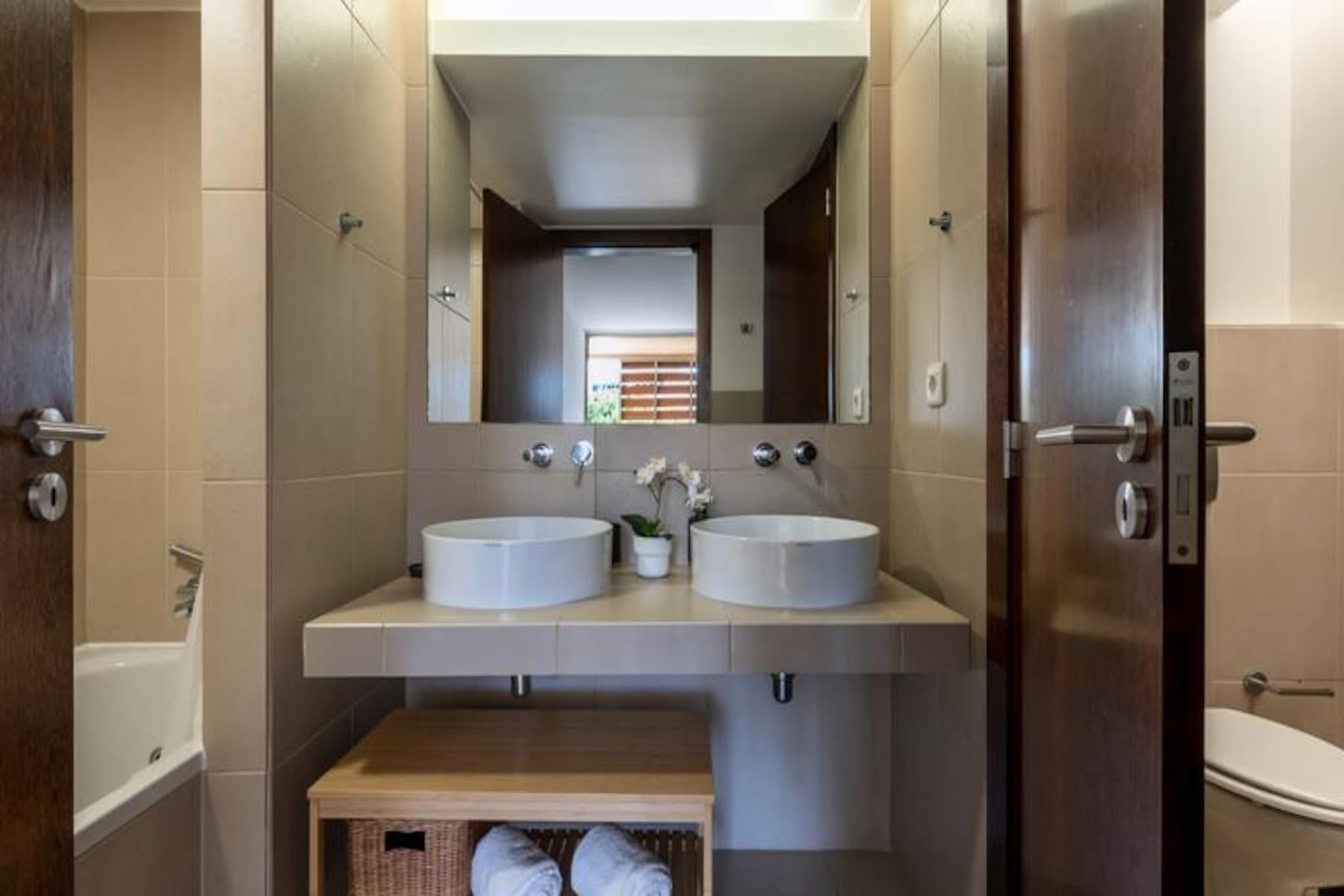 Väck dina sinnen i hjärtat av Guia, en charmig by i Algarve där tradition möter kustnära lockelse. Denna förtjusande lägenhet med 2 sovrum erbjuder en lugn tillflyktsort bara några minuter från Albufeiras gyllene stränder och det glittrande Atlanten. Oavsett om du är här för att utforska regionens rika kultur eller bara varva ner vid vattnet, lovar denna fastighet en minnesvärd vistelse. Stig in för att upptäcka ett ljust och luftigt vardagsrum, noggrant utformat för komfort och avkoppling. Det stora sovrummet har en lyxig king size-säng och ett eget badrum, medan det andra sovrummet har två mysiga enkelsängar. Vardagsrummet erbjuder ytterligare sovplatser med två utdragbara enkelsängar, vilket gör lägenheten idealisk för familjer eller grupper på upp till sex personer. Stora skjutdörrar öppnar sig mot en privat balkong i österläge, perfekt för att njuta av ditt morgonkaffe eller en lugn kväll under stjärnorna. Det fullt utrustade köket och matplatsen inbjuder dig att laga och njuta av läckra måltider tillsammans. Gästerna har tillgång till en uppfriskande gemensam pool, en höjdpunkt i bostaden som ger en touch av lyx till din vistelse. Utöver lägenheten erbjuder Guia en mängd attraktioner. Byn är känd som födelseplatsen för den berömda piri-piri-kycklingen och är en fristad för matälskare, med många restauranger som serverar autentisk portugisisk mat. Naturentusiaster kommer att uppskatta de natursköna stigarna och vingårdarna som omger området, medan familjer kan njuta av en dag på den närliggande vattenparken Zoomarine. För shopping och nöjen ligger Algarve Shopping Mall bara en kort bilresa bort. Med sin blandning av komfort, bekvämlighet och närhet till både naturlig skönhet och kulturella landmärken är denna lägenhet den perfekta basen för ditt Algarve-äventyr. Oavsett om du utforskar den pulserande staden Albufeira, kopplar av på orörda stränder eller upptäcker de dolda pärlorna i södra Portugal, erbjuder Guia en lugn men ändå sammanhängande miljö för en oförglömlig semester.