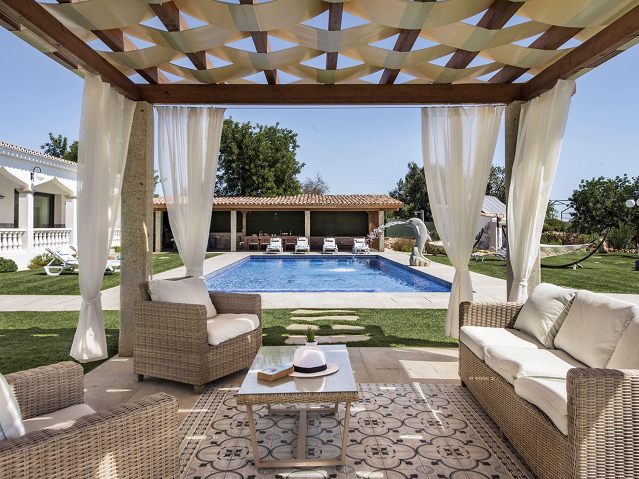"Flor de Lis", 5-room villa 250 m2. Very tasteful and cosy furnishings: living/dining room with open-hearth fireplace (only for decoration), cable TV, international TV channels, flat screen, air conditioning and forced-air heating. Exit to the patio. 2 rooms, each room with 1 french bed (140 cm, length 200 cm), shower/WC, air conditioning and forced-air heating. 1 room with 1 french bed (140 cm, length 200 cm), bath/shower/WC, air conditioning and forced-air heating. Exit to the terrace, to the swimming pool. 1 room with 1 french bed (140 cm, length 200 cm), shower/WC, air conditioning and forced-air heating. Open kitchen (oven, dishwasher, 4 ceramic glass hob hotplates, toaster, kettle, microwave, freezer, electric coffee machine, cooking island). Shower/WC. Air-conditioning. Terrace furniture, barbecue, deck chairs (8). Very beautiful view of the countryside. Facilities: washing machine, iron, children's high chair, baby cot for up to 2 year olds (extra), hair dryer. Internet (WiFi, free). Parking at the house. Please note: suitable for families. Fire extinguisher. 158182/AL